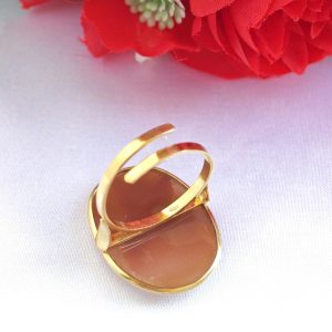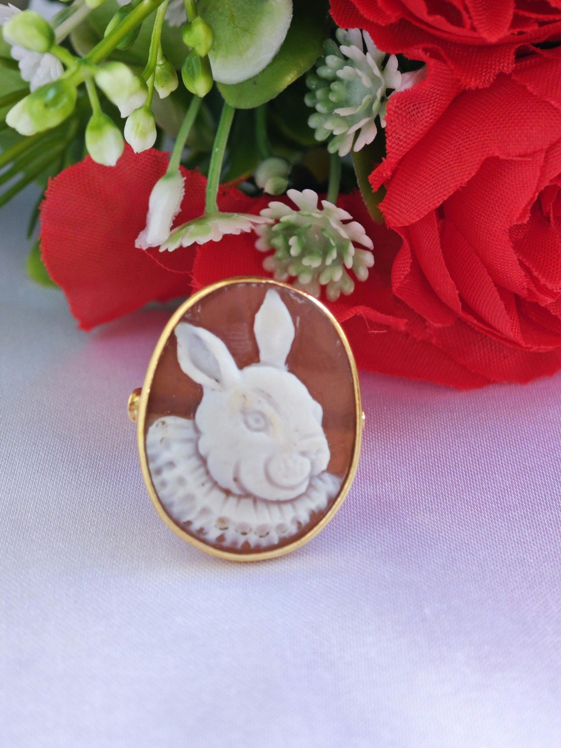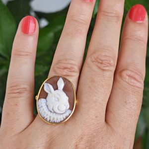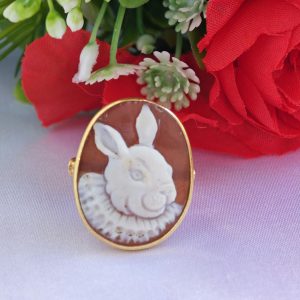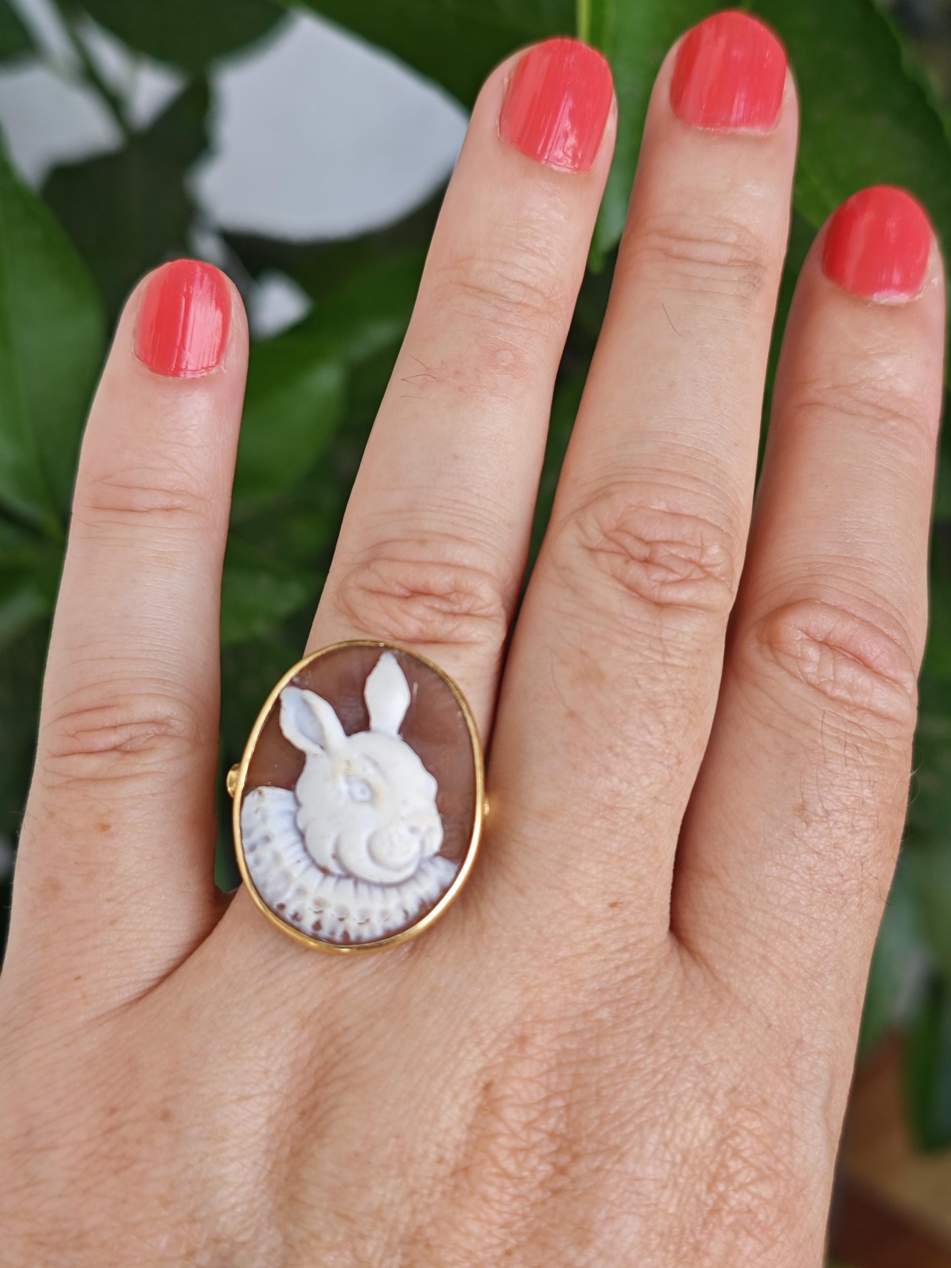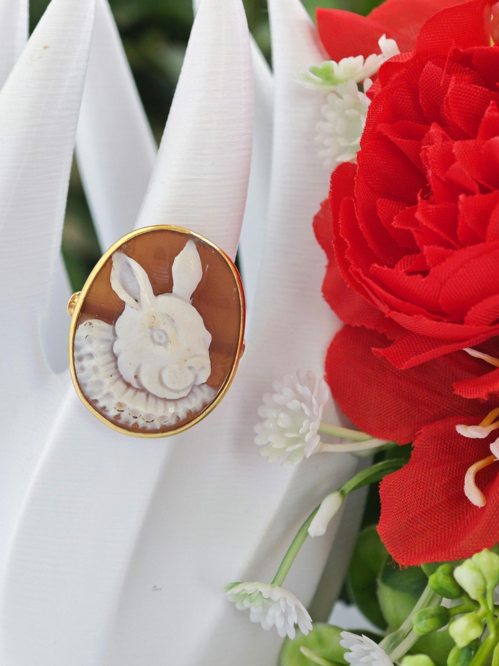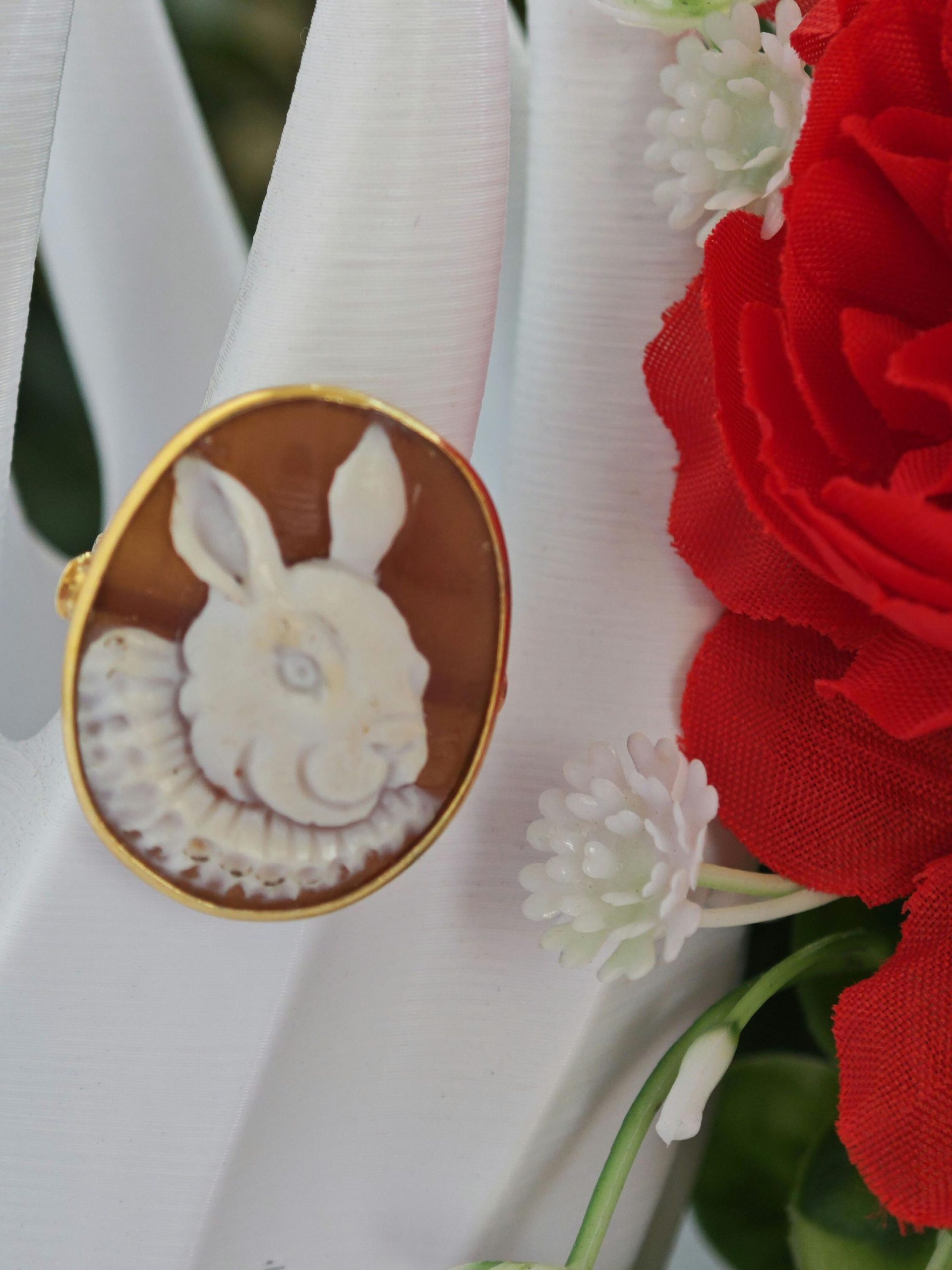 Anello artigianale Mr. Rabbit in argento 925 placcato oro , con cammeo autentico realizzato a mano in conchiglia sardonica a Torre del greco , 25×20 mm dimensioni.