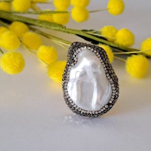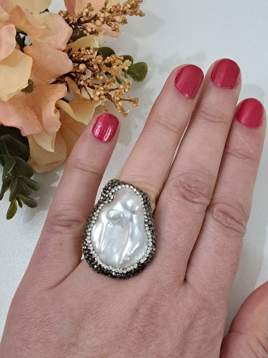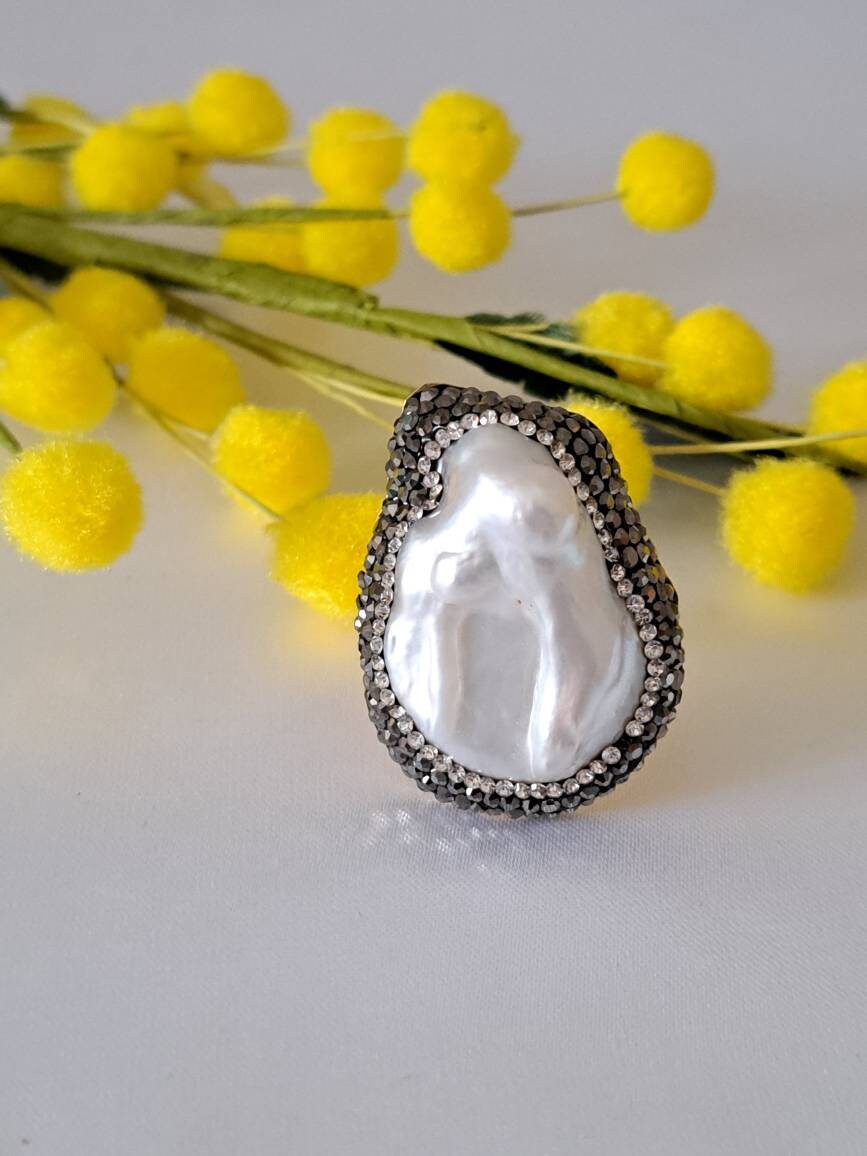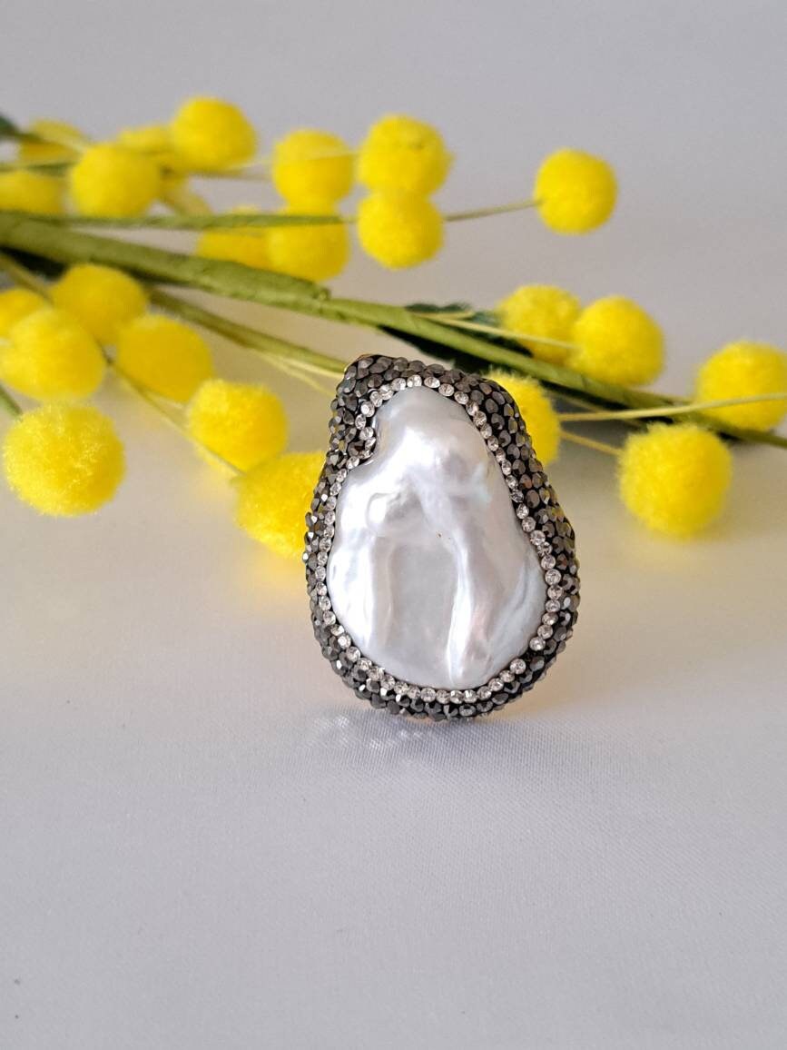 Anello perla bianca barocca, cristalli marcasite e ottone, anello maxi