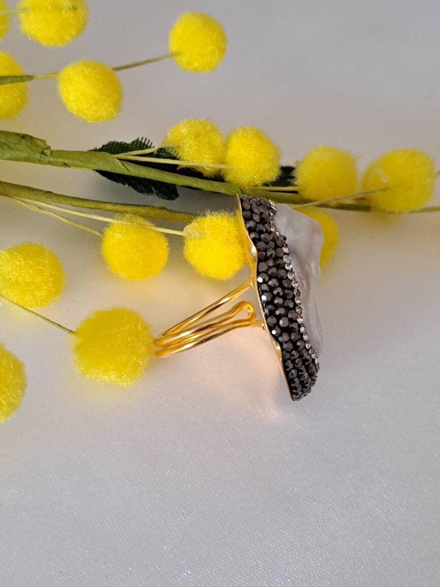 Anello maxi in ottone dorato con perla bianca barocca naturale grande 3,5×2,5 cm dimensioni con cornice cristalli marcasite imitazione .