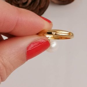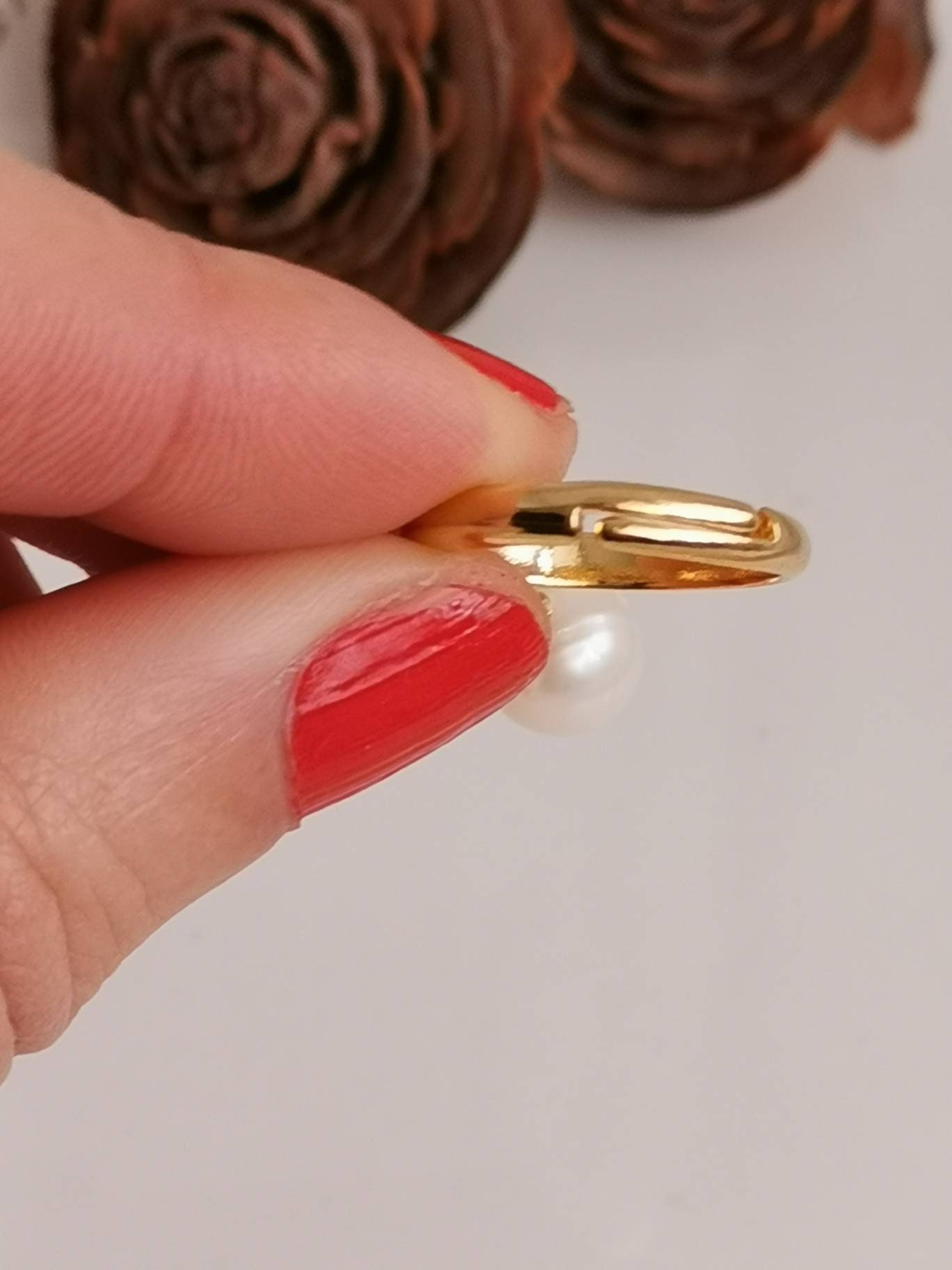 Anello artigianale minimal in ottone italiano con perla naturale bianca 7 mm/nera 5 mm