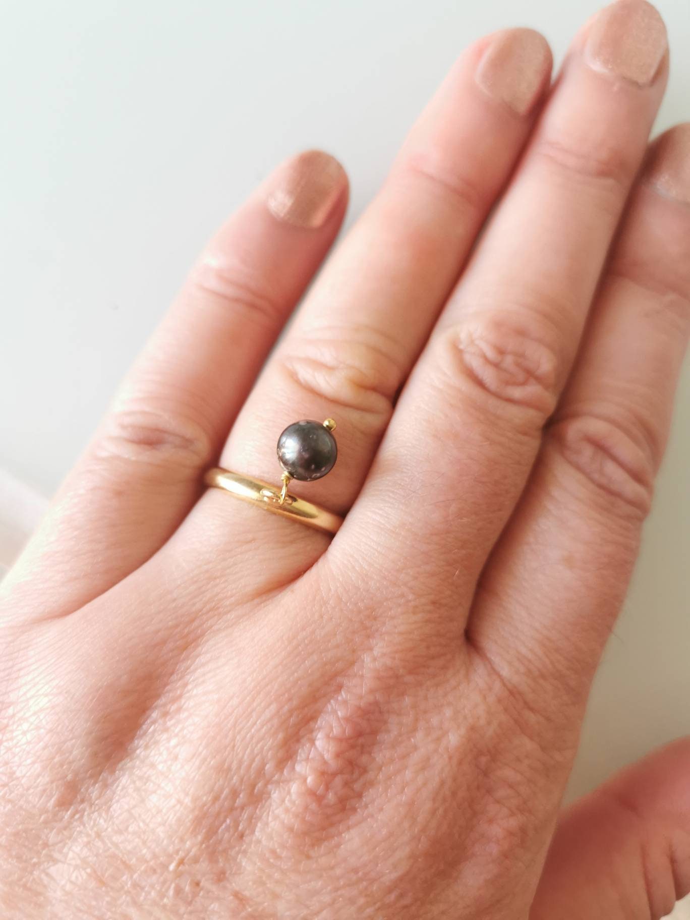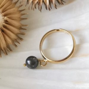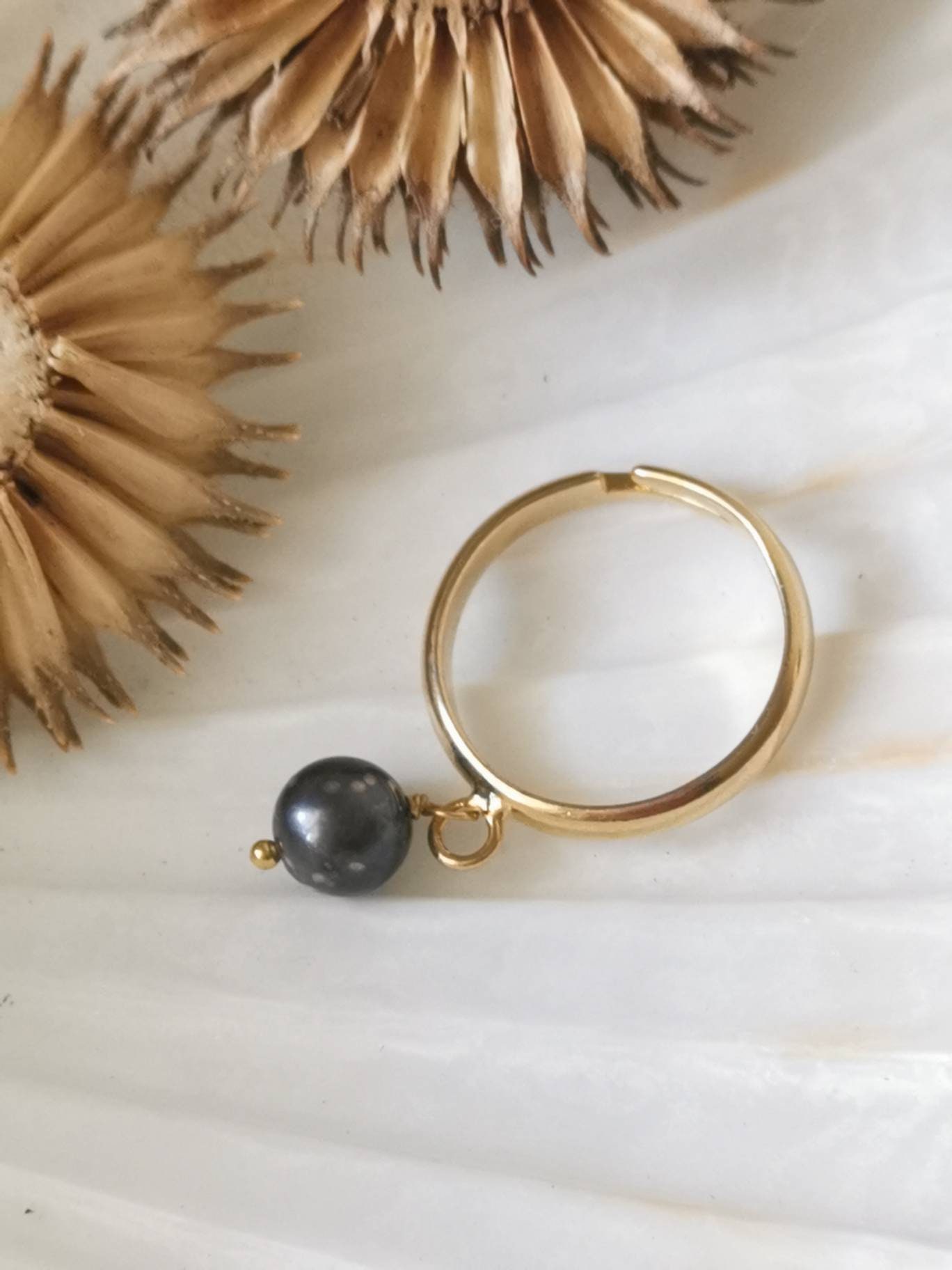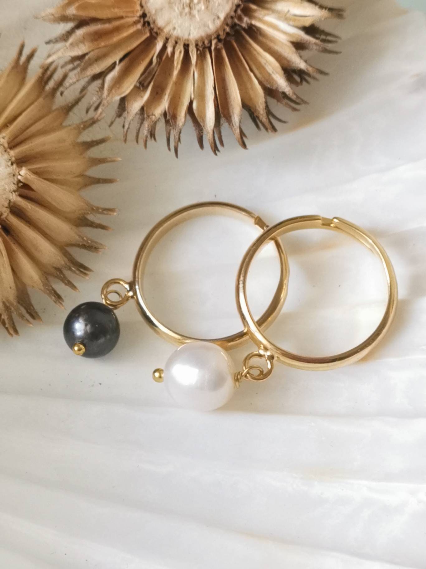 Anello perla bianca e nera in ottone dorato , anello artigianale