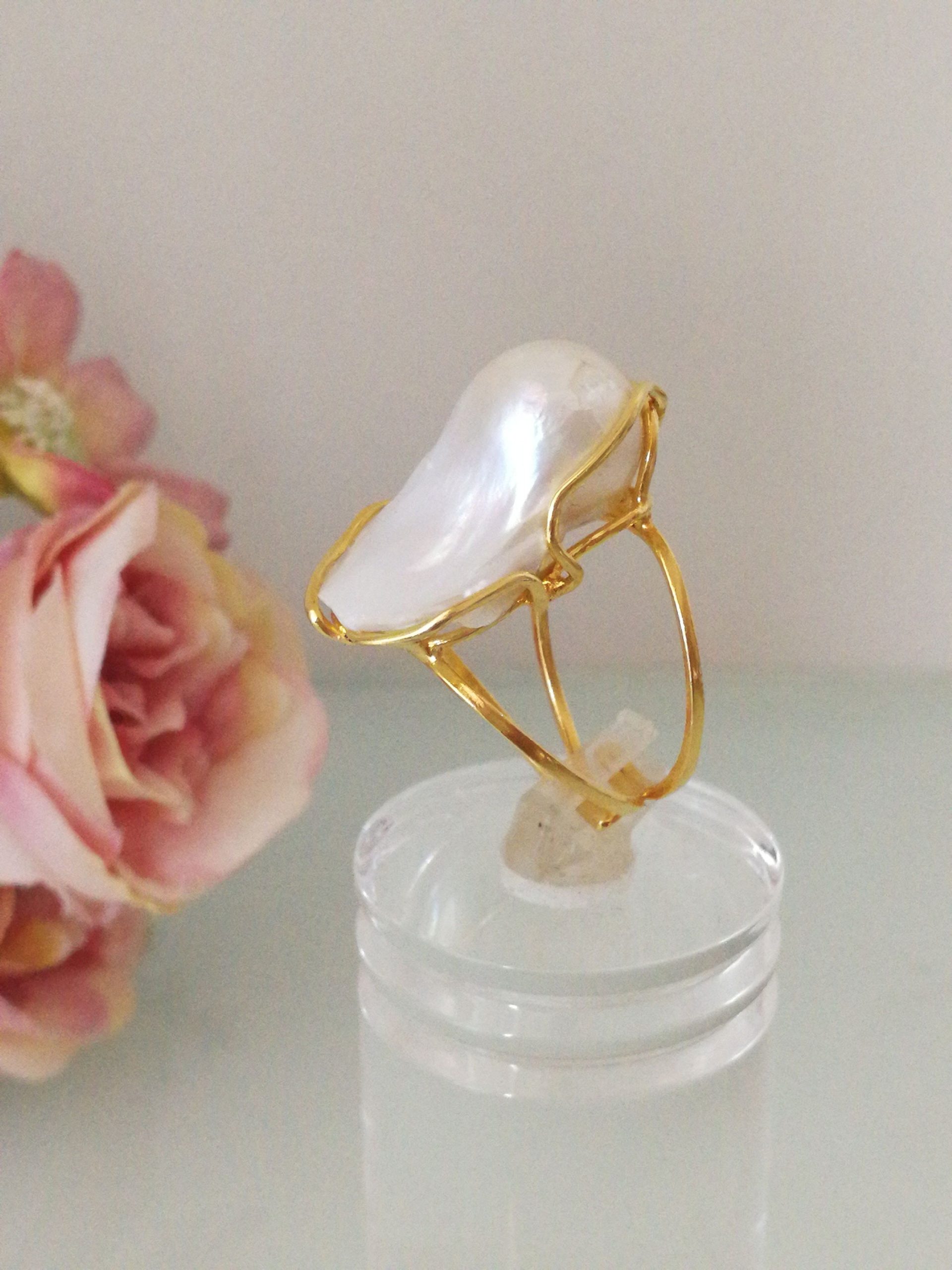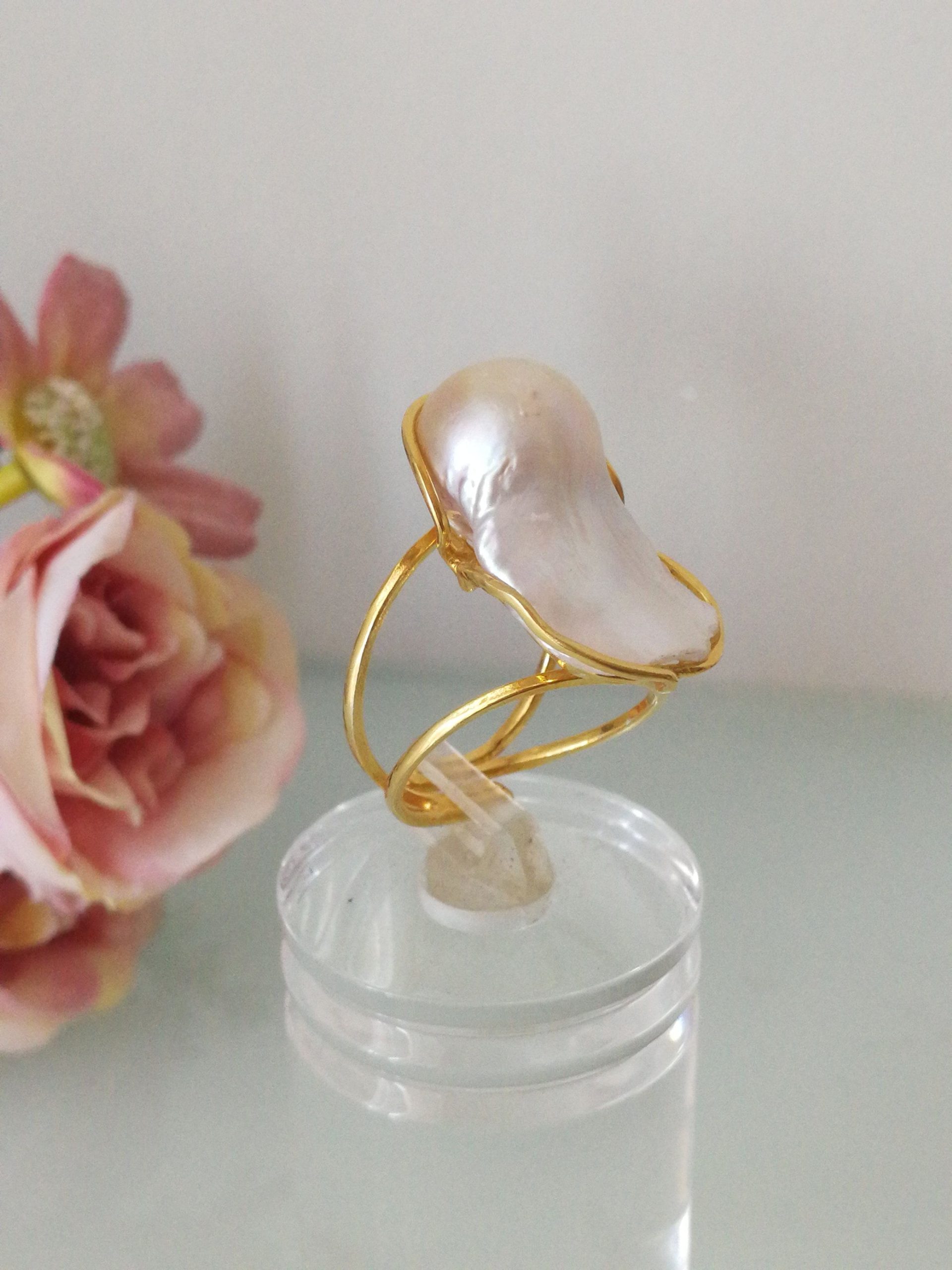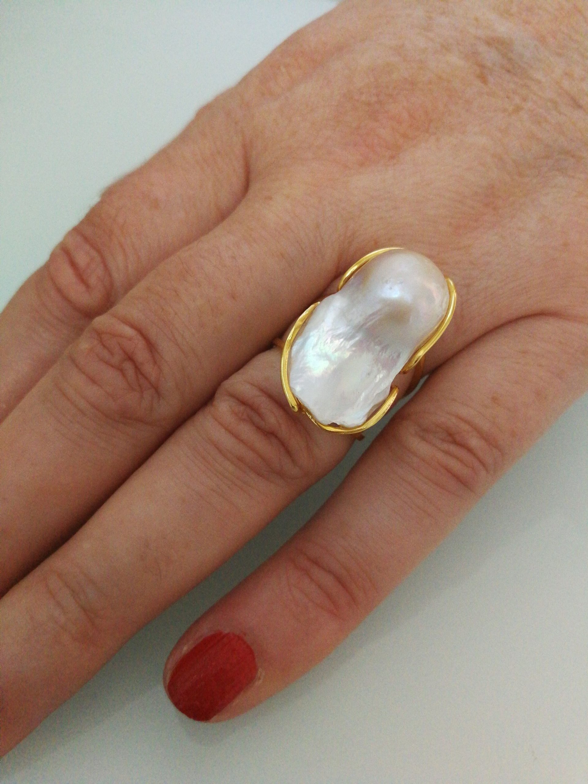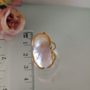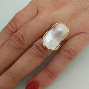 Anello elegante in stile Liberty con perla naturale barocca bianca máxi incastonata su montatura in argento placcata oro. Misura perla 3 cm .Misura anello regolabile.