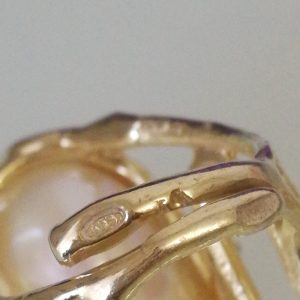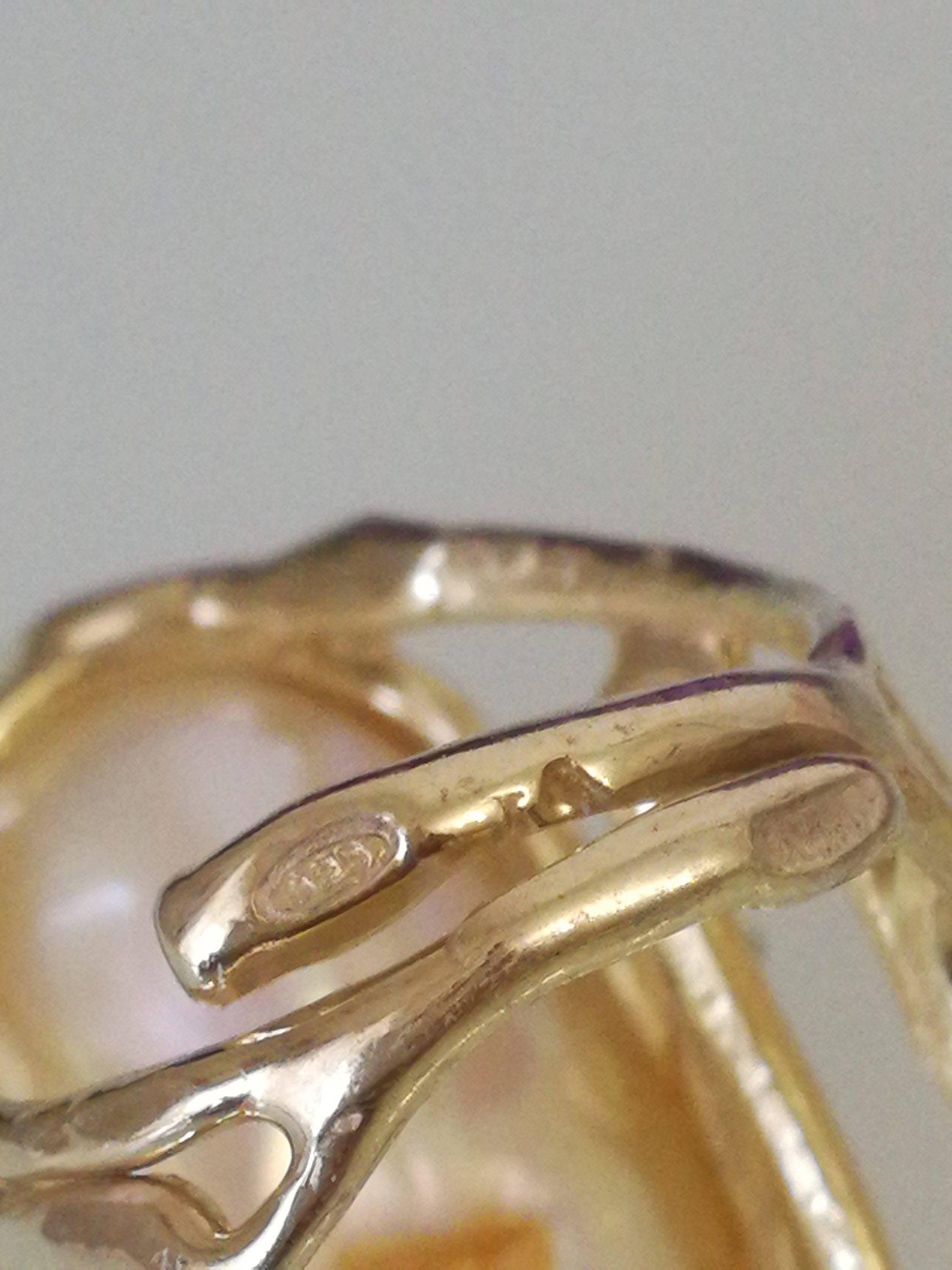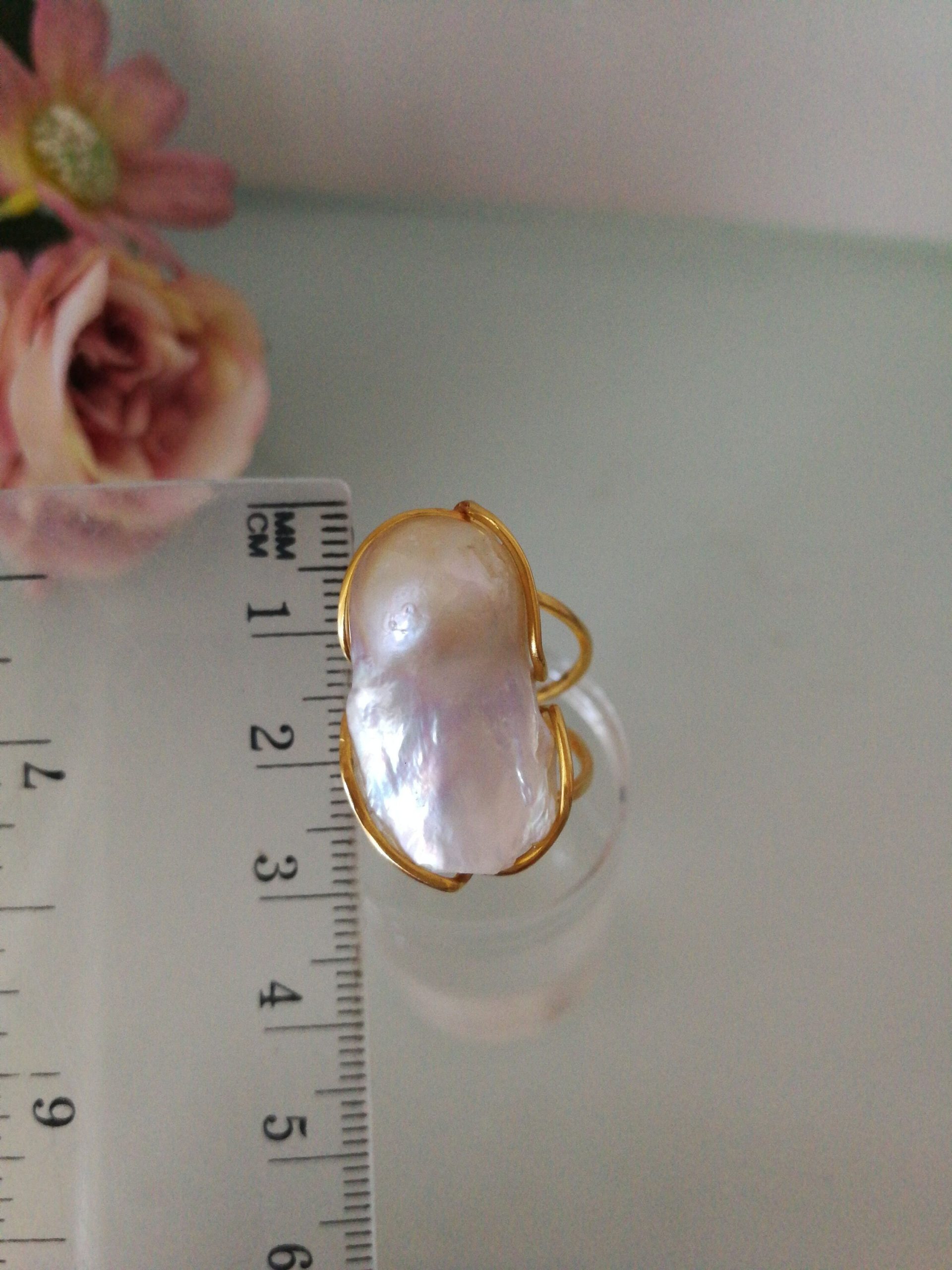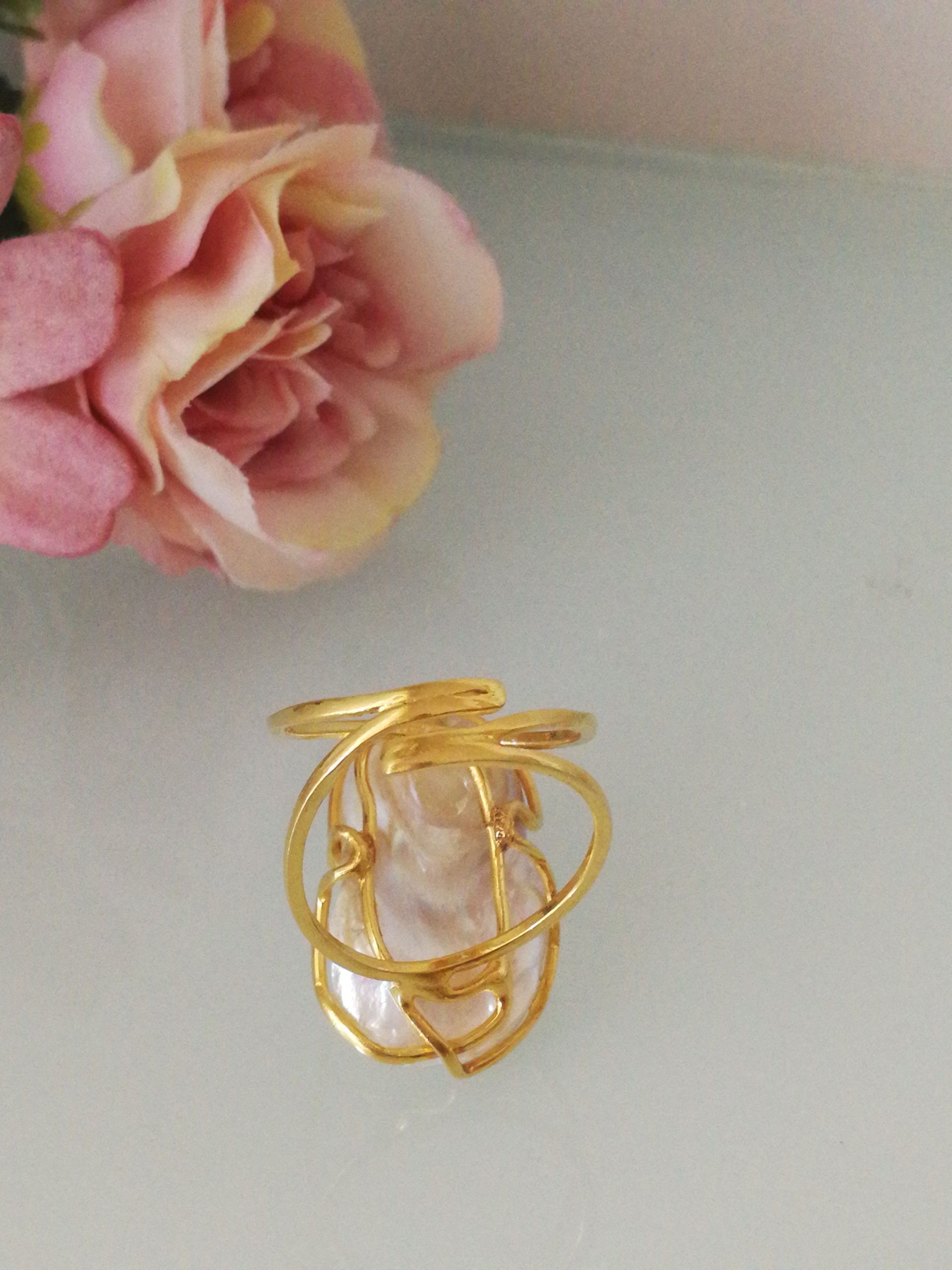 Anello elegante in stile Liberty con perla naturale barocca bianca máxi incastonata su montatura in argento placcata oro. Misura perla 3 cm .Misura anello regolabile.