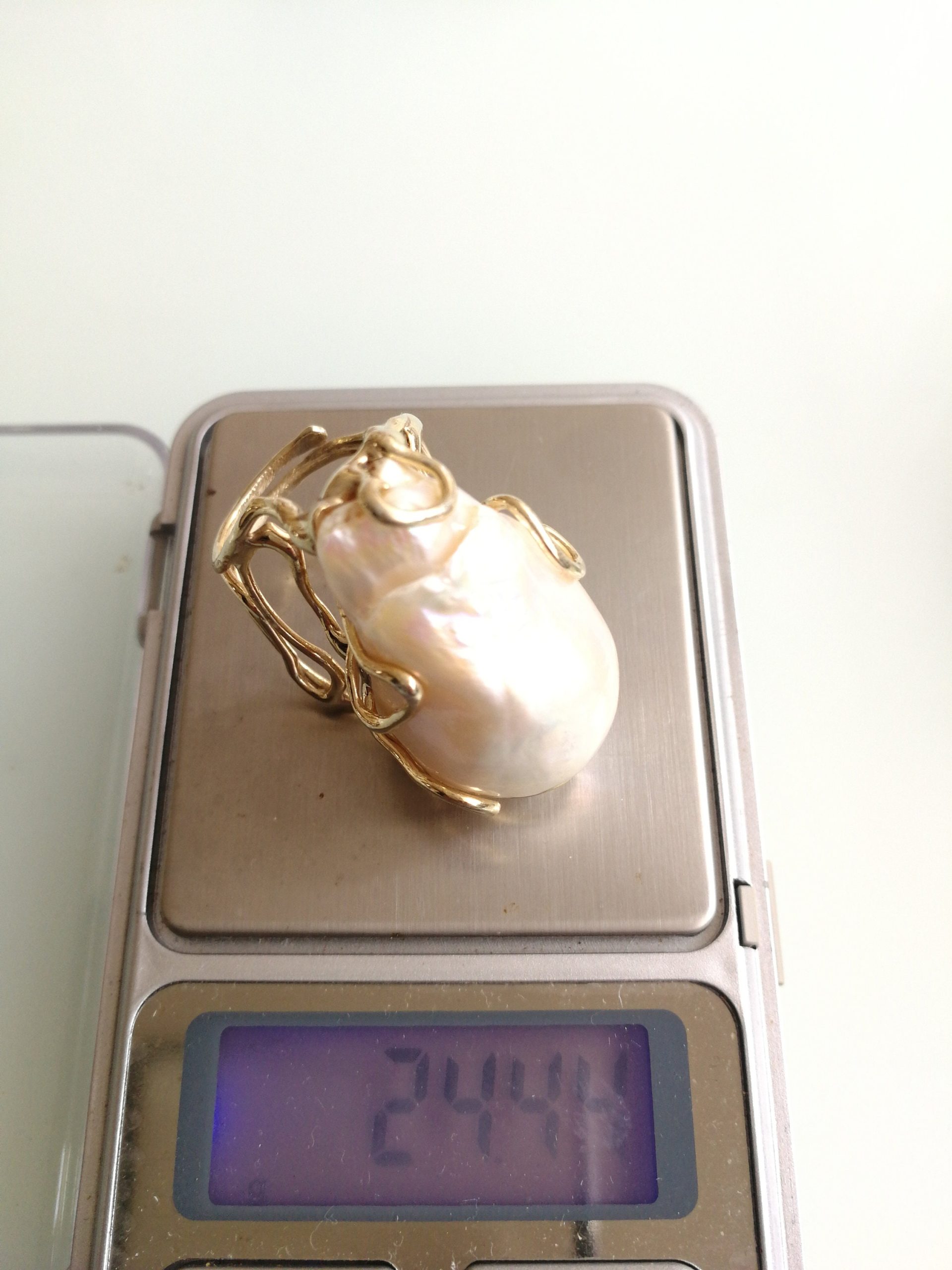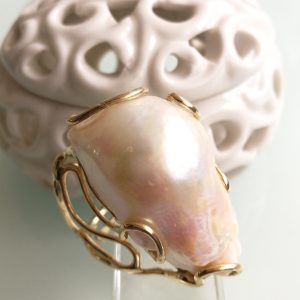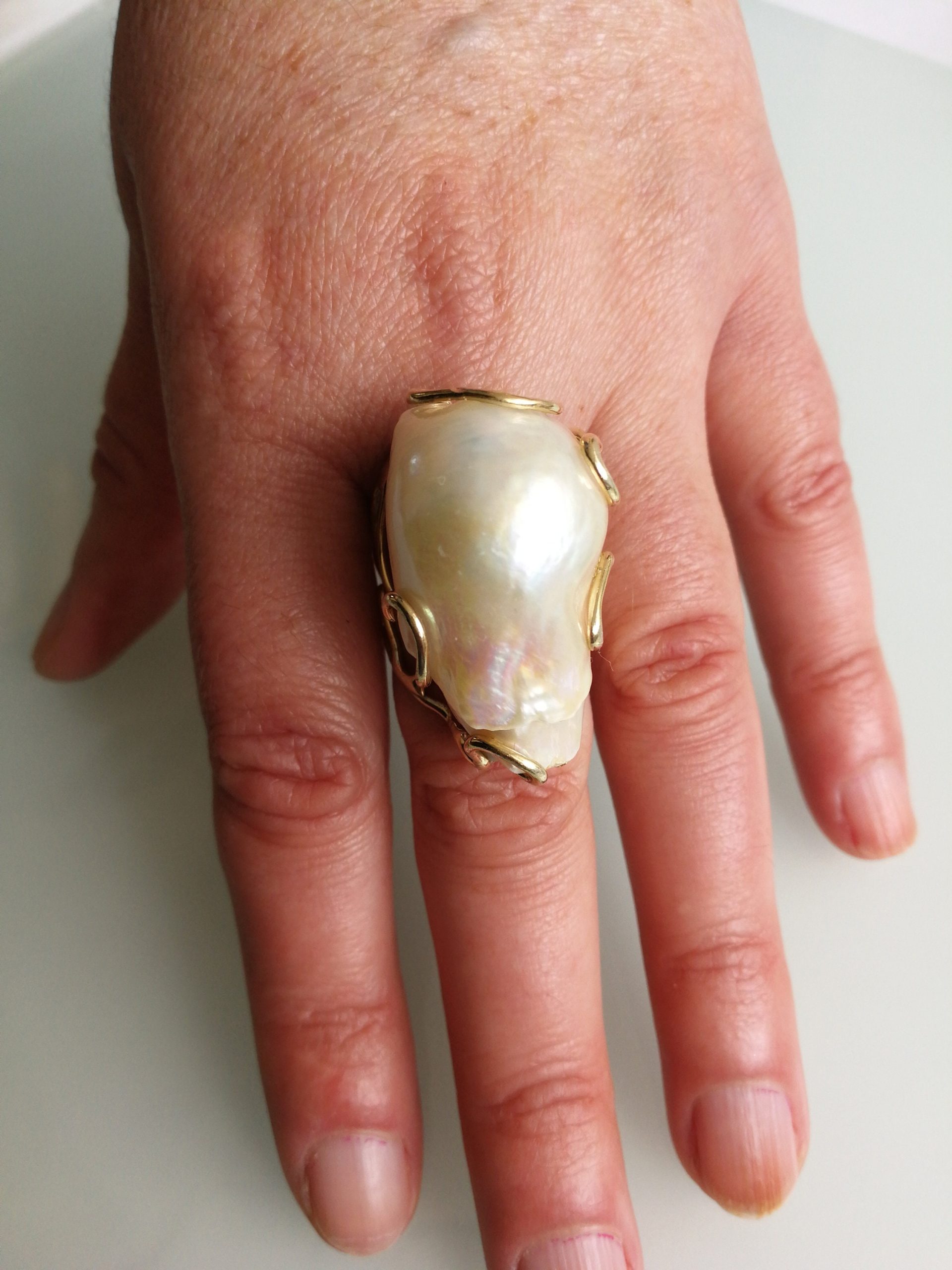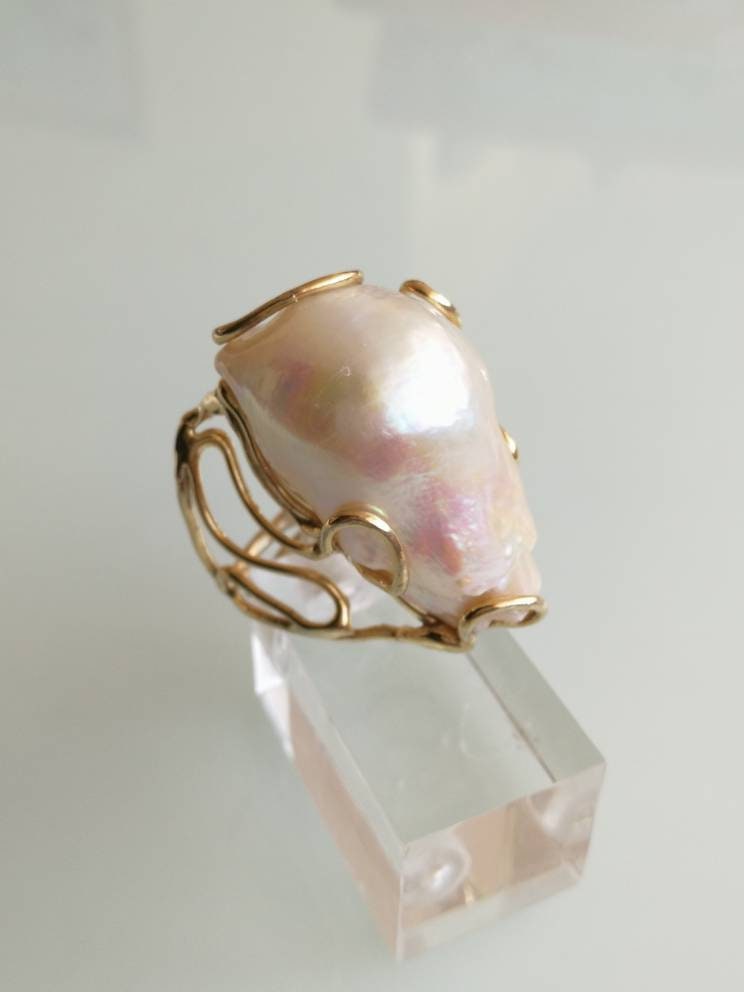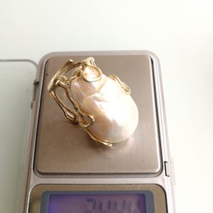 Anello elegante con perla naturale barocca bianca máxi incastonata su montatura in argento placcata oro. Misura perla 3 cm .Peso totale 24,44 grammi. Misura anello regolabile.