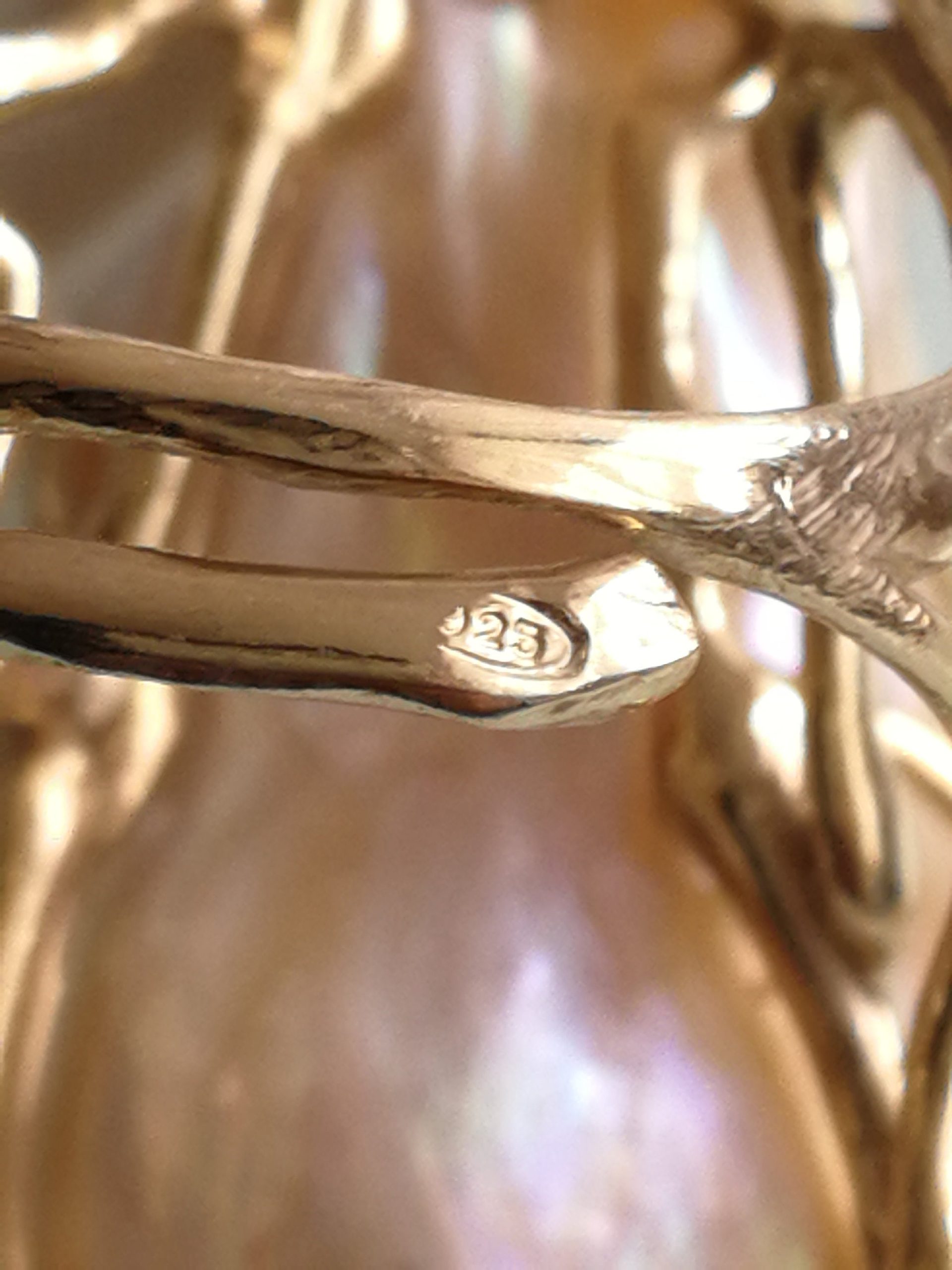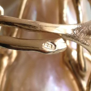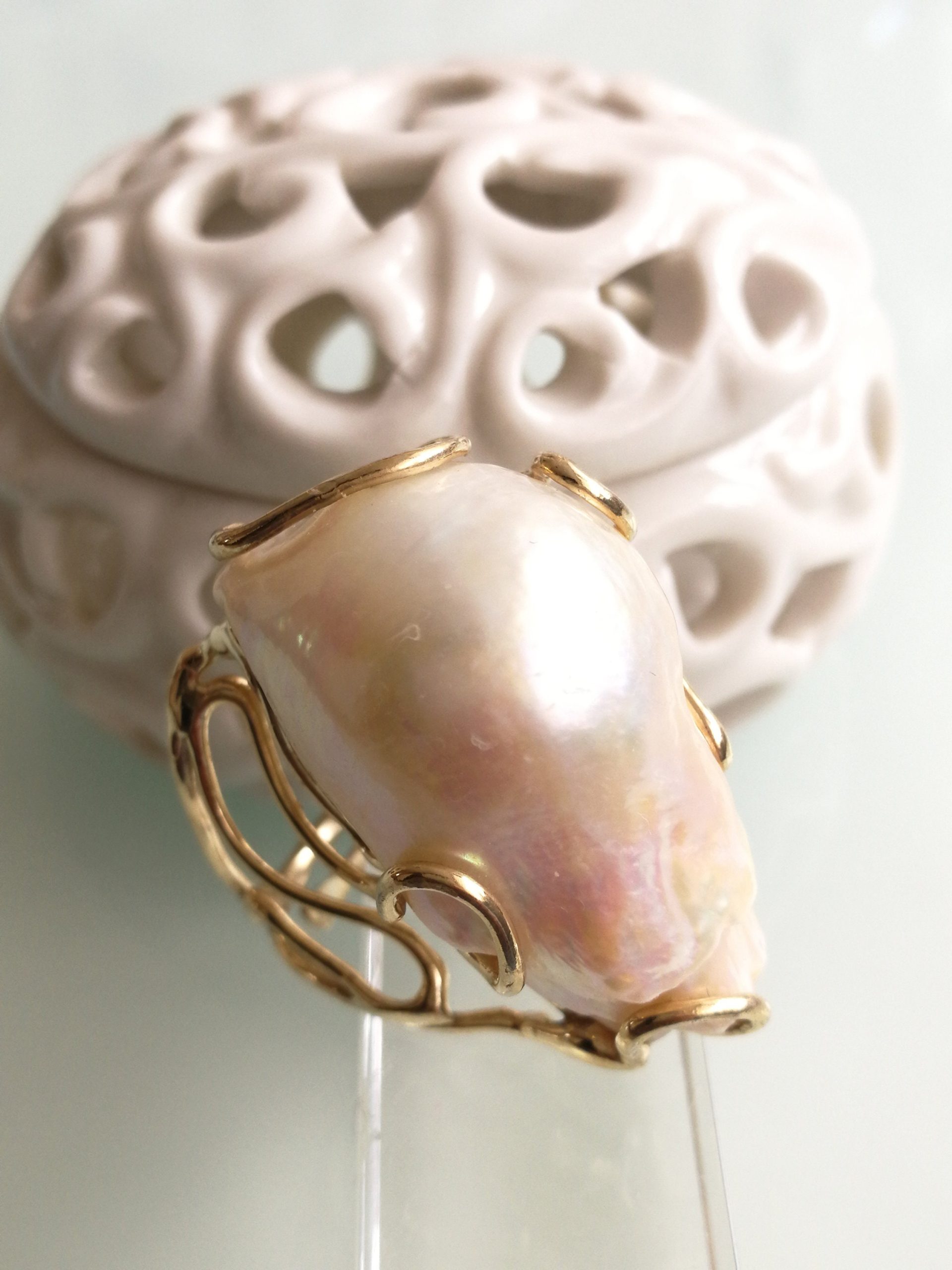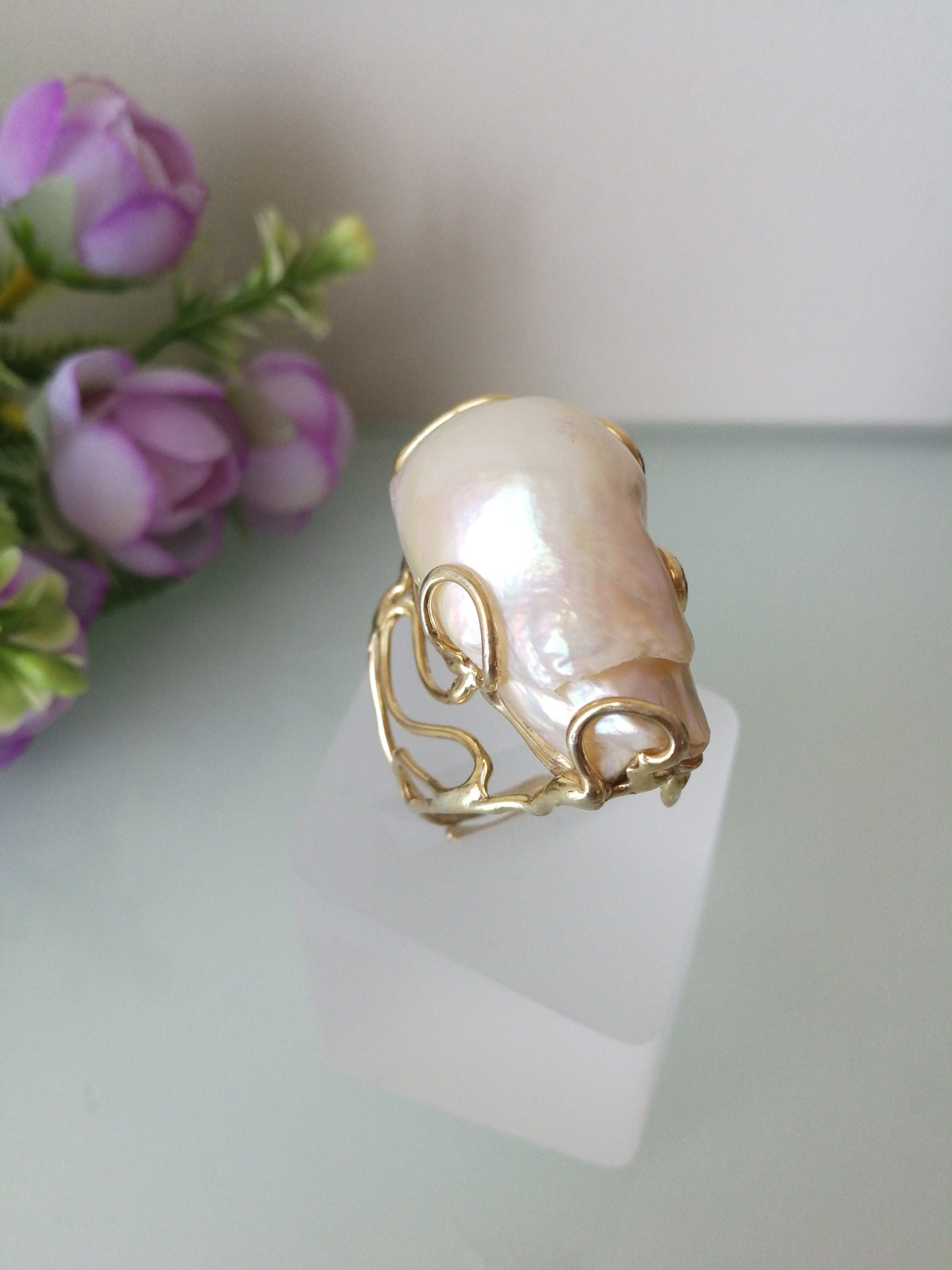 Anello elegante con perla naturale barocca bianca máxi incastonata su montatura in argento placcata oro. Misura perla 3 cm .Peso totale 24,44 grammi. Misura anello regolabile.