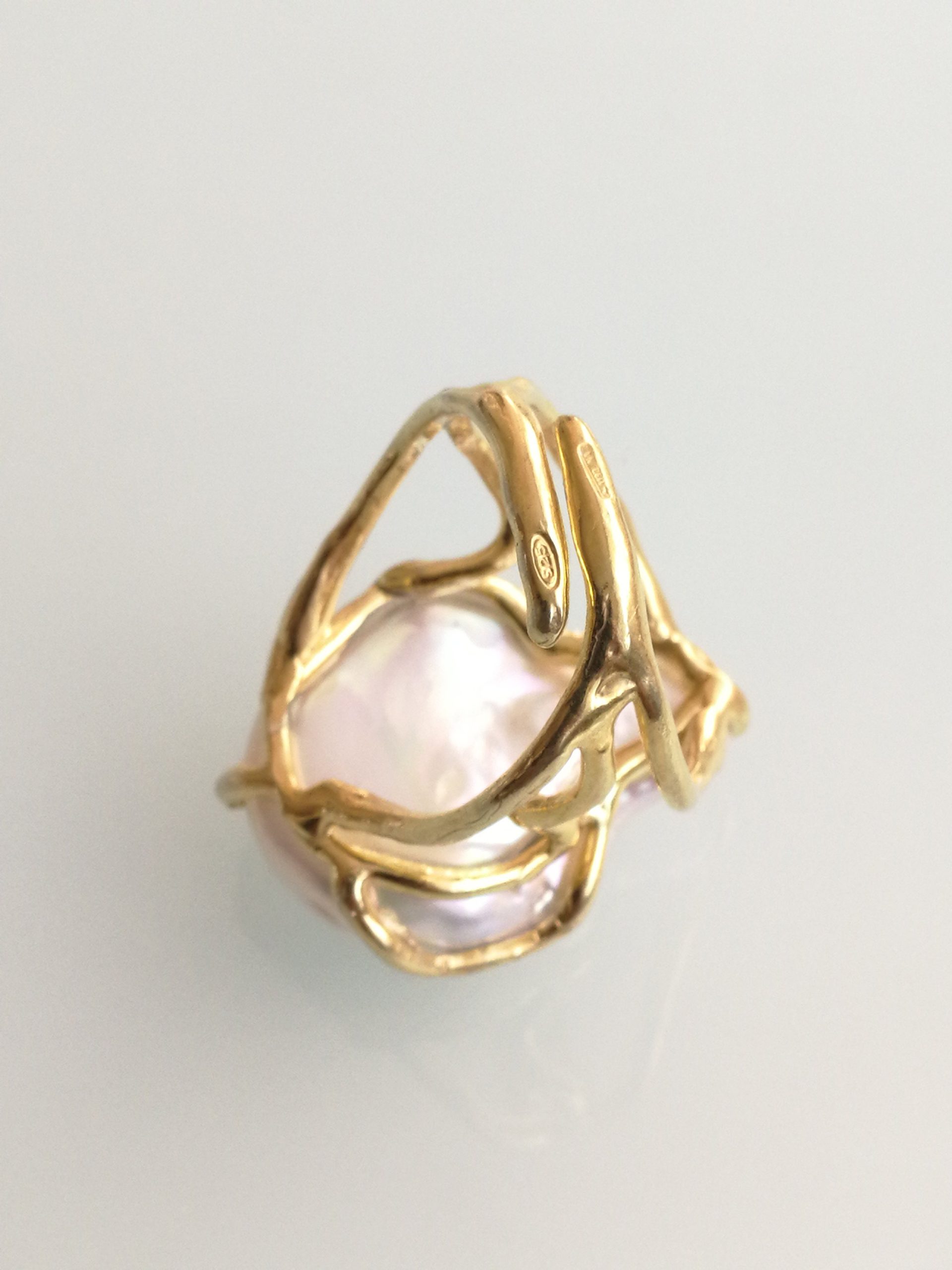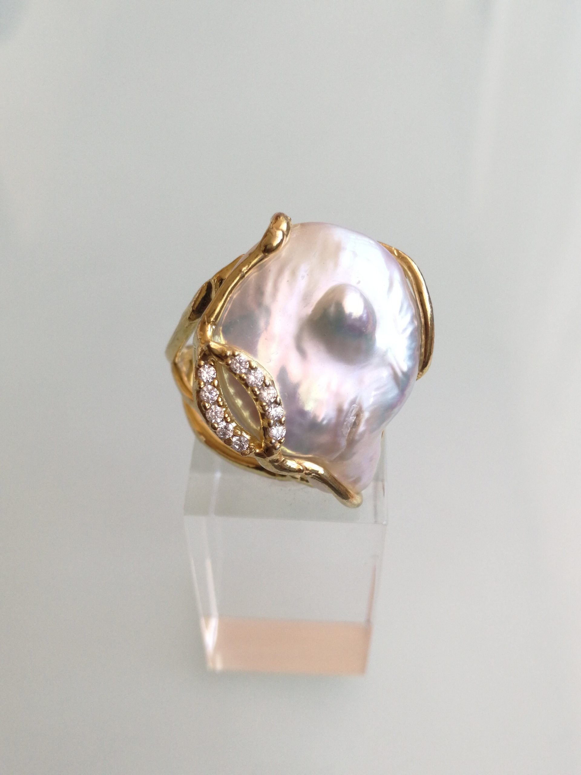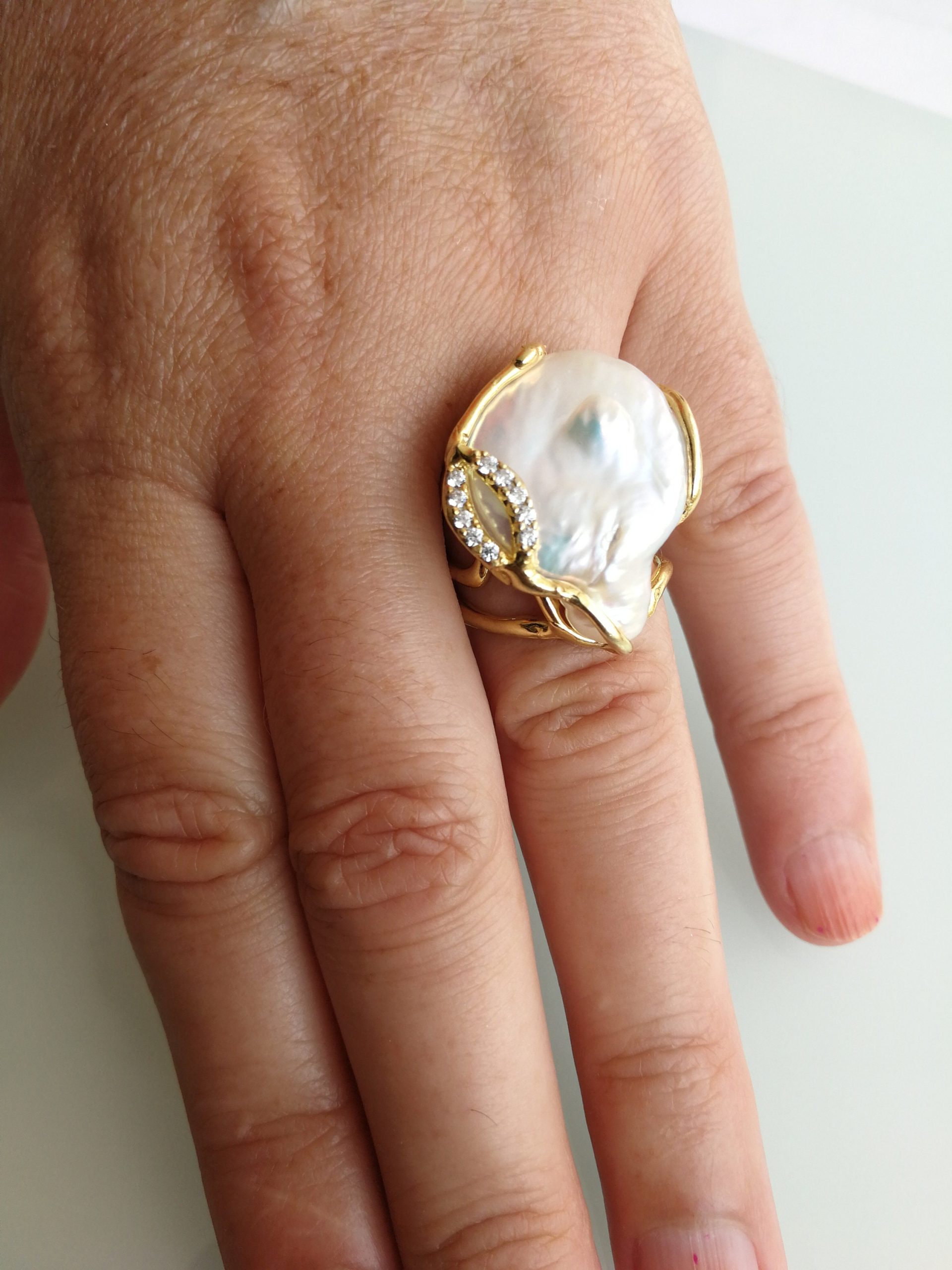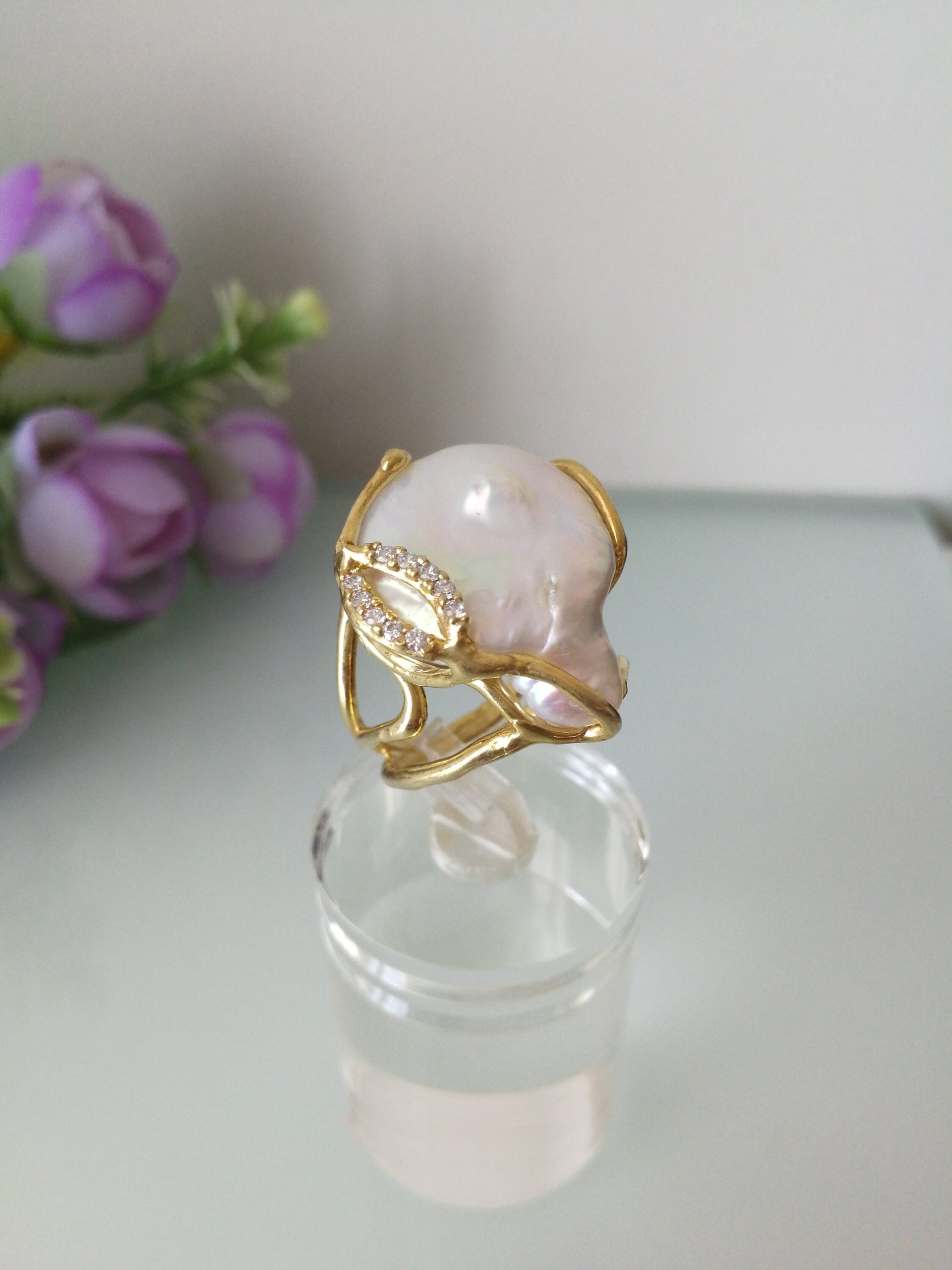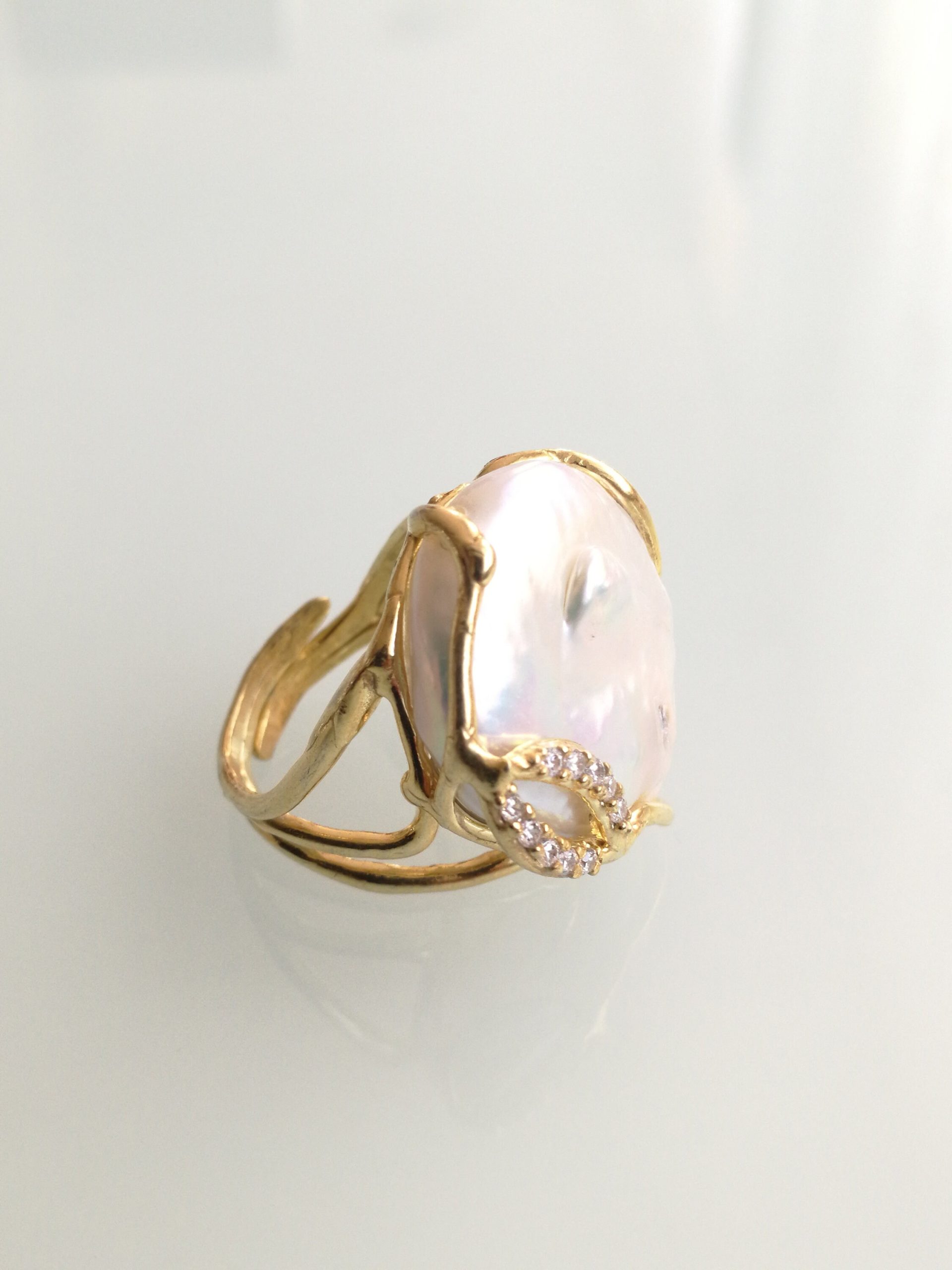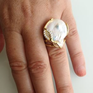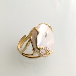 Anello elegante con perla naturale barocca bianca incastonata su montatura in argento placcata oro con 10 piccoli zirconi bianchi laterali .Misura anello regolabile.
