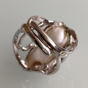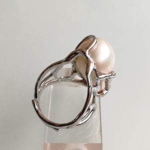 Anello elegante con maxi perla naturale barocca bianca, con piccoli zirconi bianchi laterali, montatura a incrocio in argento 925. Misura lunghezza perla 3 cm. Misura anello regolabile.