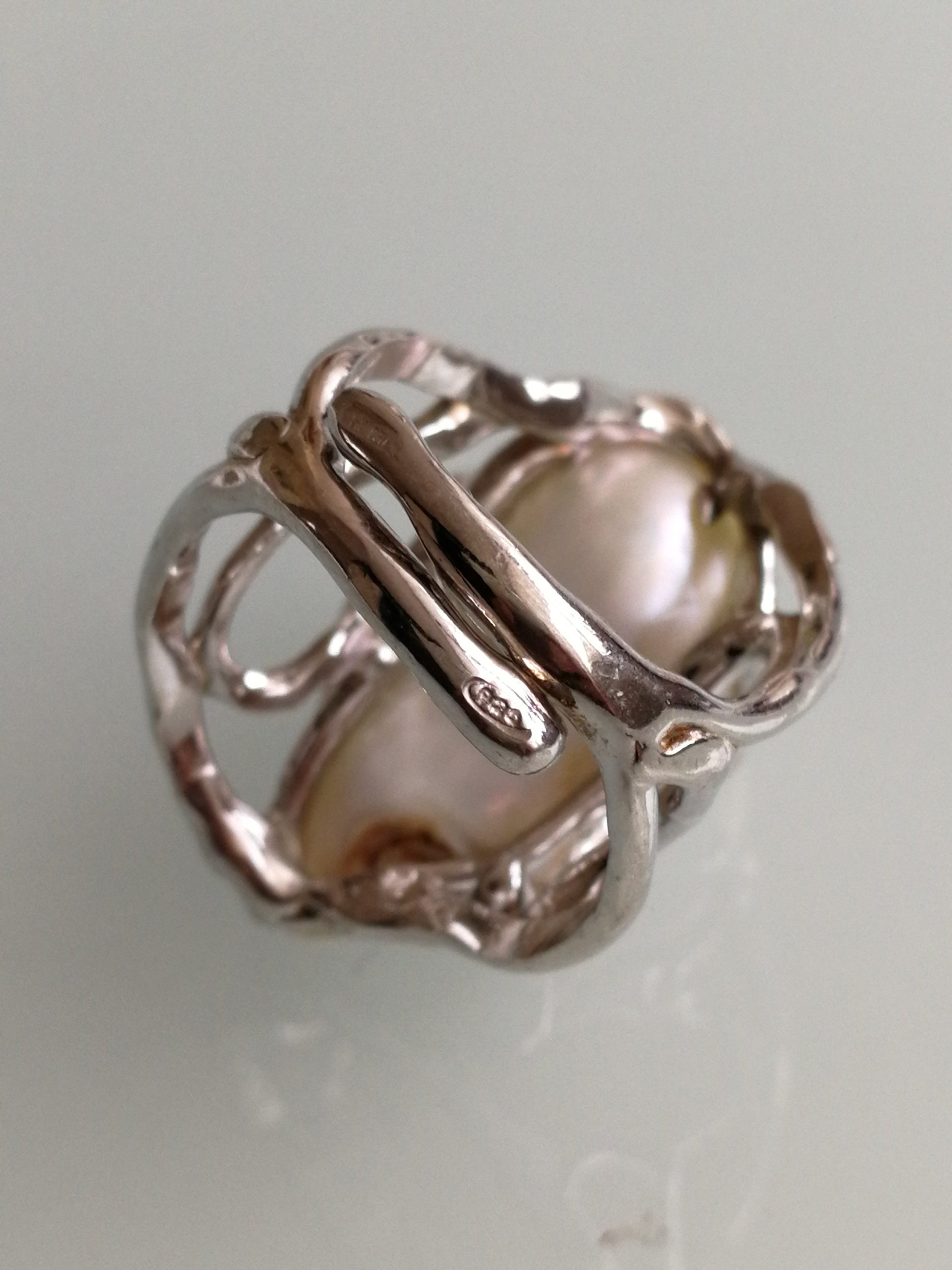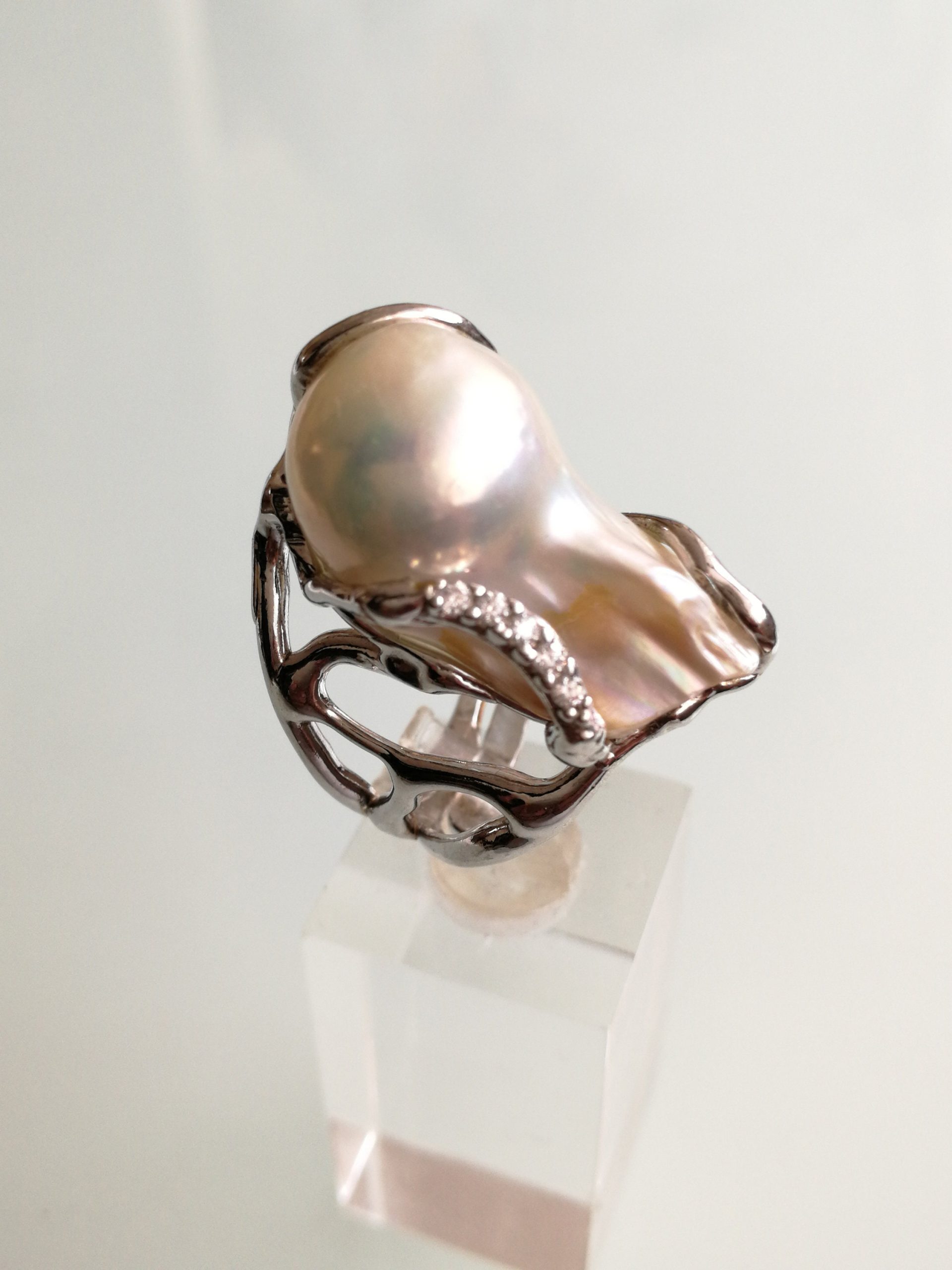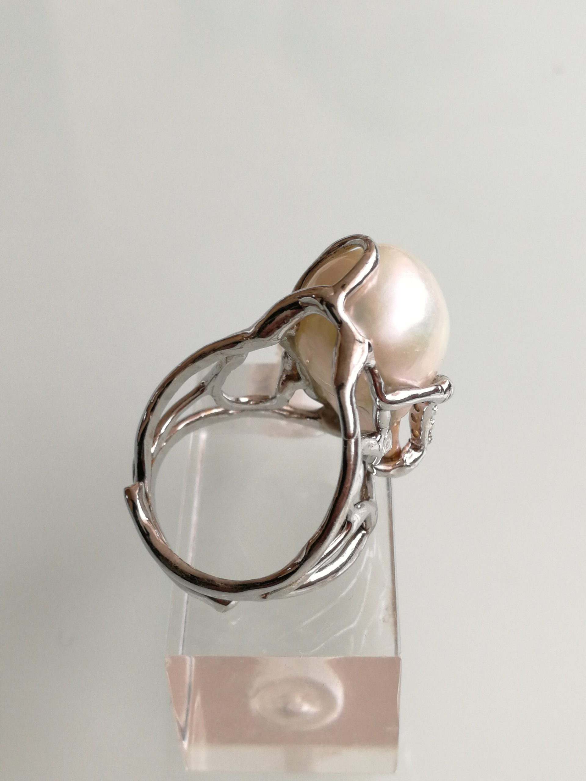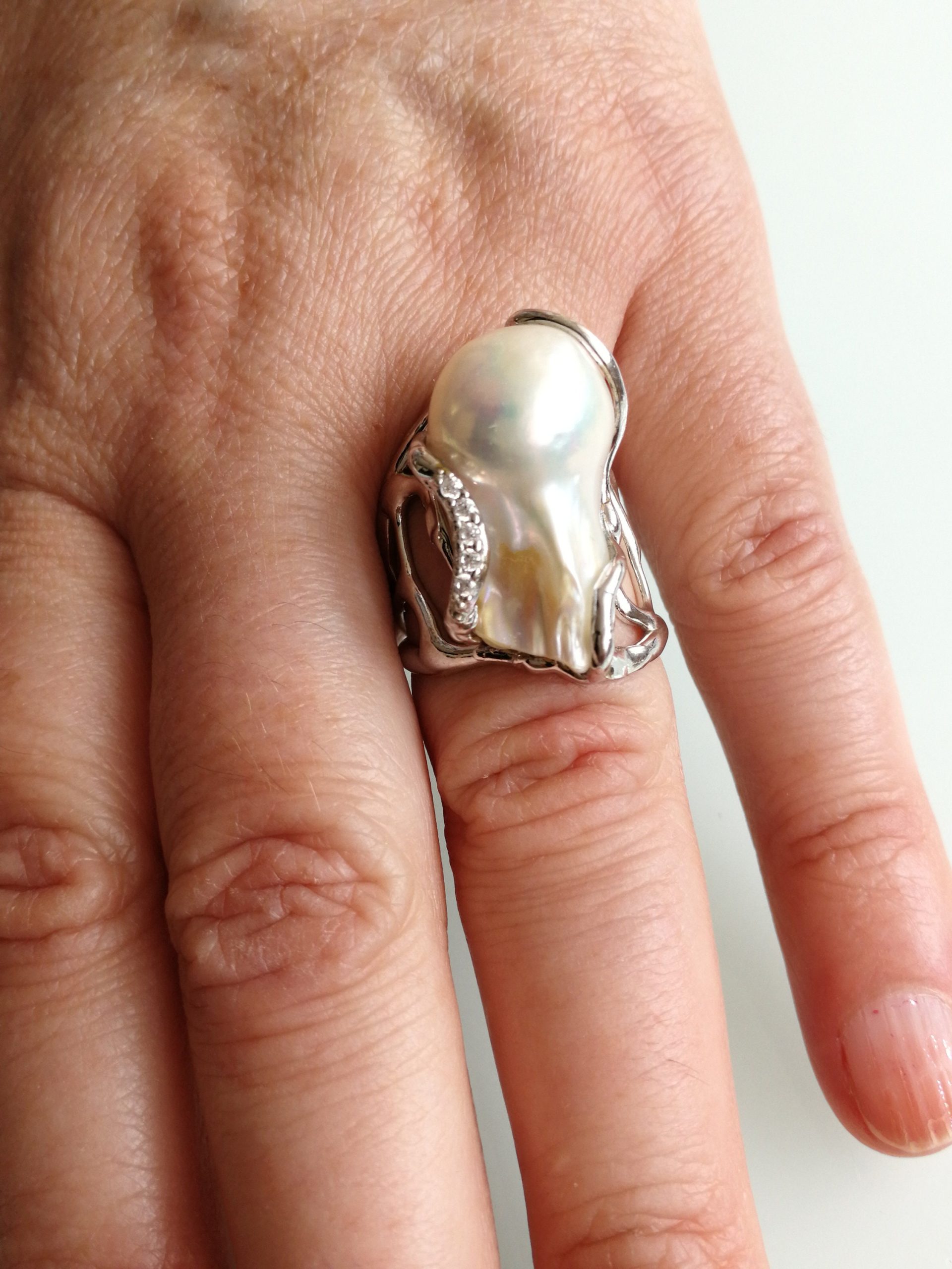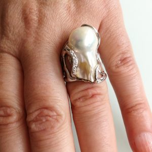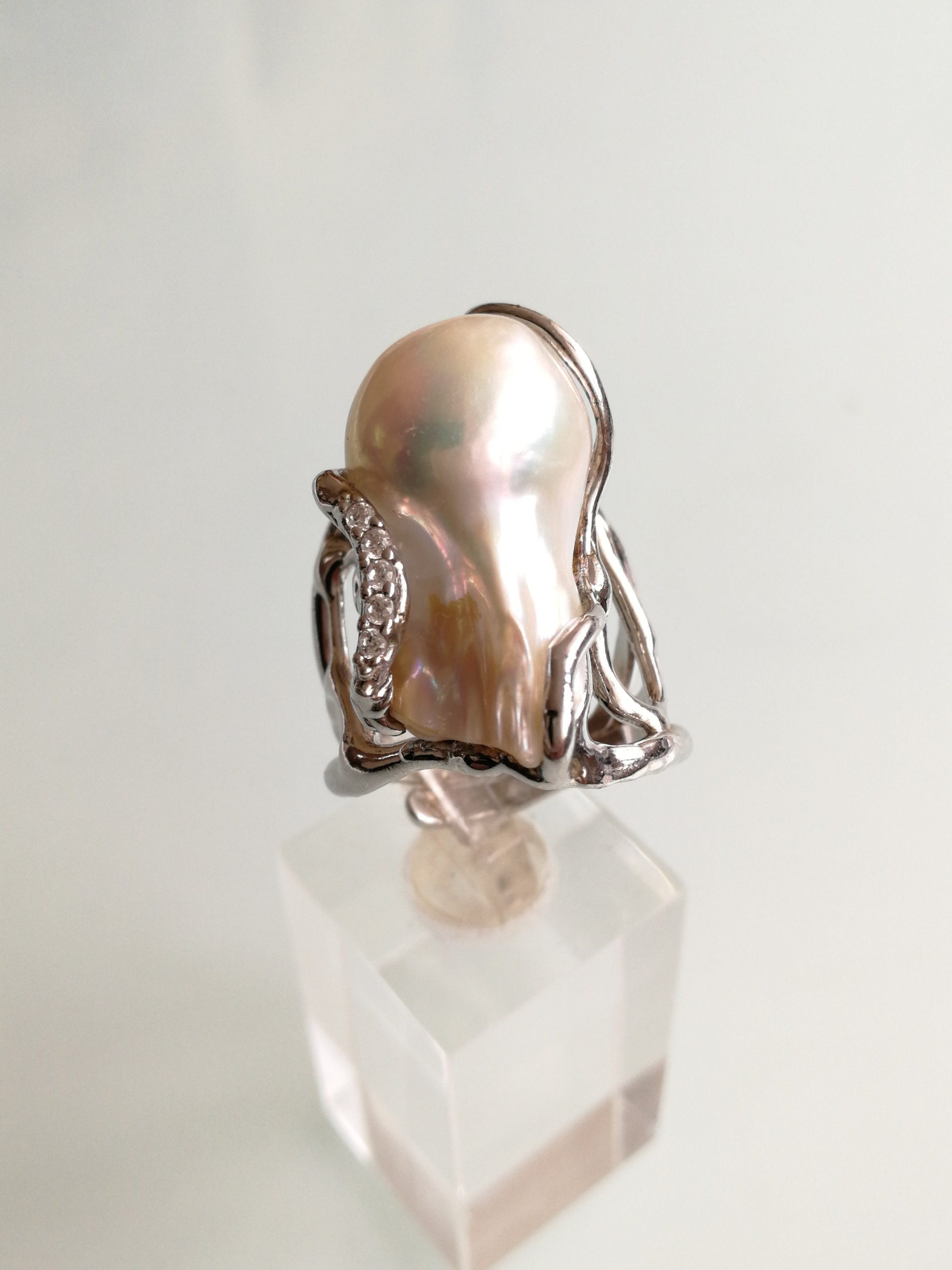 Anello perla naturale barocca bianca. Anello zirconi bianchi. Anello argento. Anello maxi.