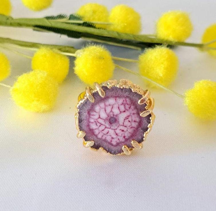 Anello con pietra agata druzzy rosa, 2 cm diametro e base regolabile in ottone dorato.