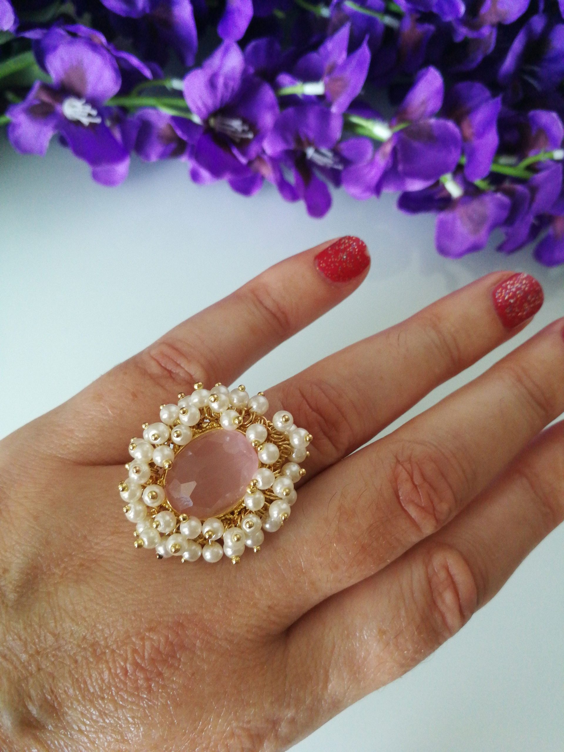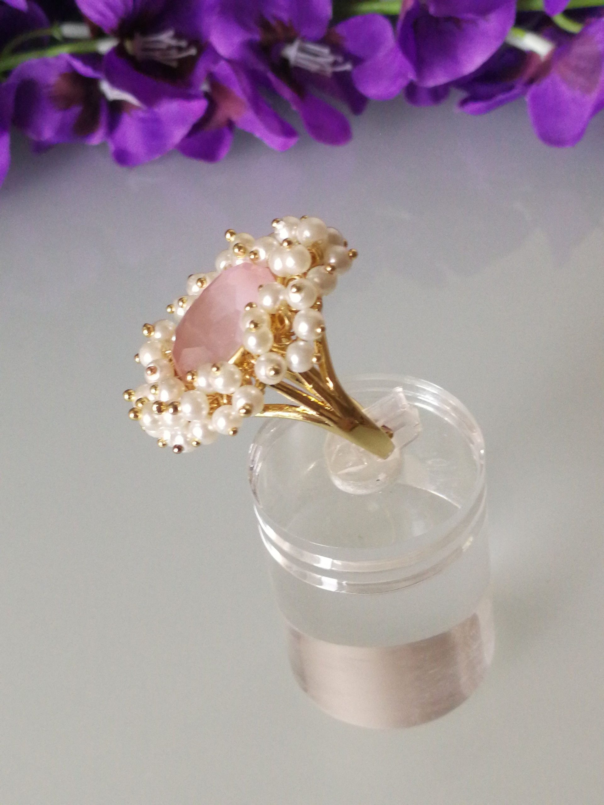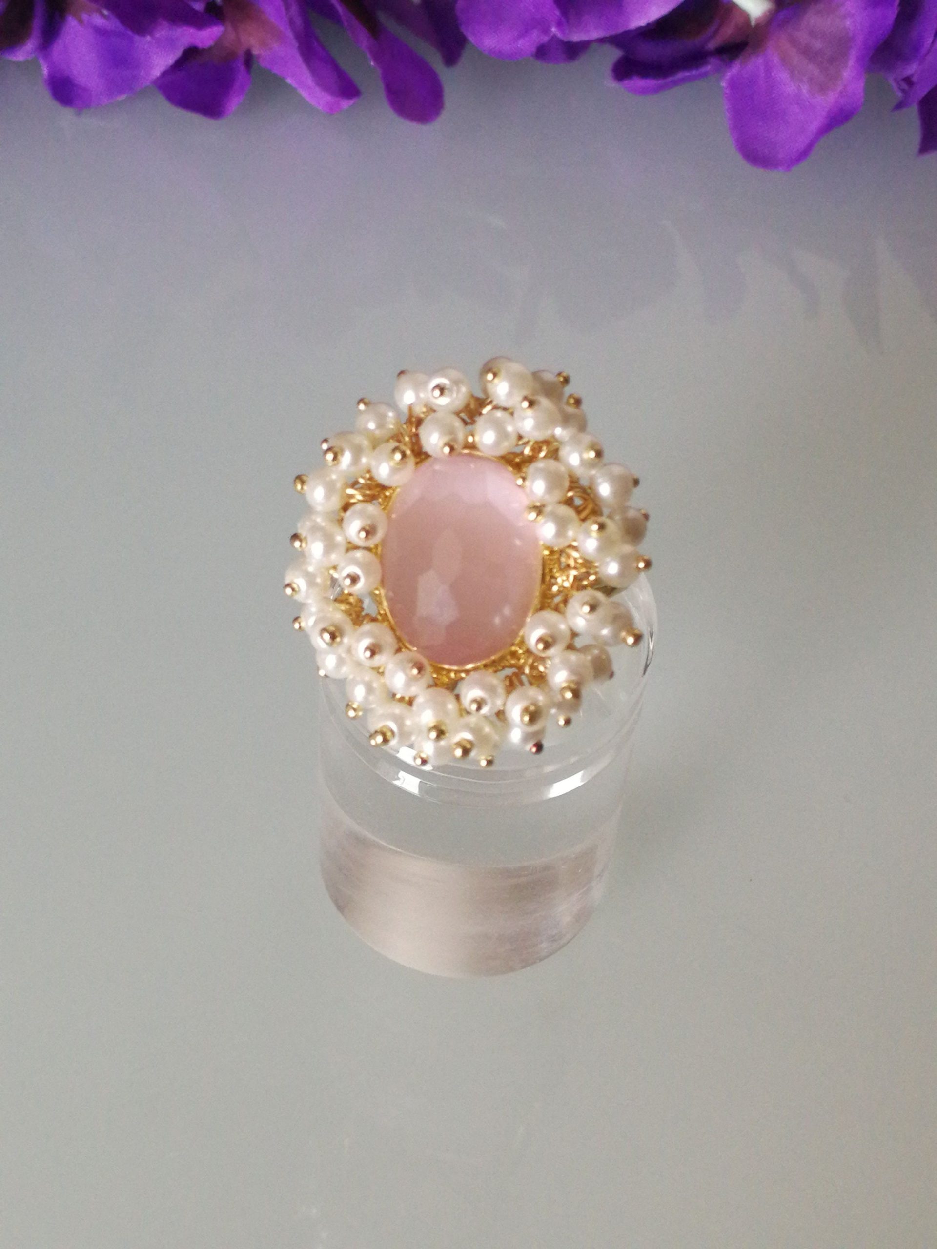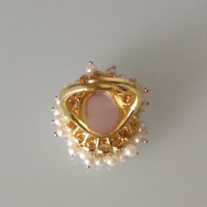 Anello stile Art noveau con pietra centrale in quarzo rosa occhio di gatto , contornata da piccole perline bianche imitazione . Misura dimensioni 3×2,2 cm. Misura anello regolabile.