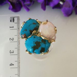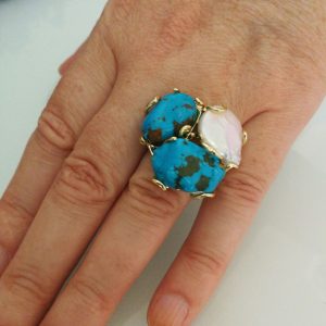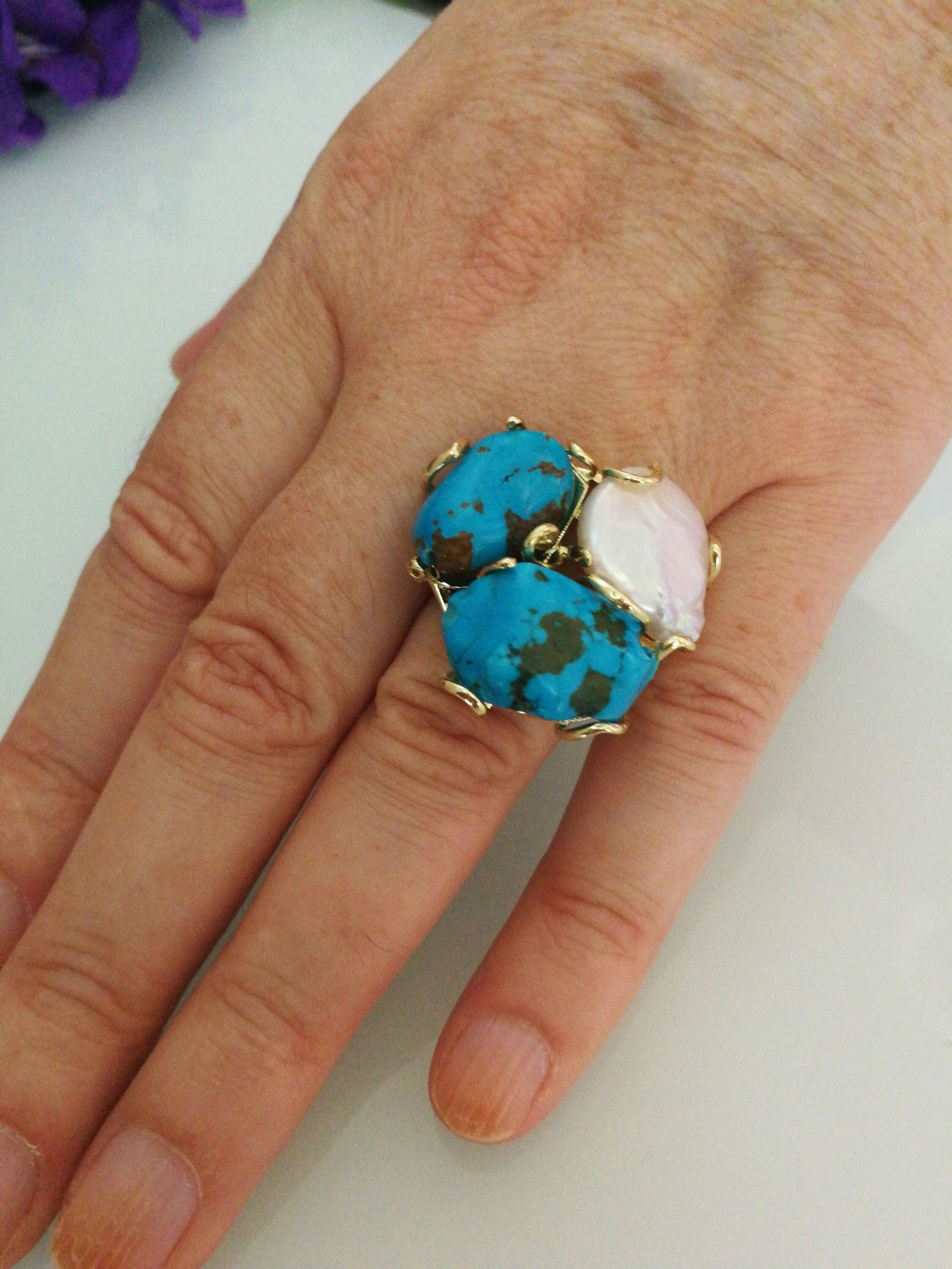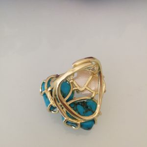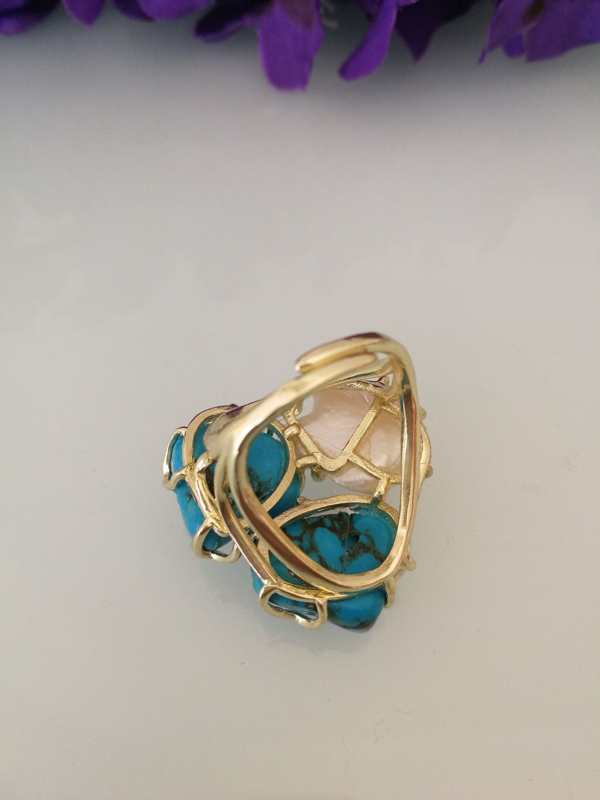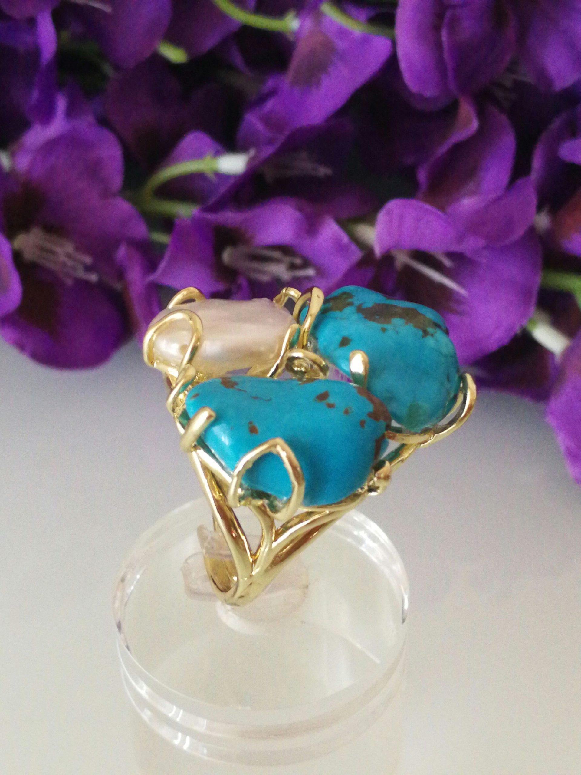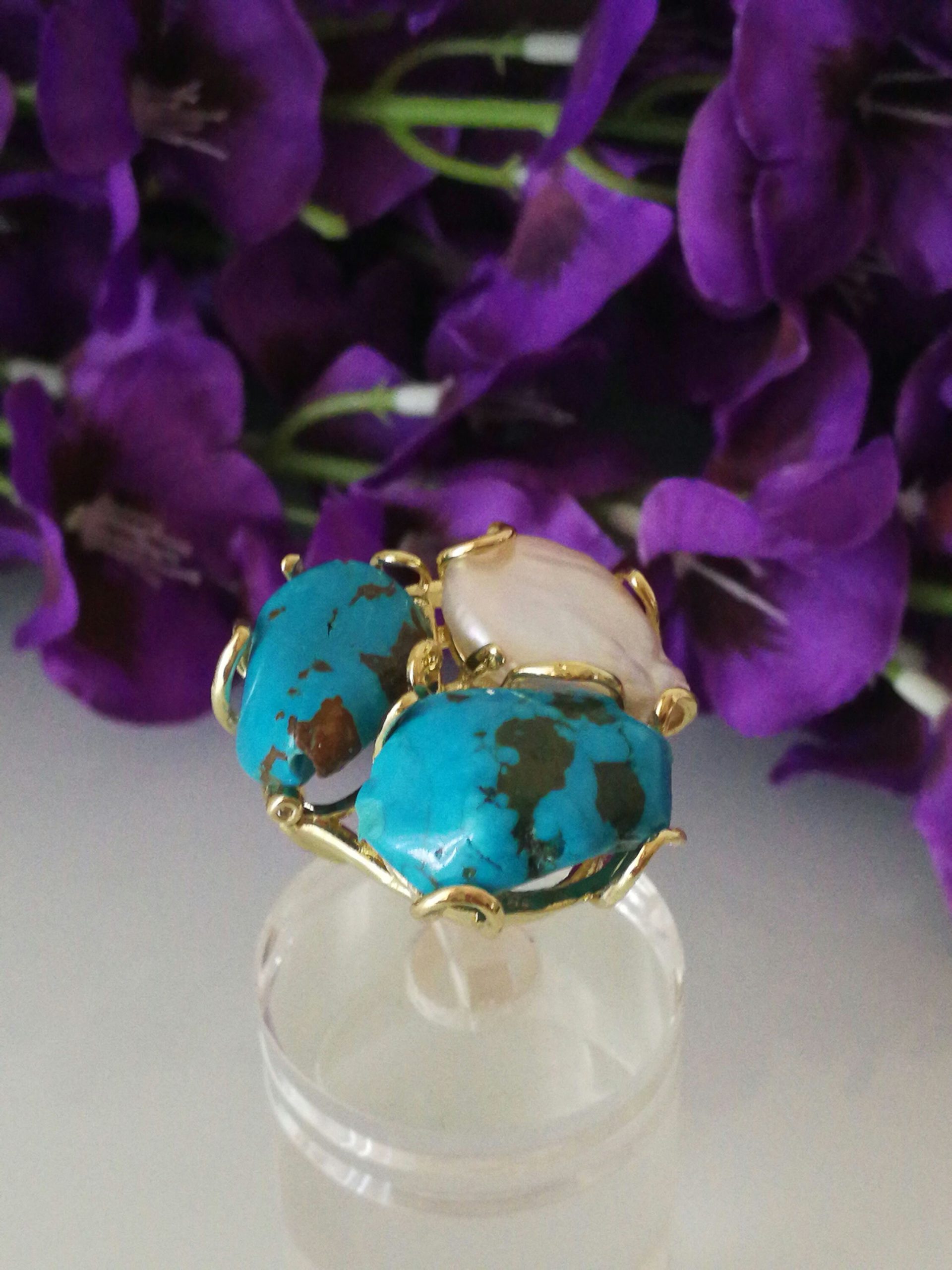 Anello stile Art noveau con due pietre vere di Turchese naturale arizona, e perla naturale bianca barocca ,montatura in ottone dorato. Misura pietre 3 cm.Misura anello regolabile.