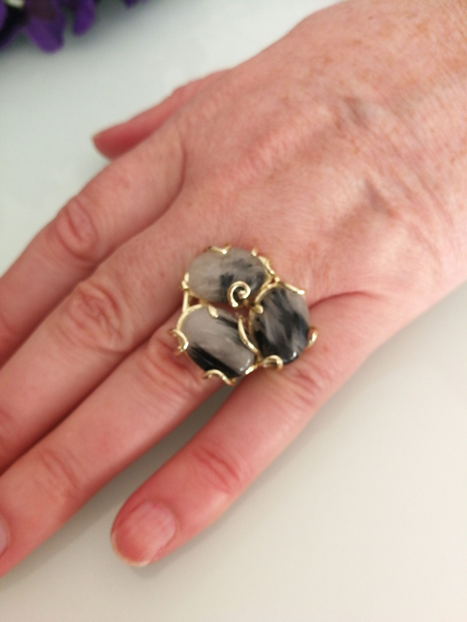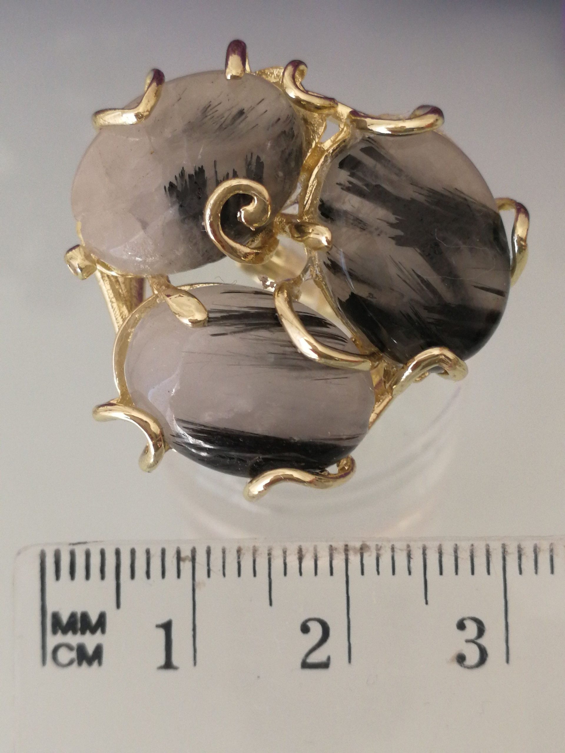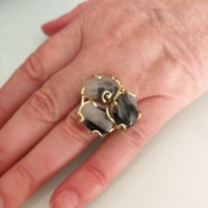 Anello maxi con tre pietre di quarzo tigre , montatura artigianale in ottone placcata oro. Misura delle pietre 3,5×2,5 cm. Misura anello regolabile.