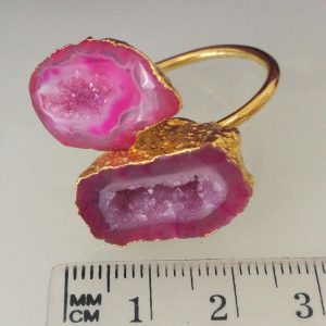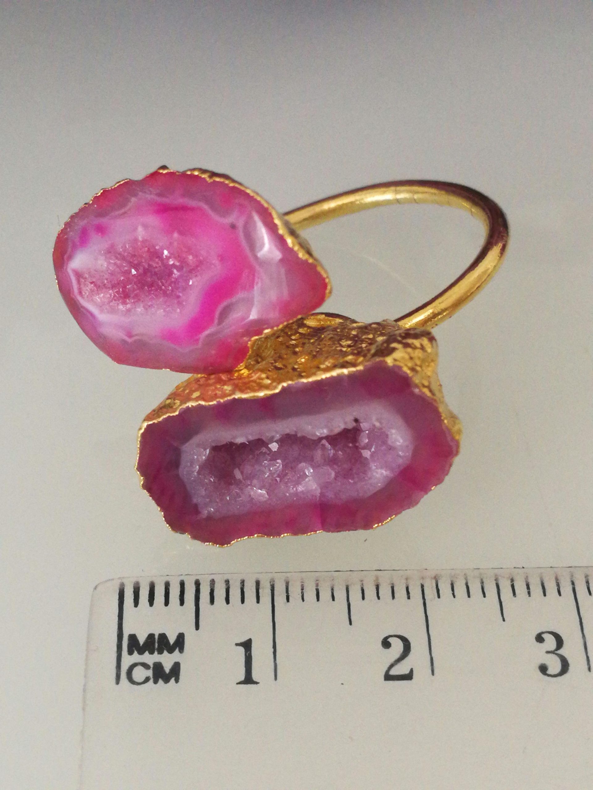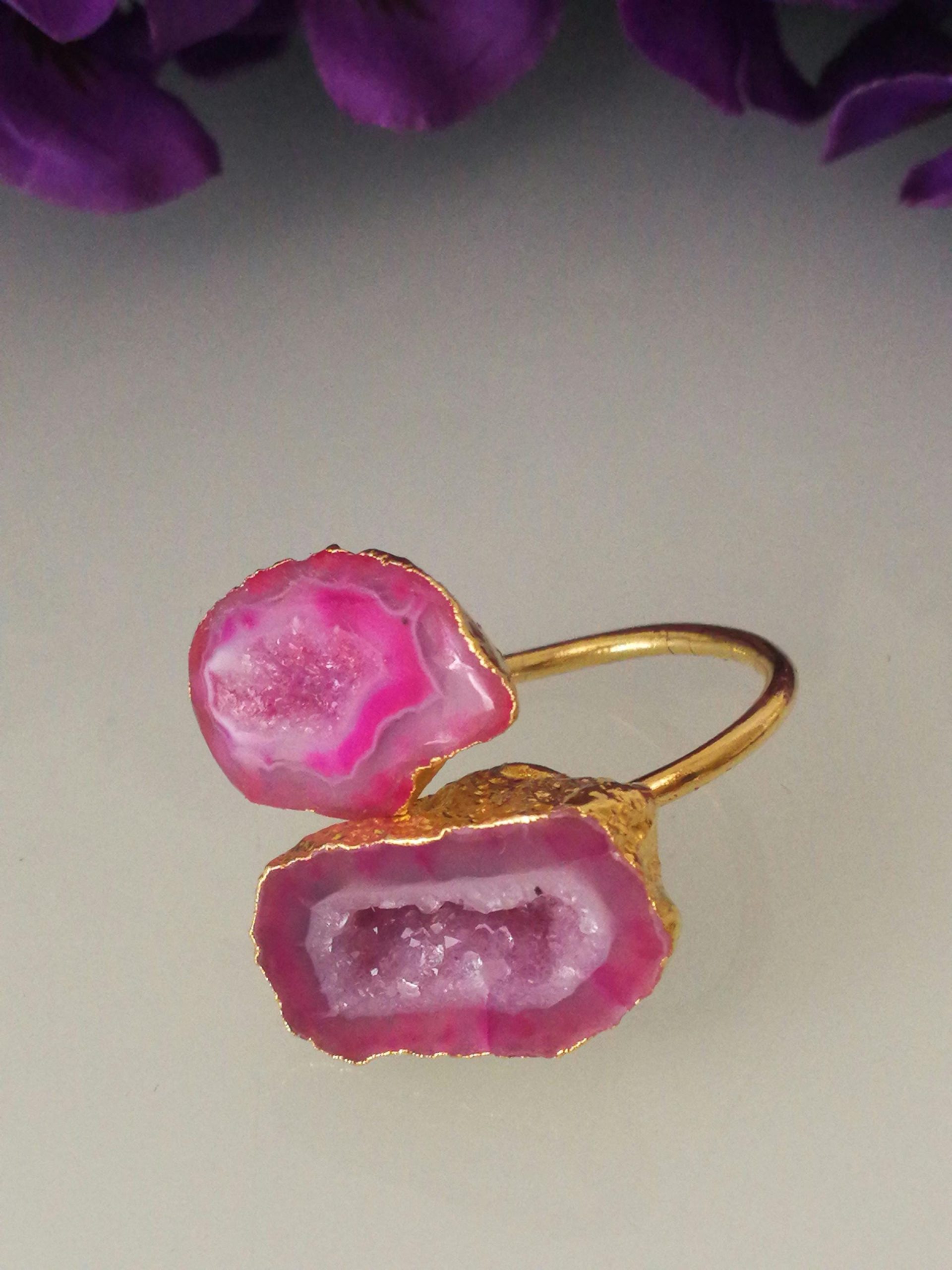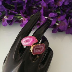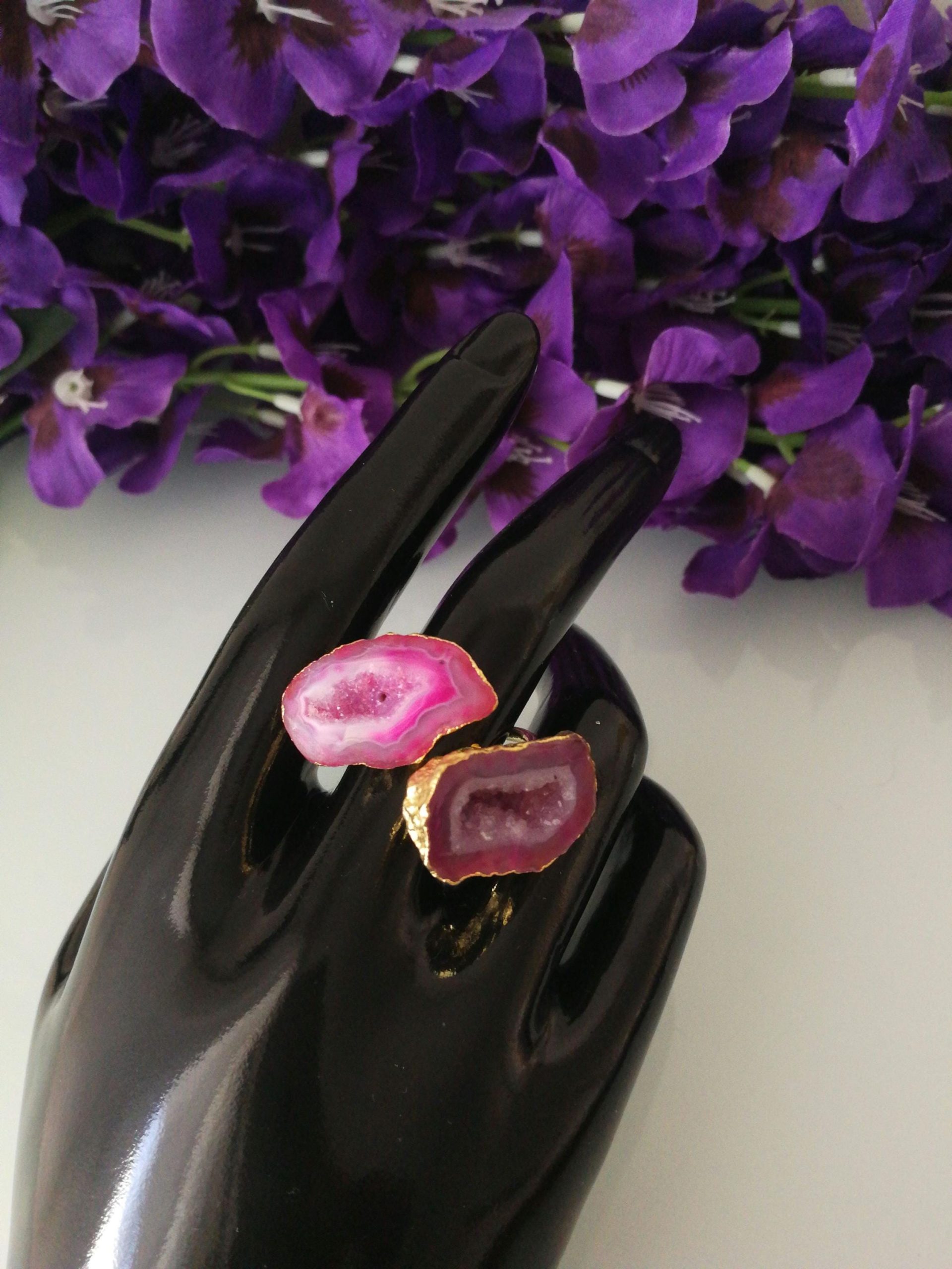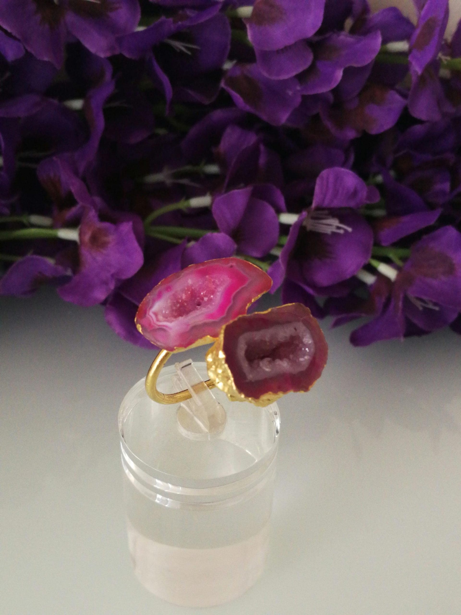 Anello con pietre vere di agata druzy viola ciclamino, montatura in ottone dorata. Misura lunghezza pietre 2,5 cm. Misura anello regolabile.
