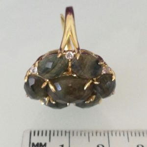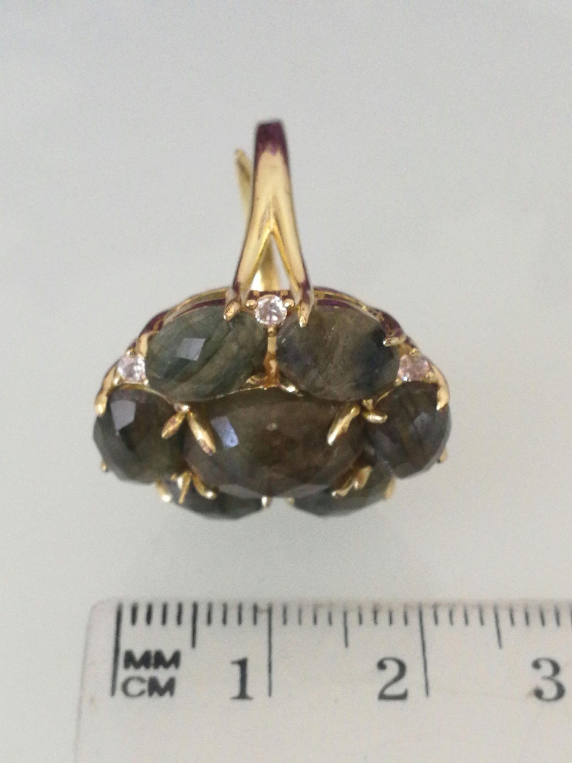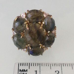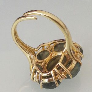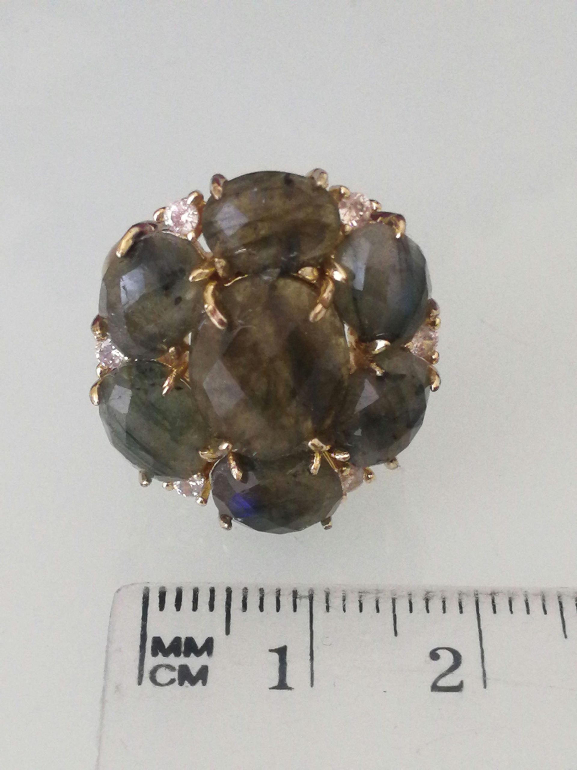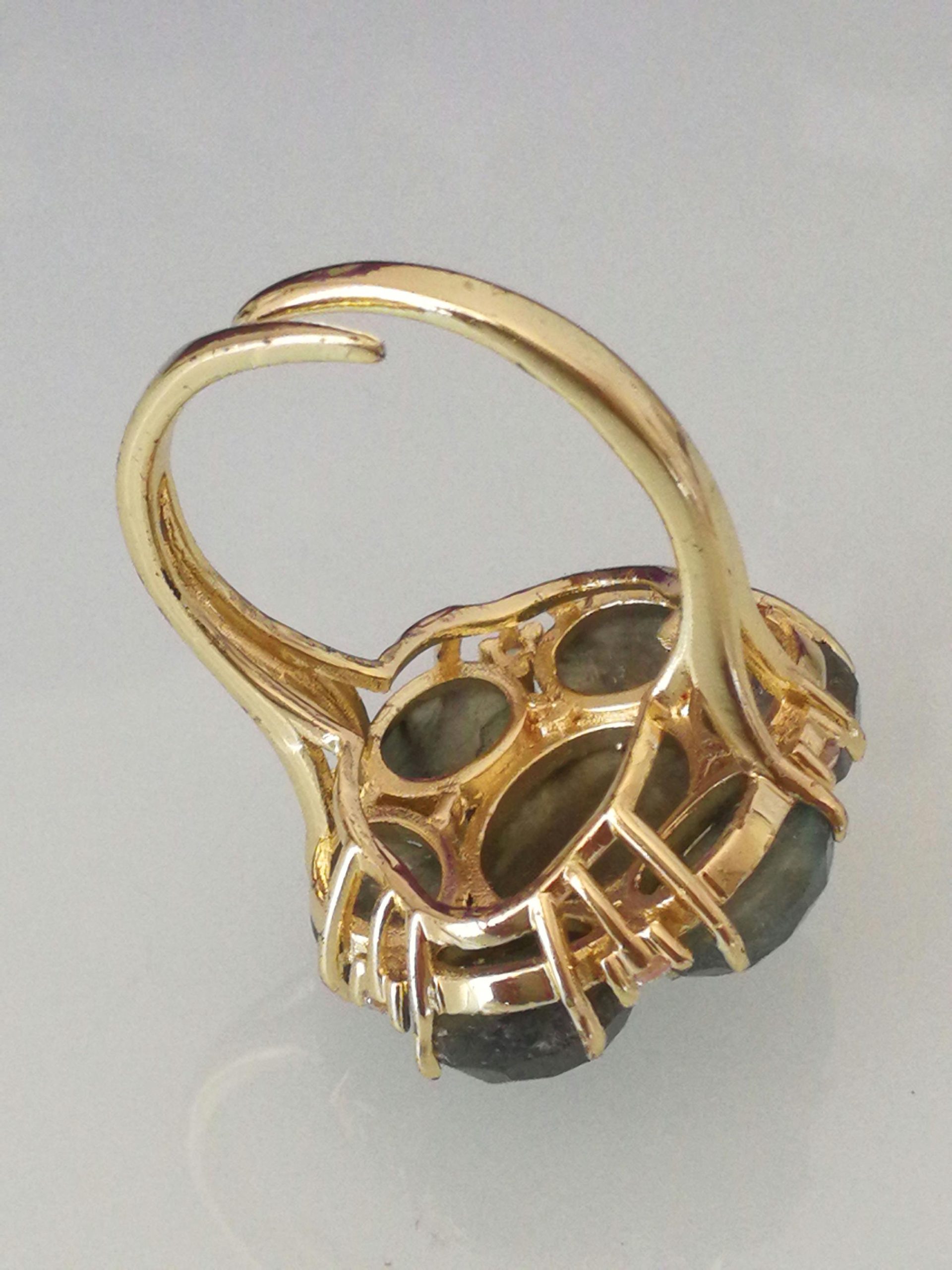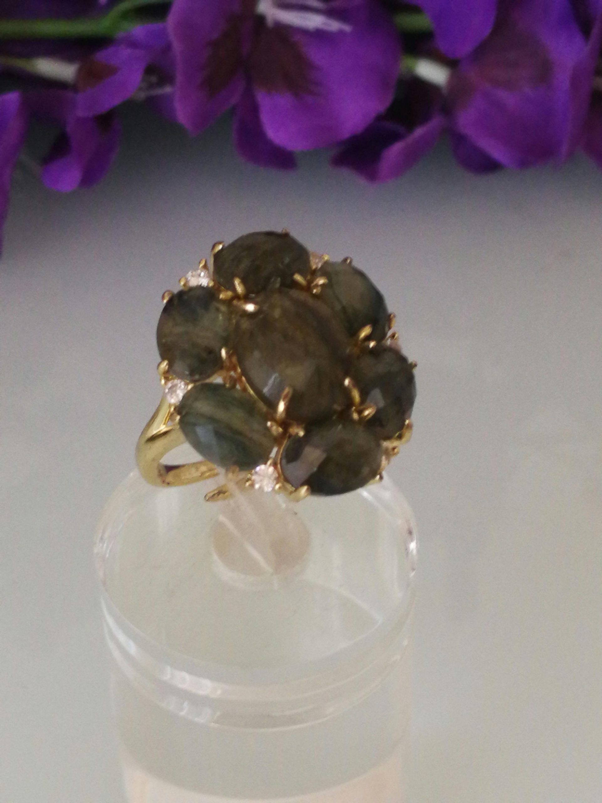 Anello elegante con pietre vere di quarzo grigio sfaccettate contornate da 6 zirconi bianchi ,misura anello lunghezza 2 cm,montatura in ottone placcata oro.Misura anello regolabile.