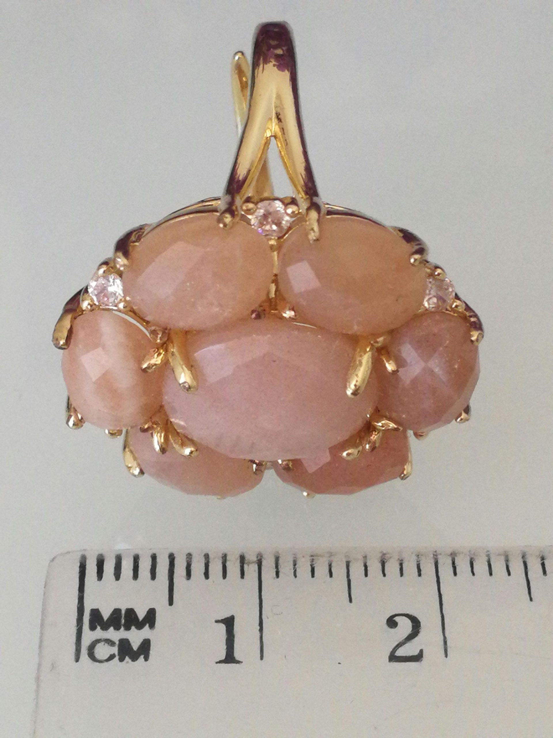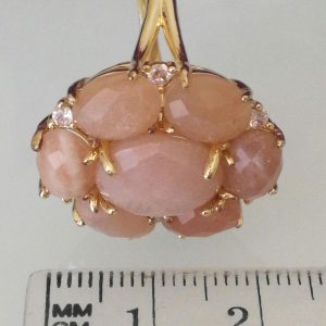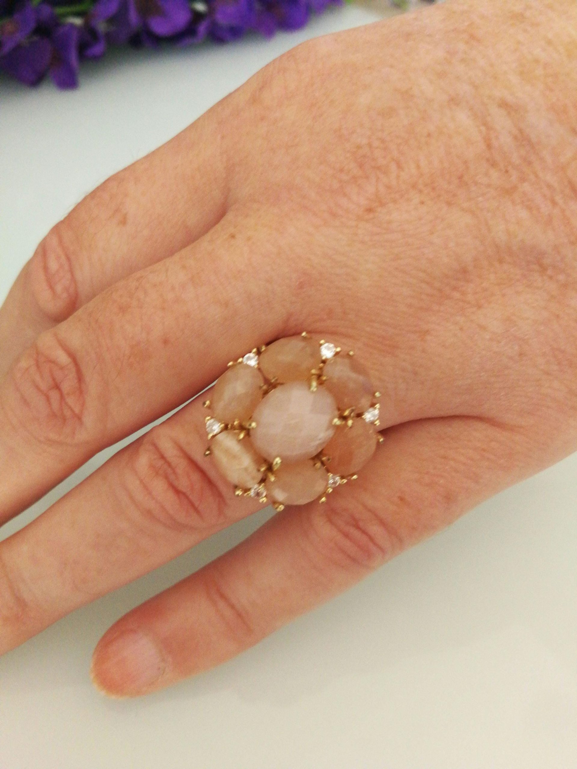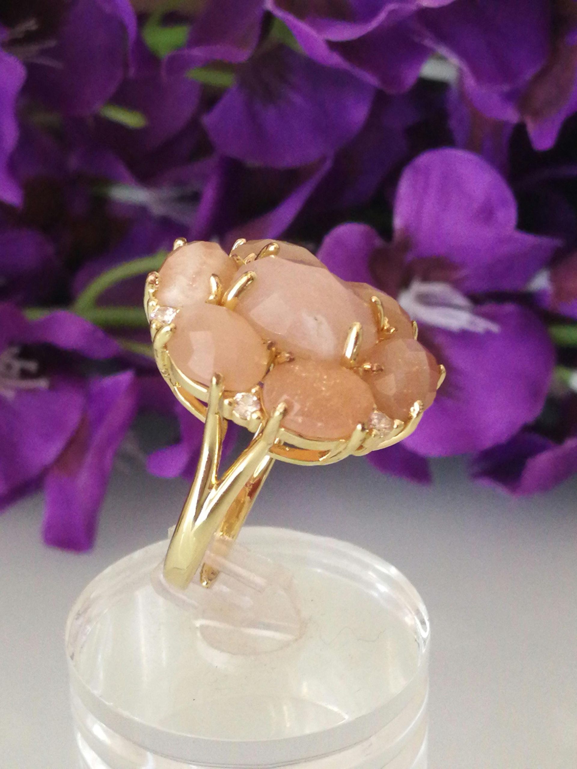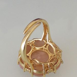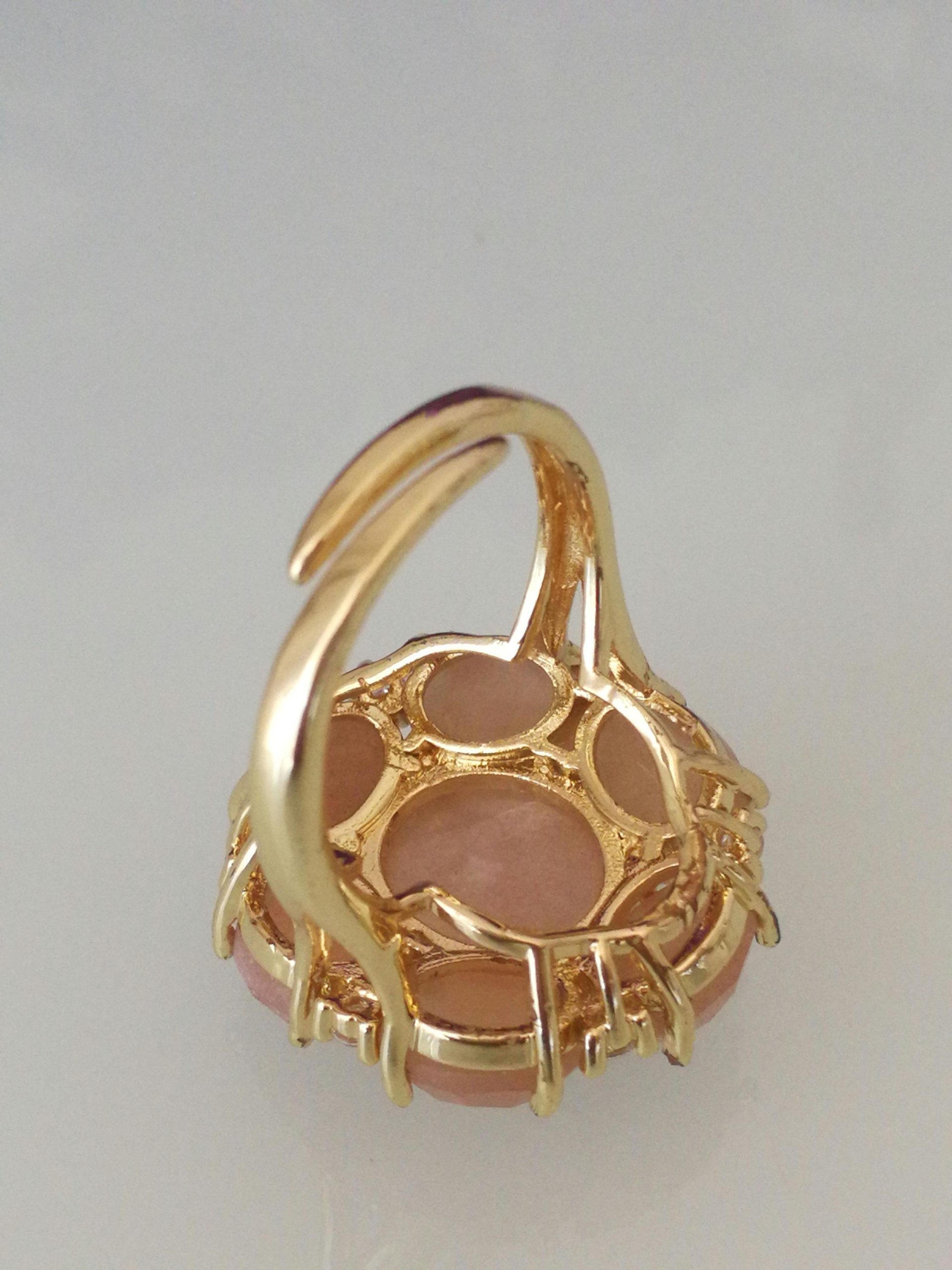 Anello elegante con pietre vere di quarzo rosa sfaccettate contornate da 6 zirconi bianchi ,misura anello lunghezza 2 cm,montatura in ottone placcata oro.Misura anello regolabile.