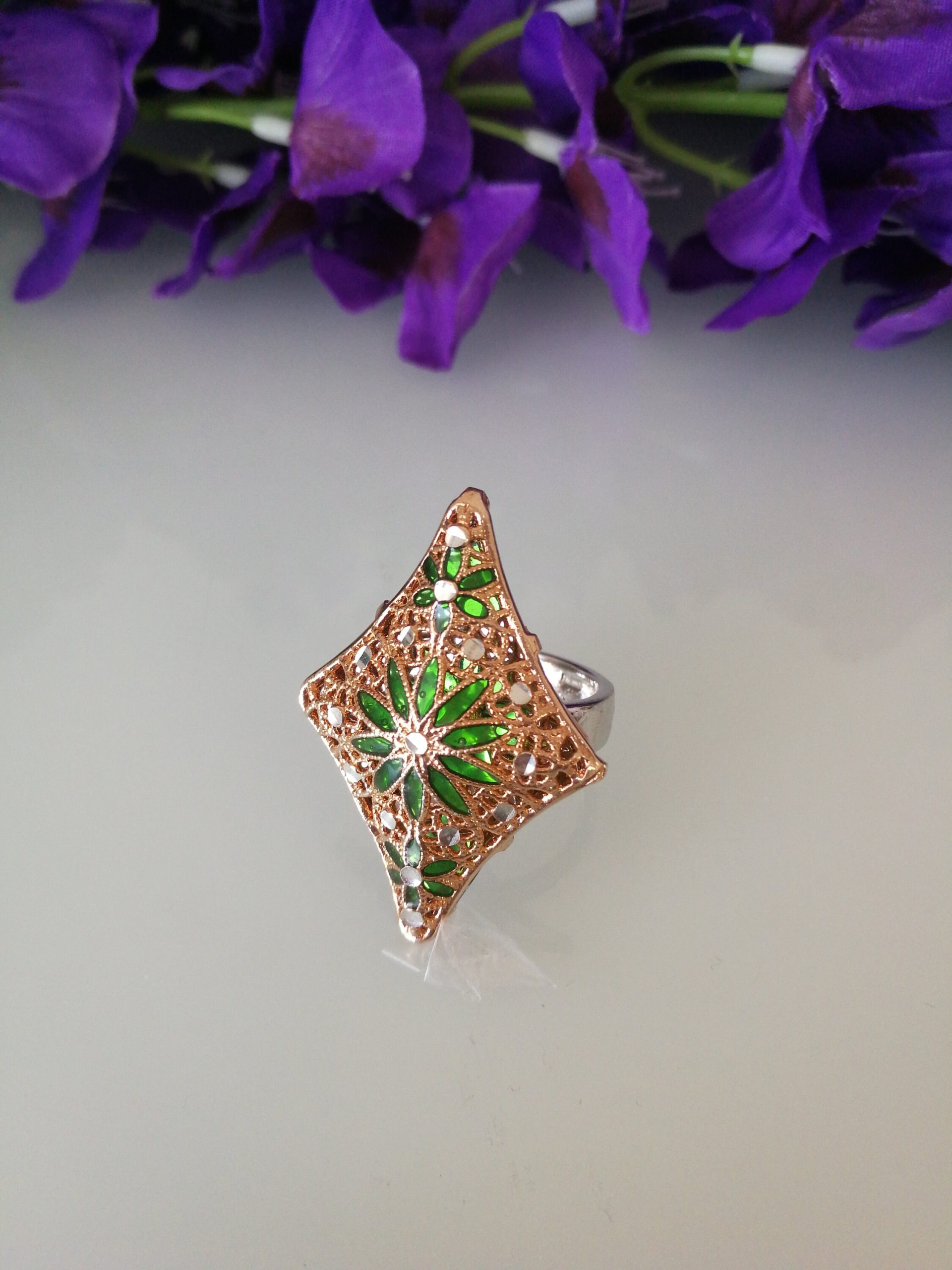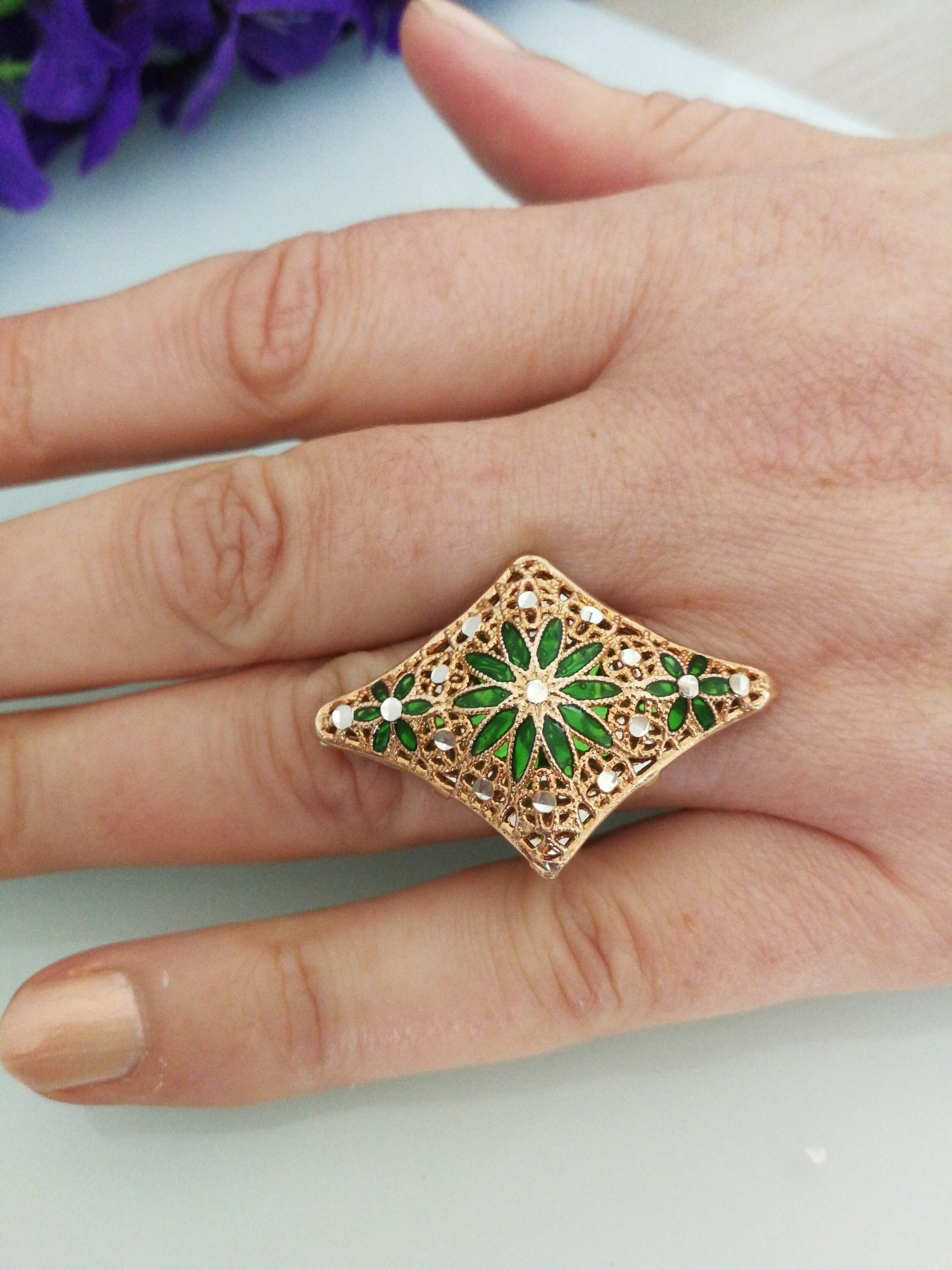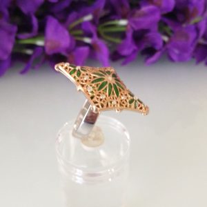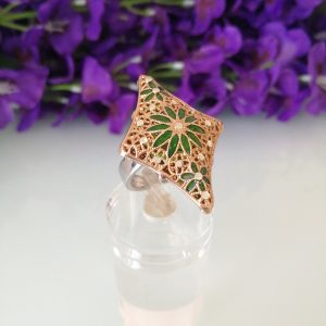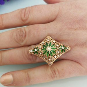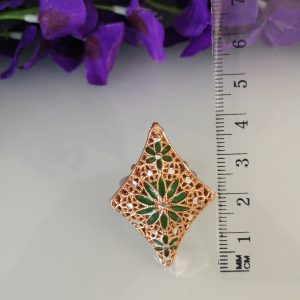 Anello elegante in stile Vintage , con pietre quarzo verde imitazione smeraldo , montatura artigianale lavorata a mano in argento placcata oro. Misura lunghezza 4 cm. Misura anello regolabile.