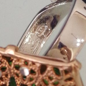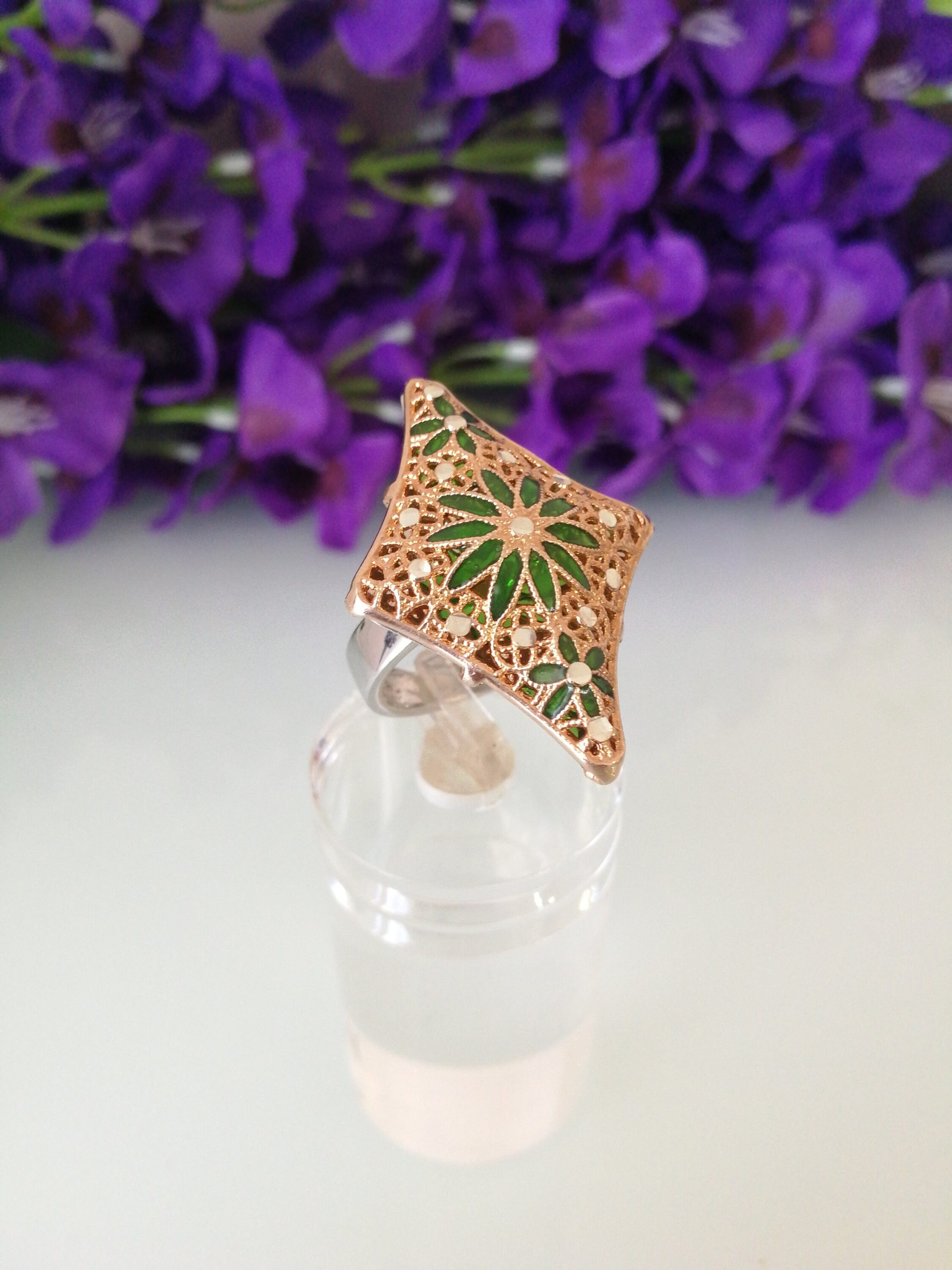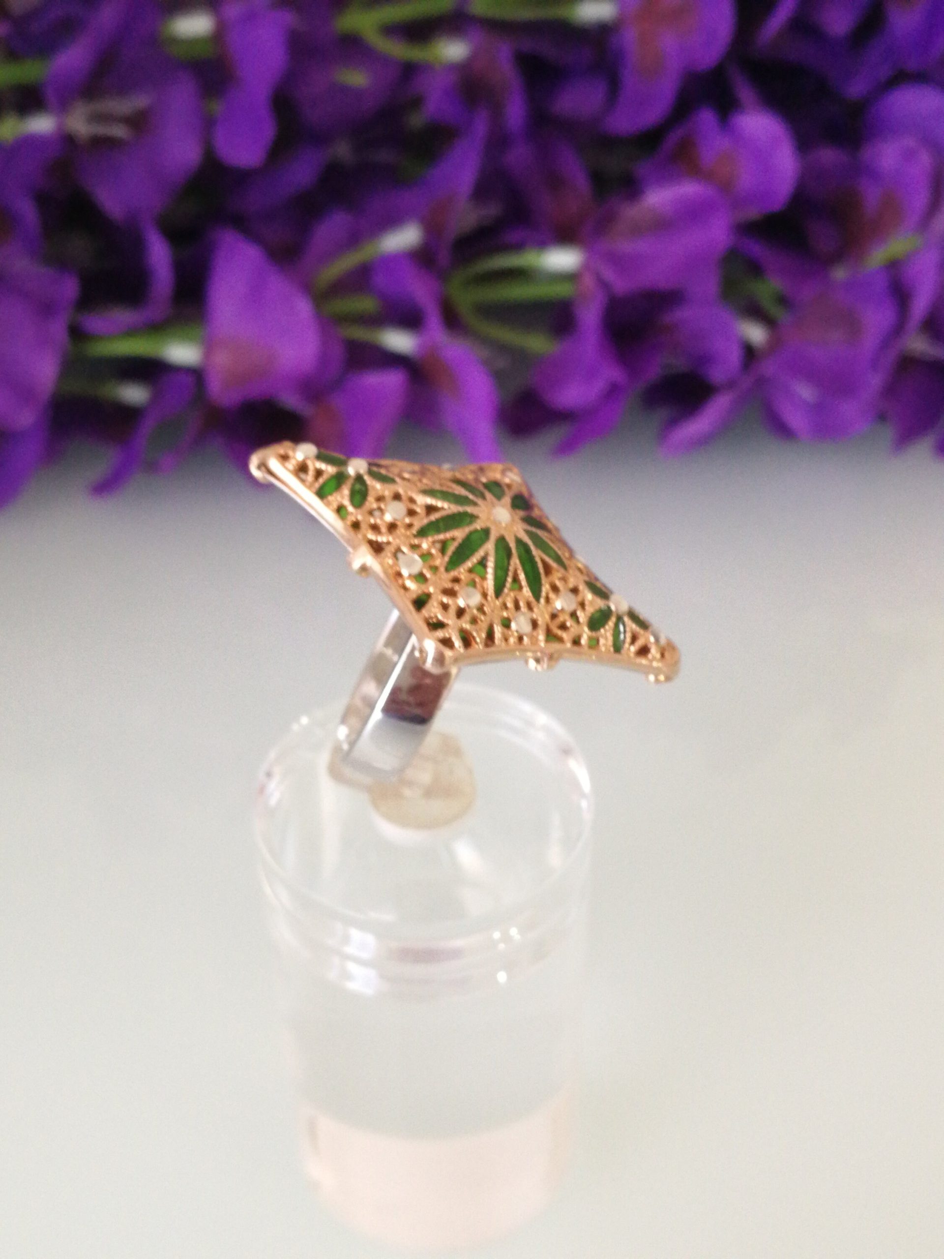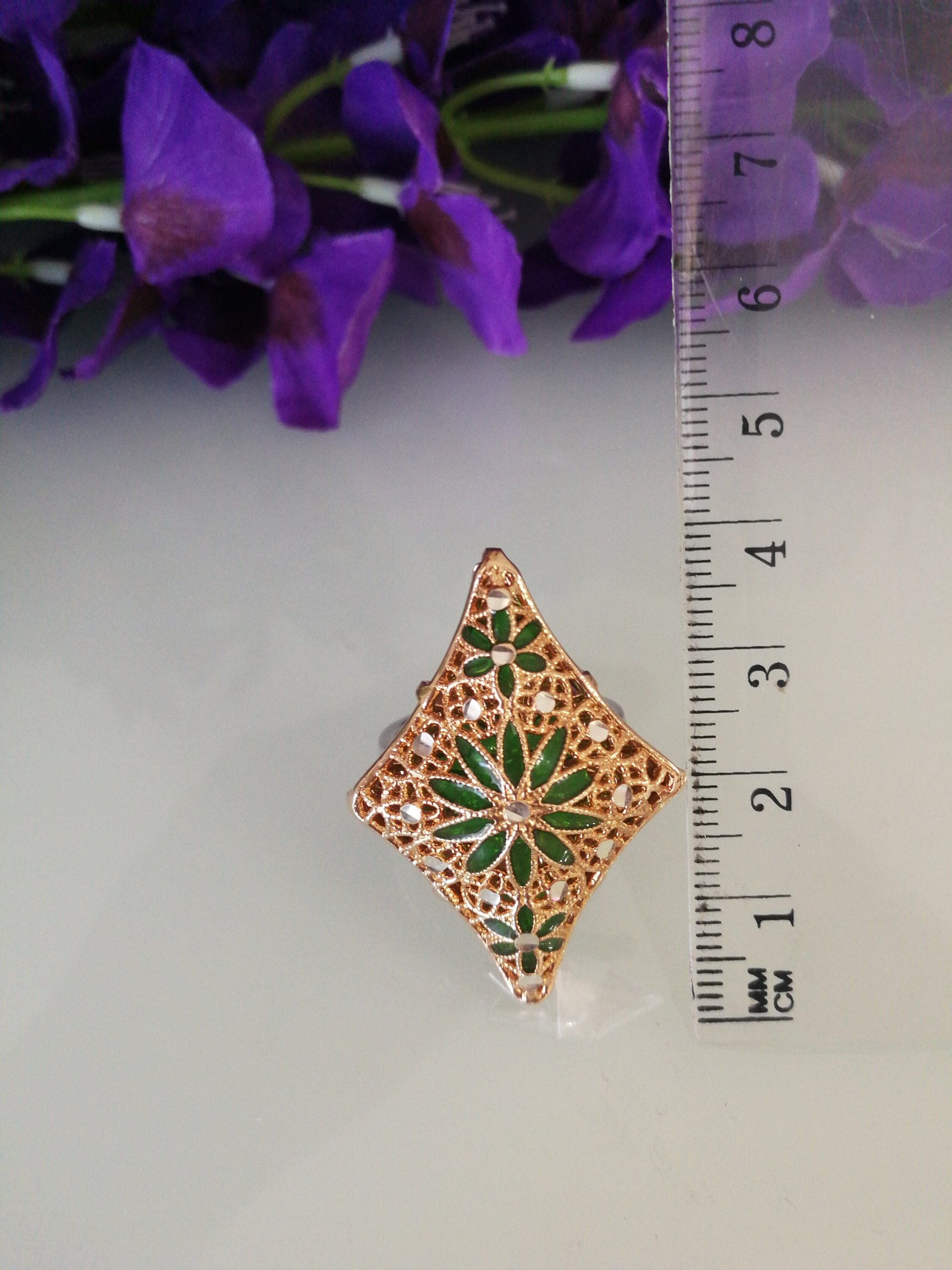 Anello elegante in stile Vintage , con pietre quarzo verde imitazione smeraldo , montatura artigianale lavorata a mano in argento placcata oro. Misura lunghezza 4 cm. Misura anello regolabile.