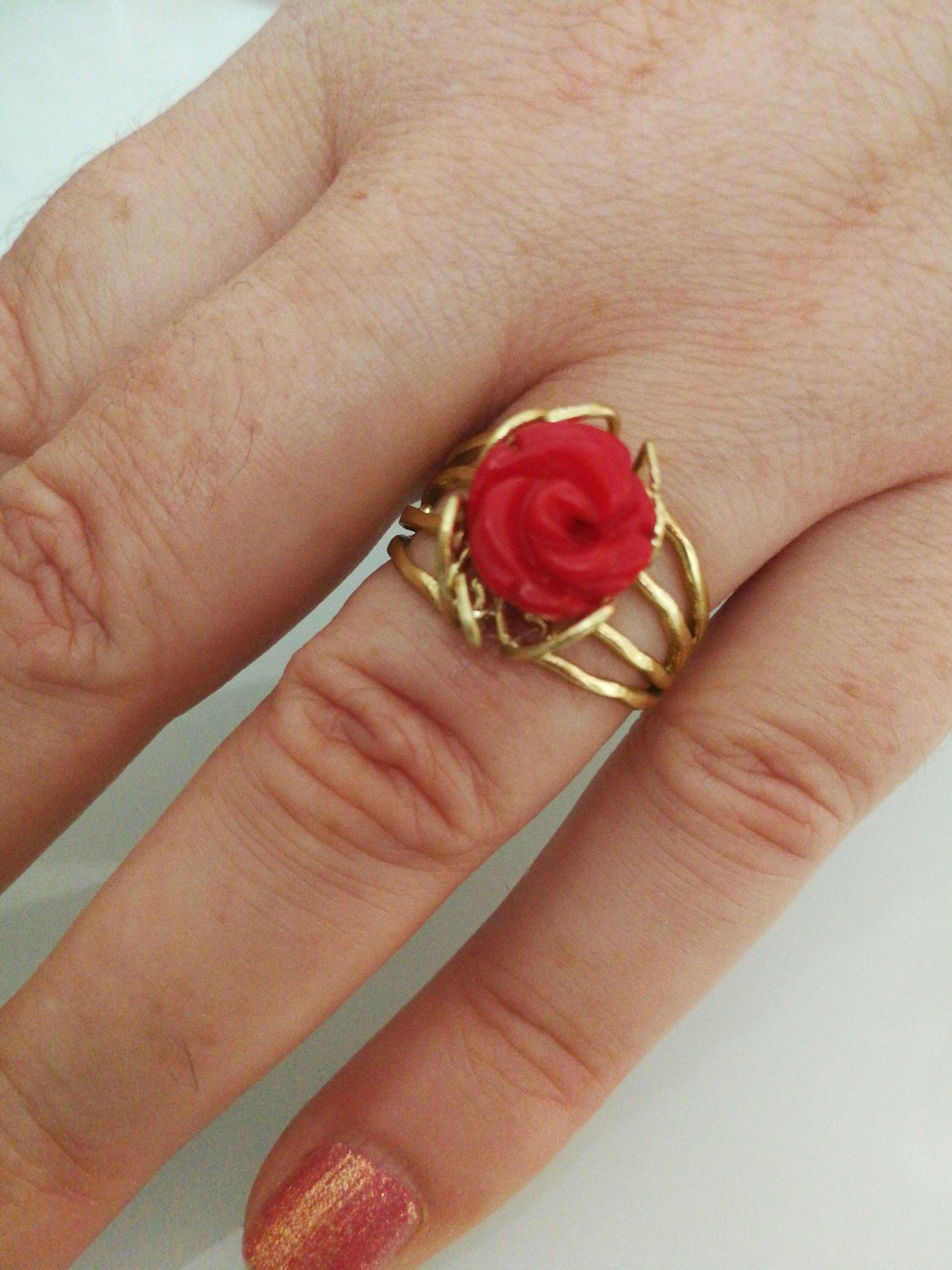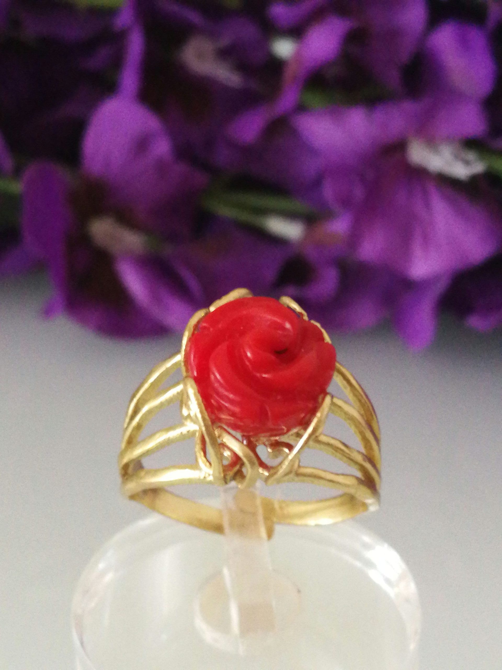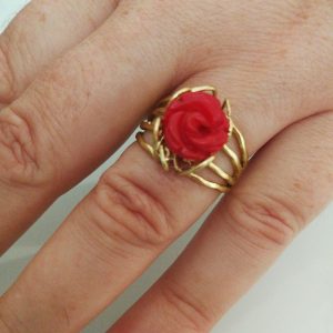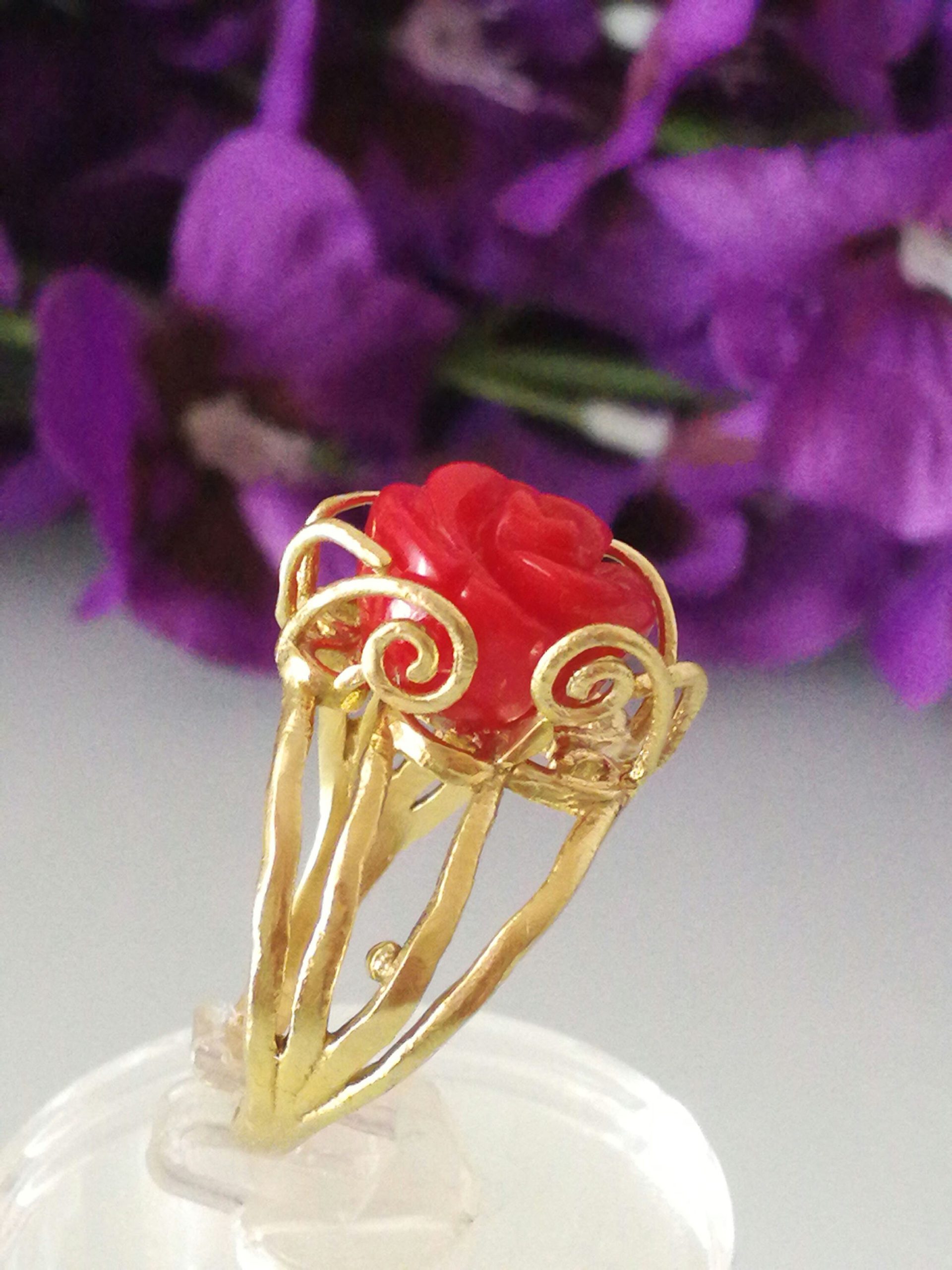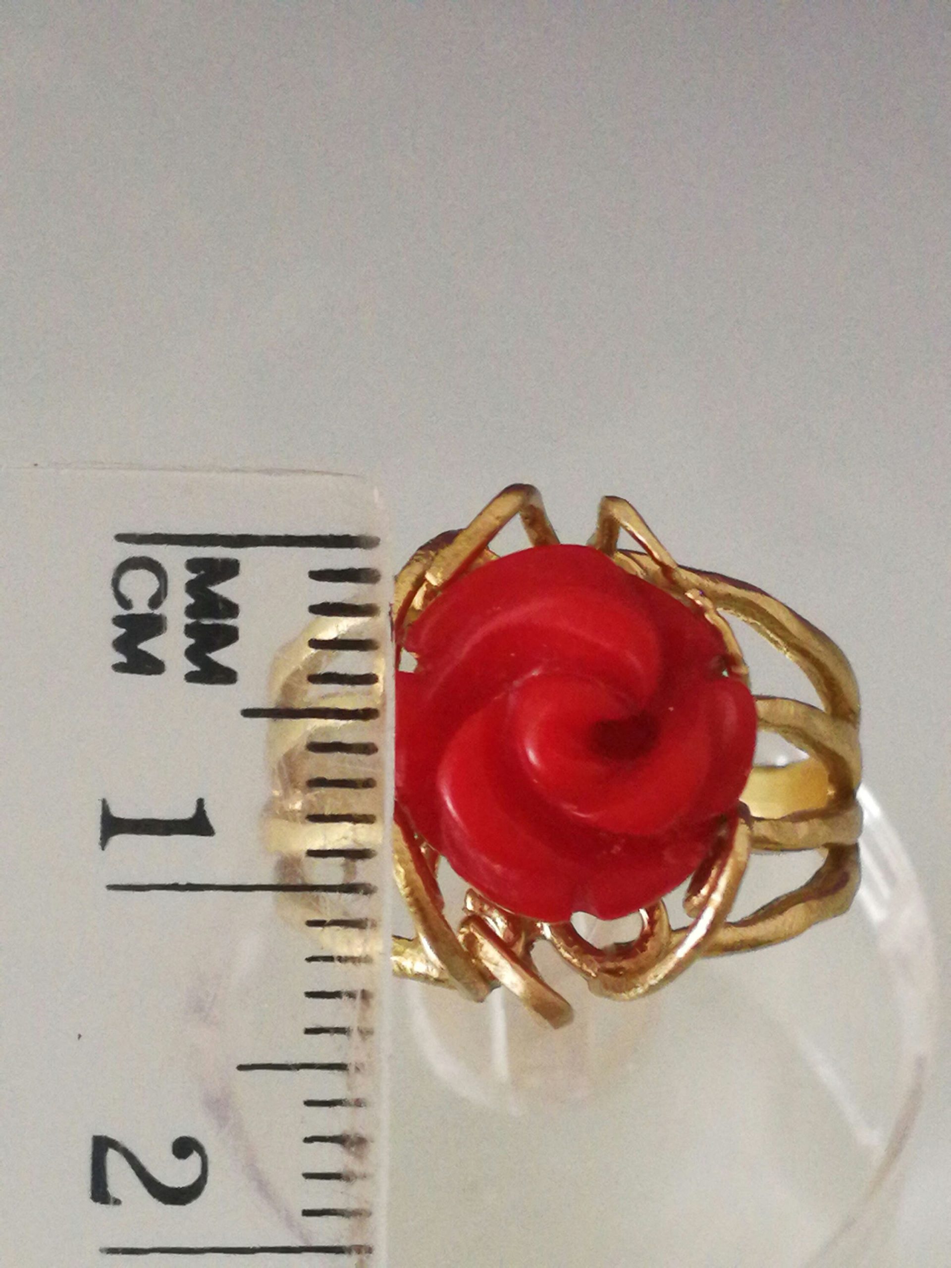 Bellissimo anello con rosa in corallo rosso naturale di Taiwan, montatura artigianale in ottone dorato. Misura della rosa diametro 1 cm. Misura anello regolabile.