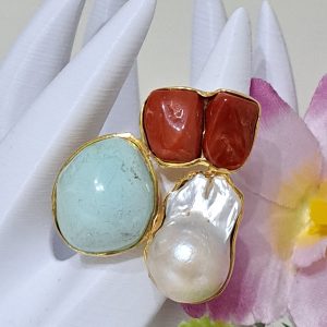Anello perla barocca bianca, turchese e corallo rosso , anello argento 925, gioielli italiani