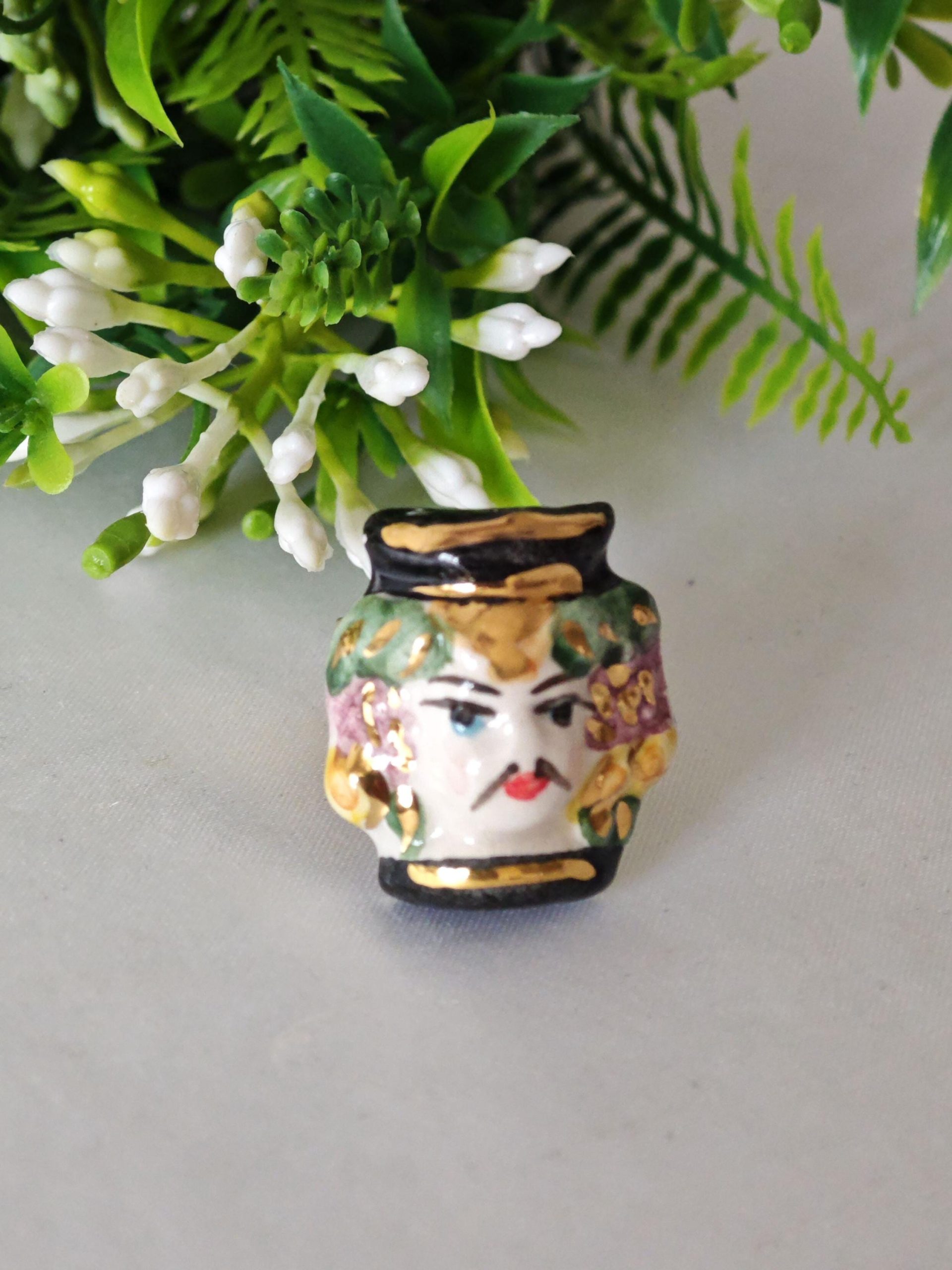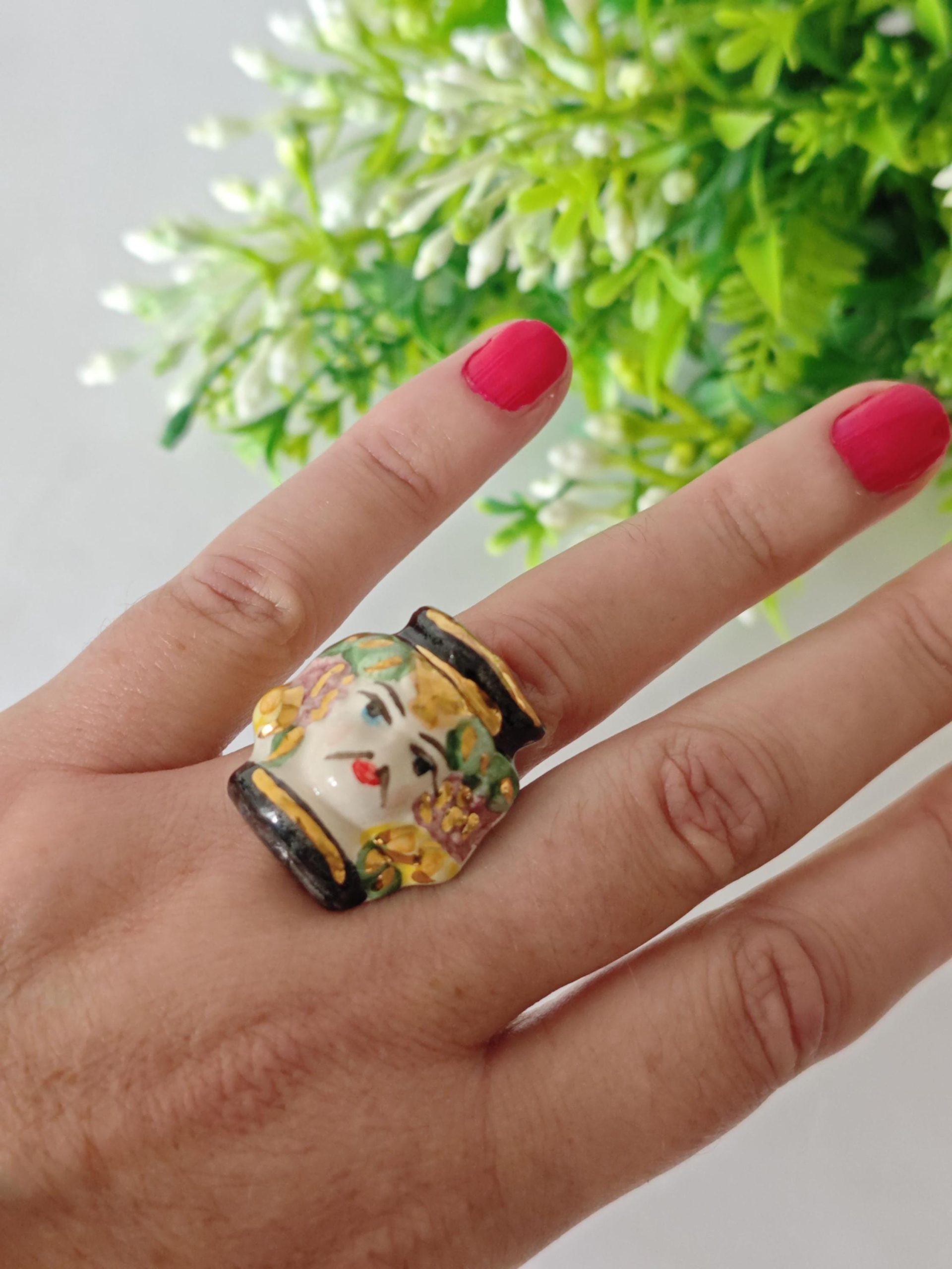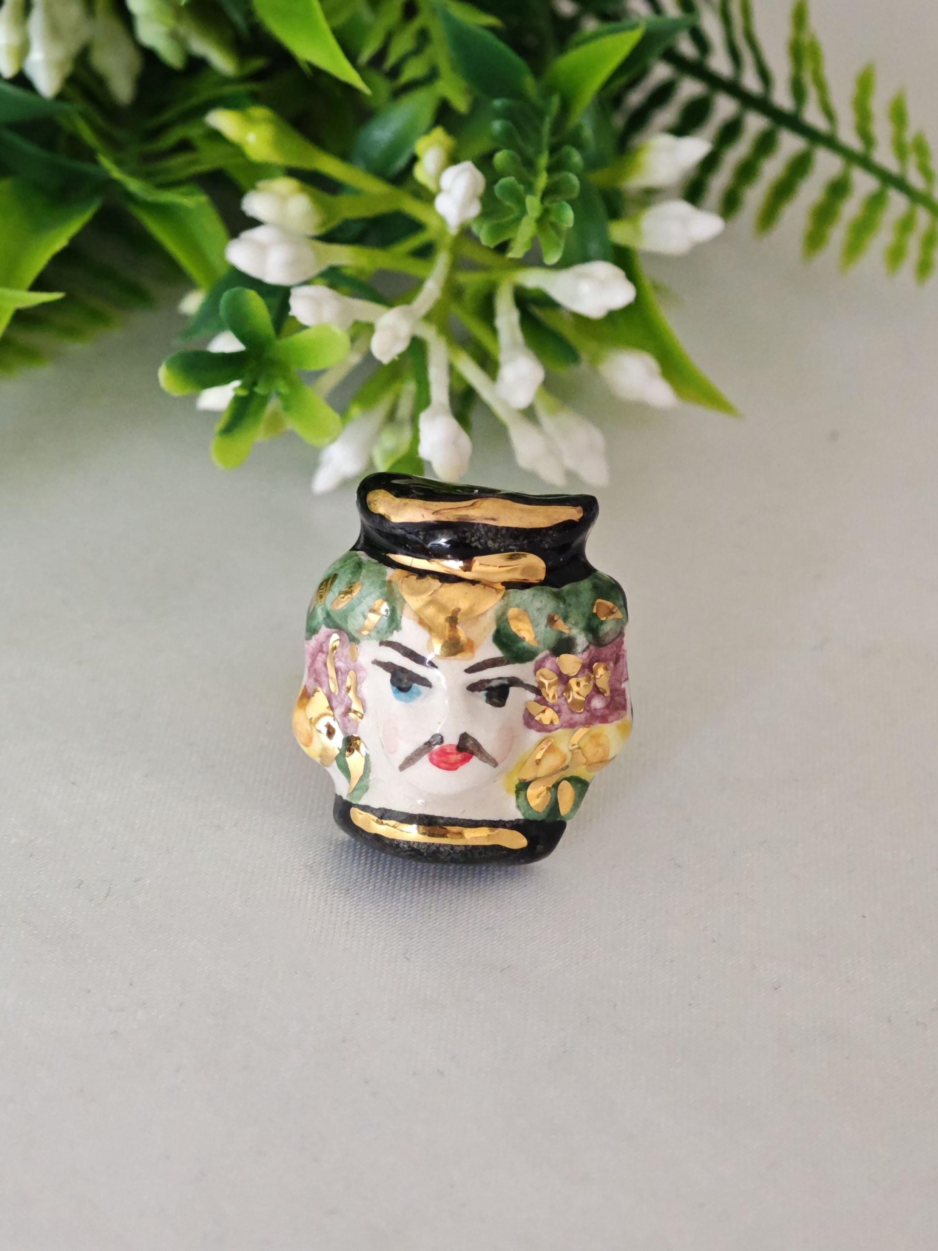 Anello con base in ottone dorato con testa di moro in ceramica di Caltagirone realizzata e dipinta a mano con applicazioni foglia oro 22 kt , 2,8 cm dimensioni