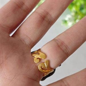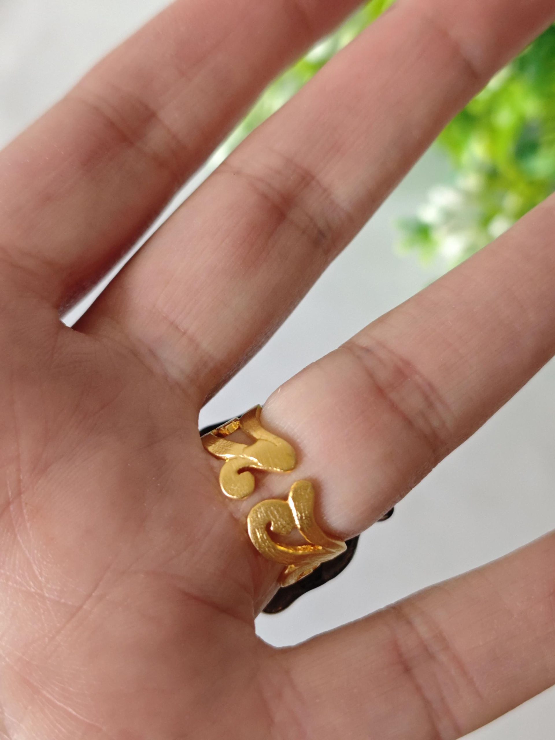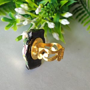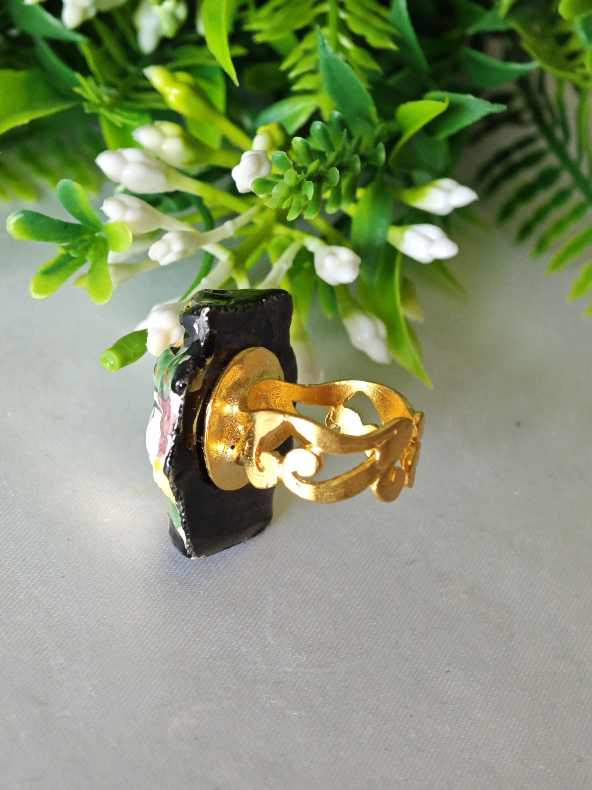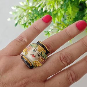 Anello con base in ottone dorato con testa di moro in ceramica di Caltagirone realizzata e dipinta a mano con applicazioni foglia oro 22 kt , 2,8 cm dimensioni