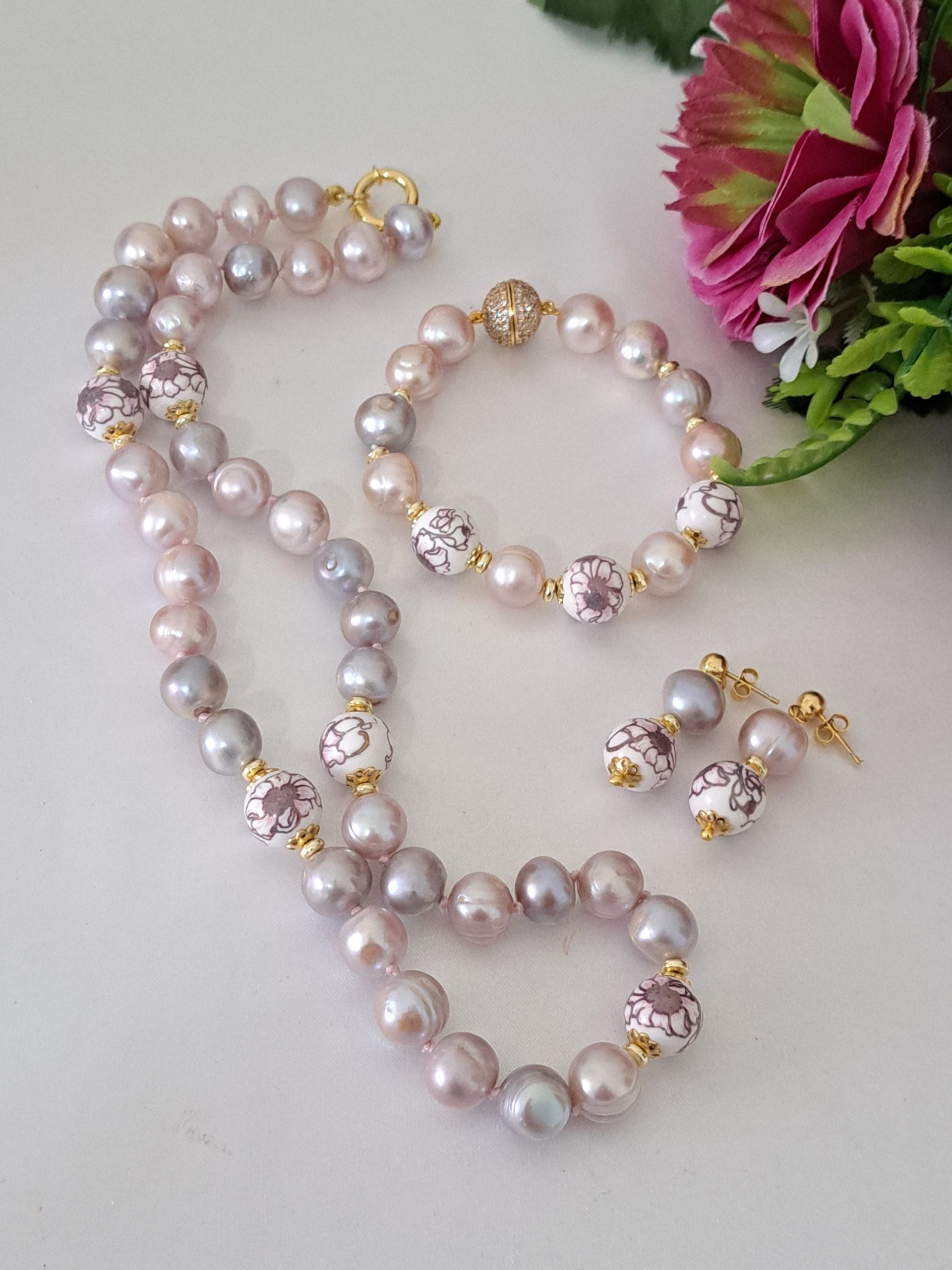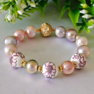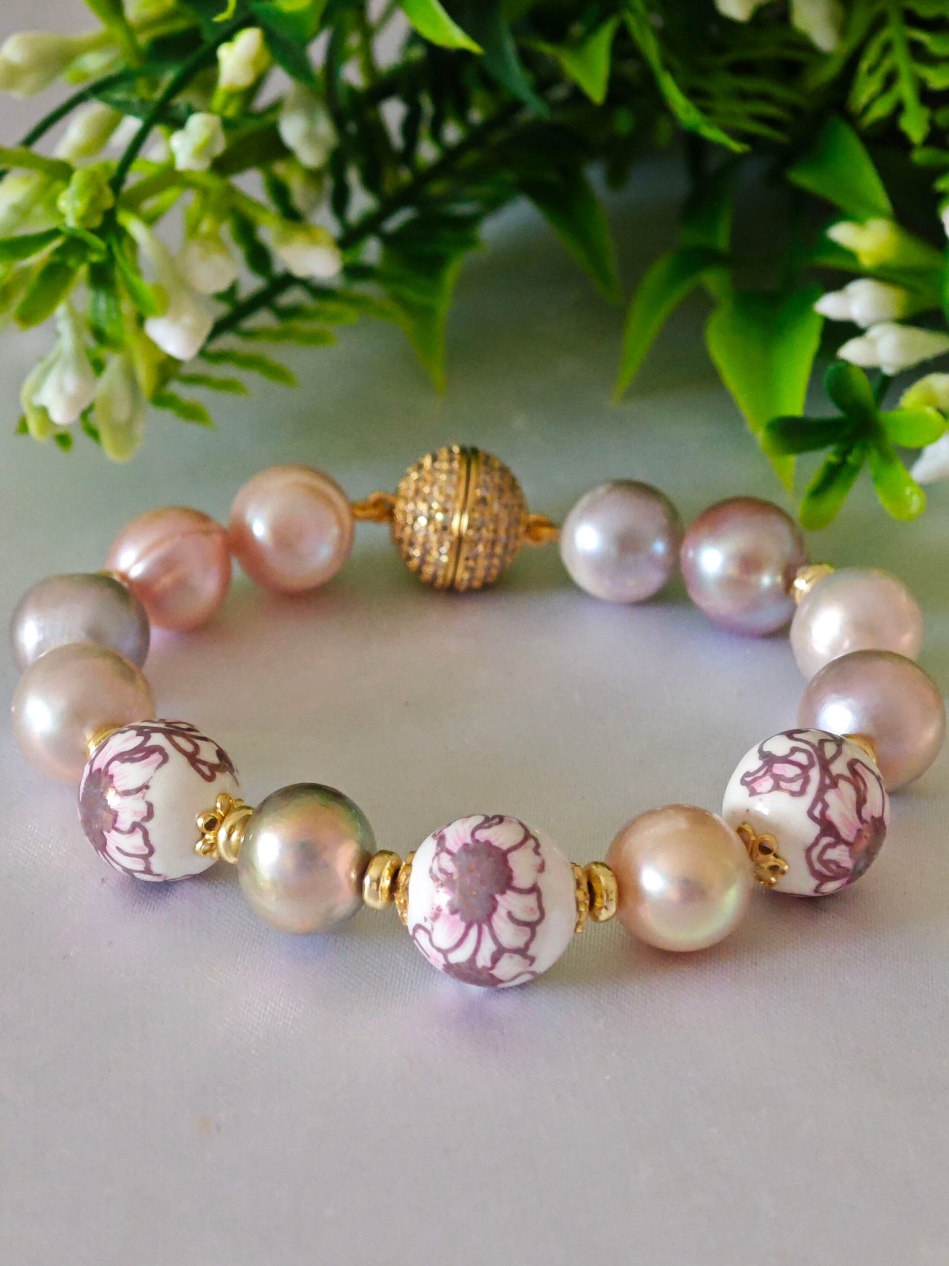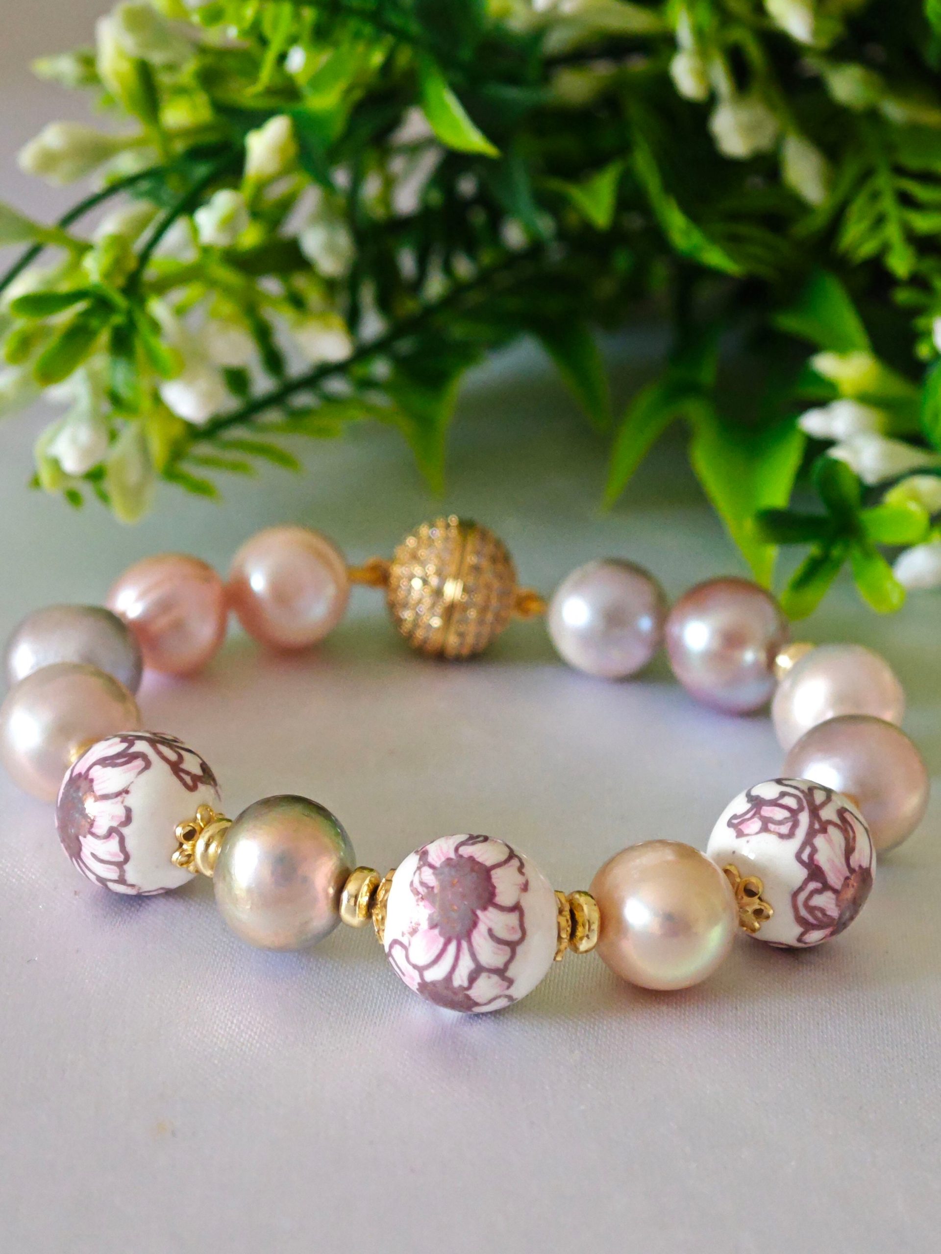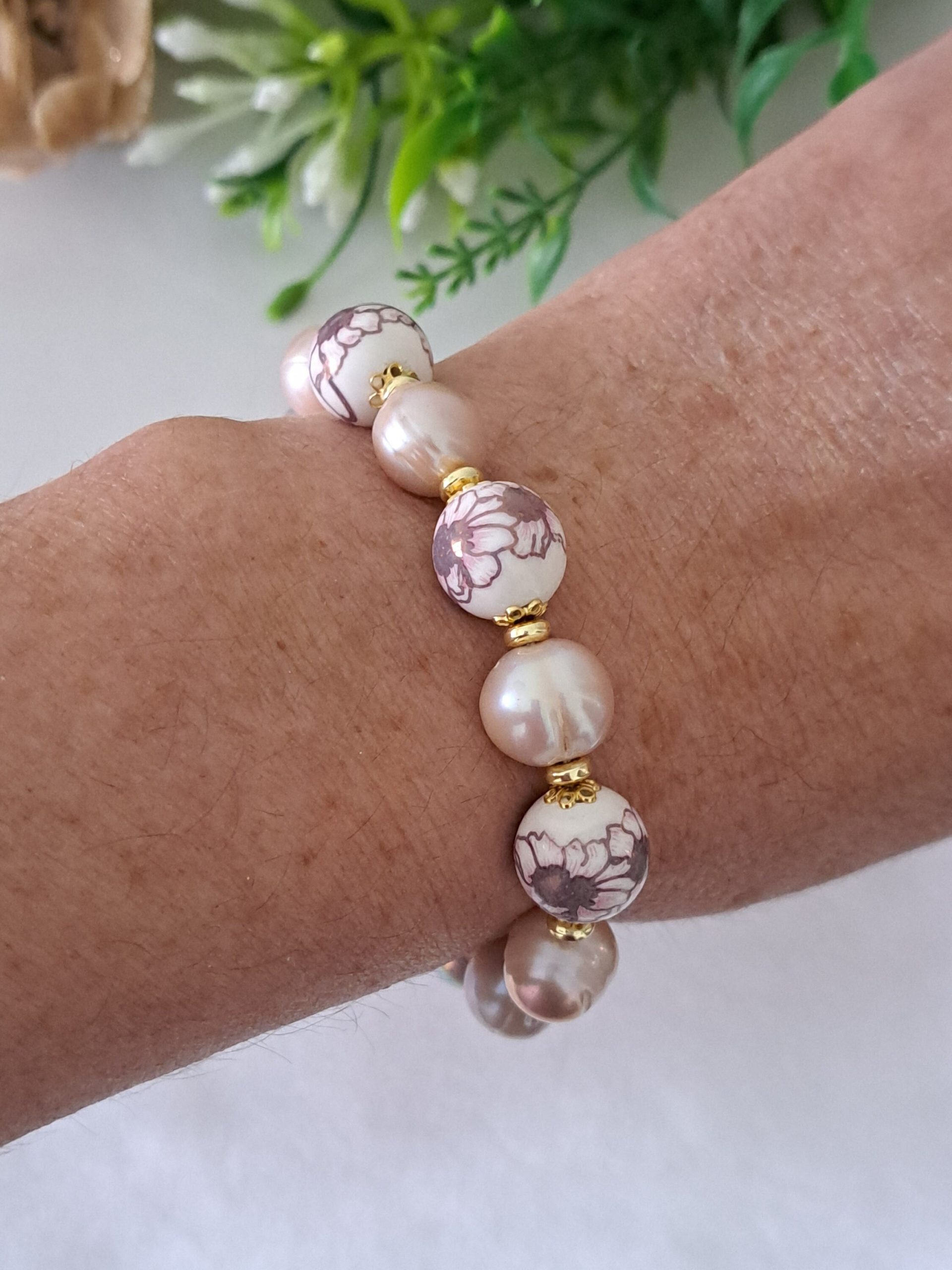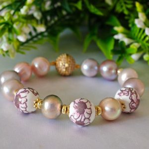 Bracciale realizzato a mano con perle naturali rosa 11 mm e perle porcellana cinese dipinta.