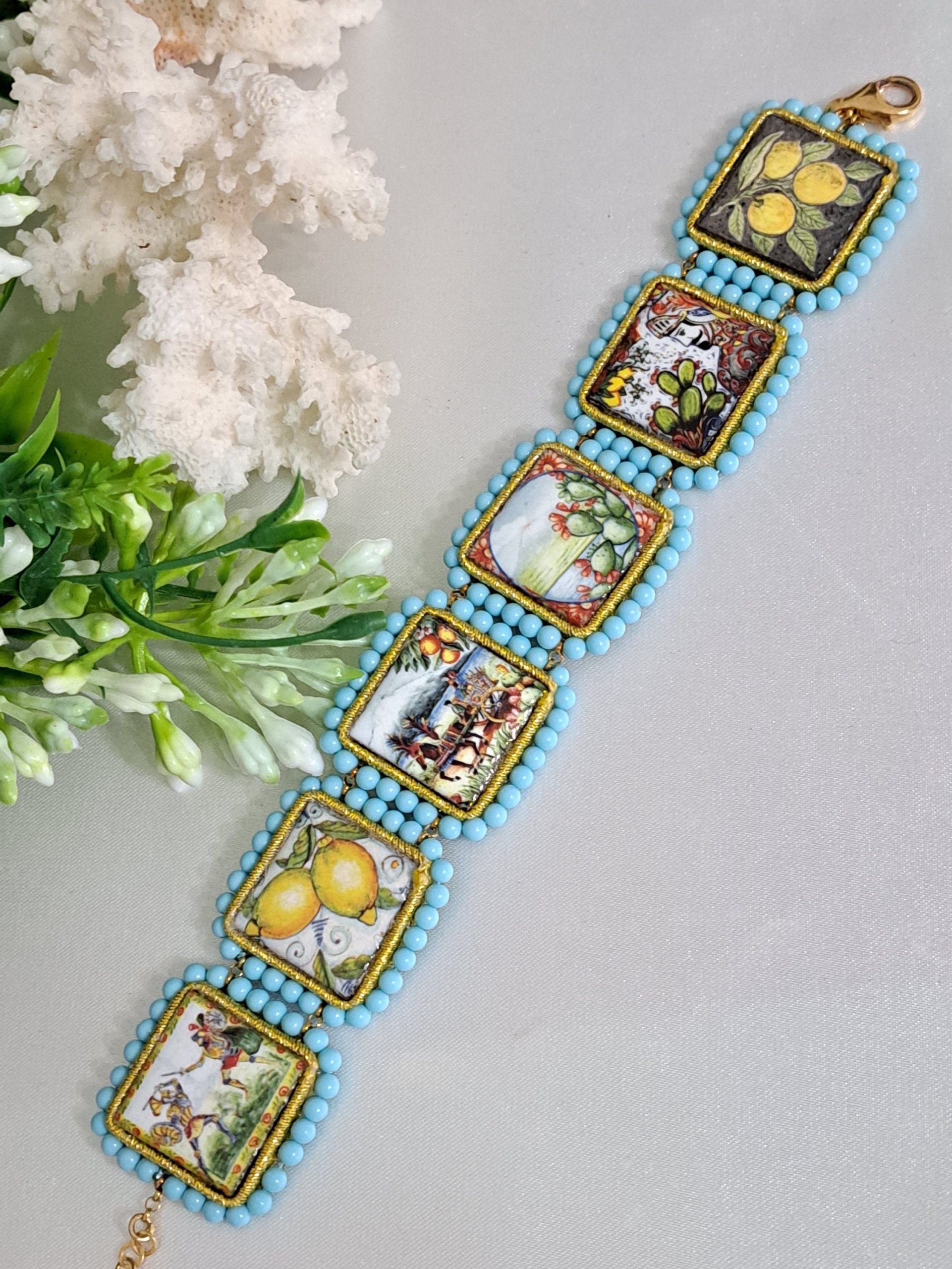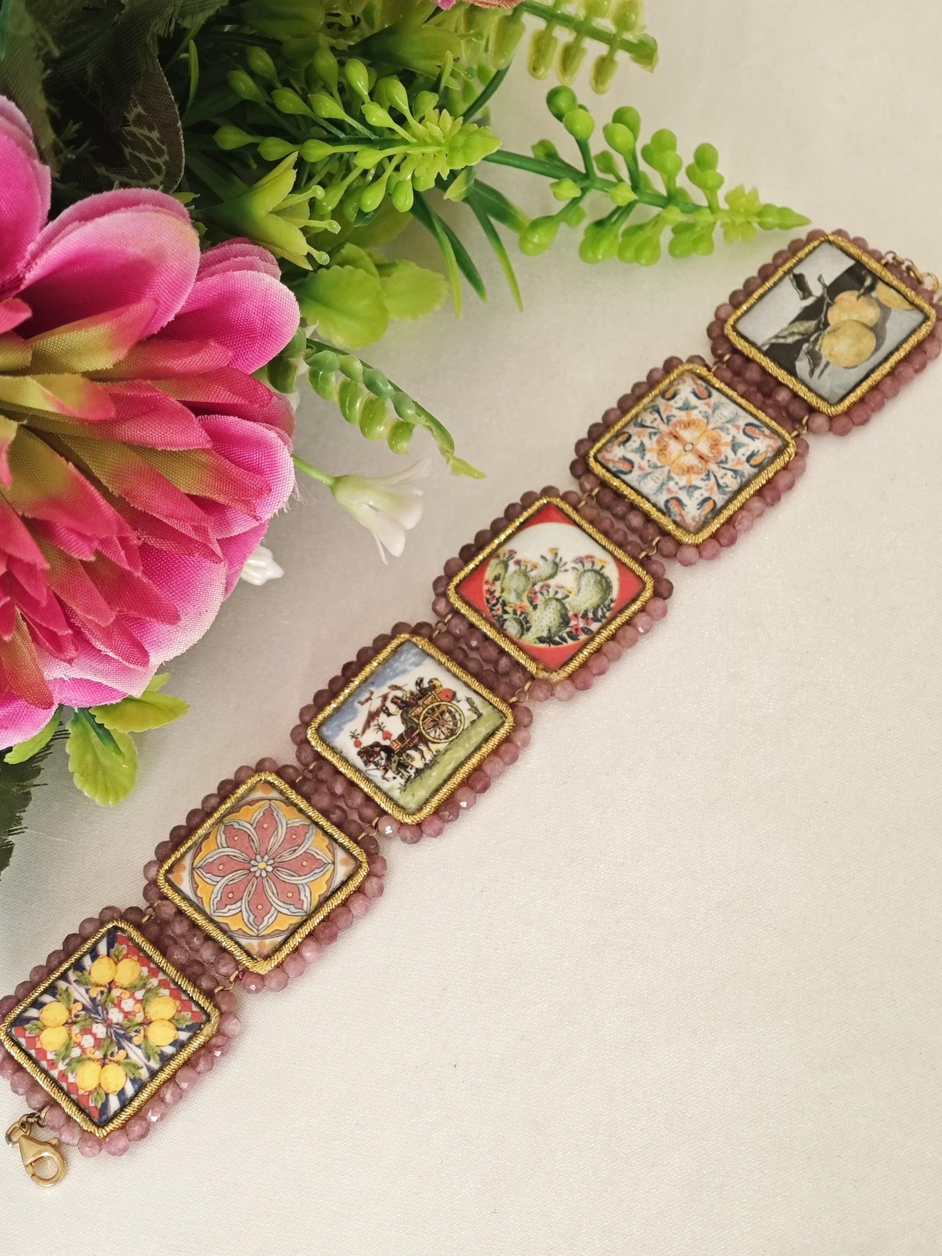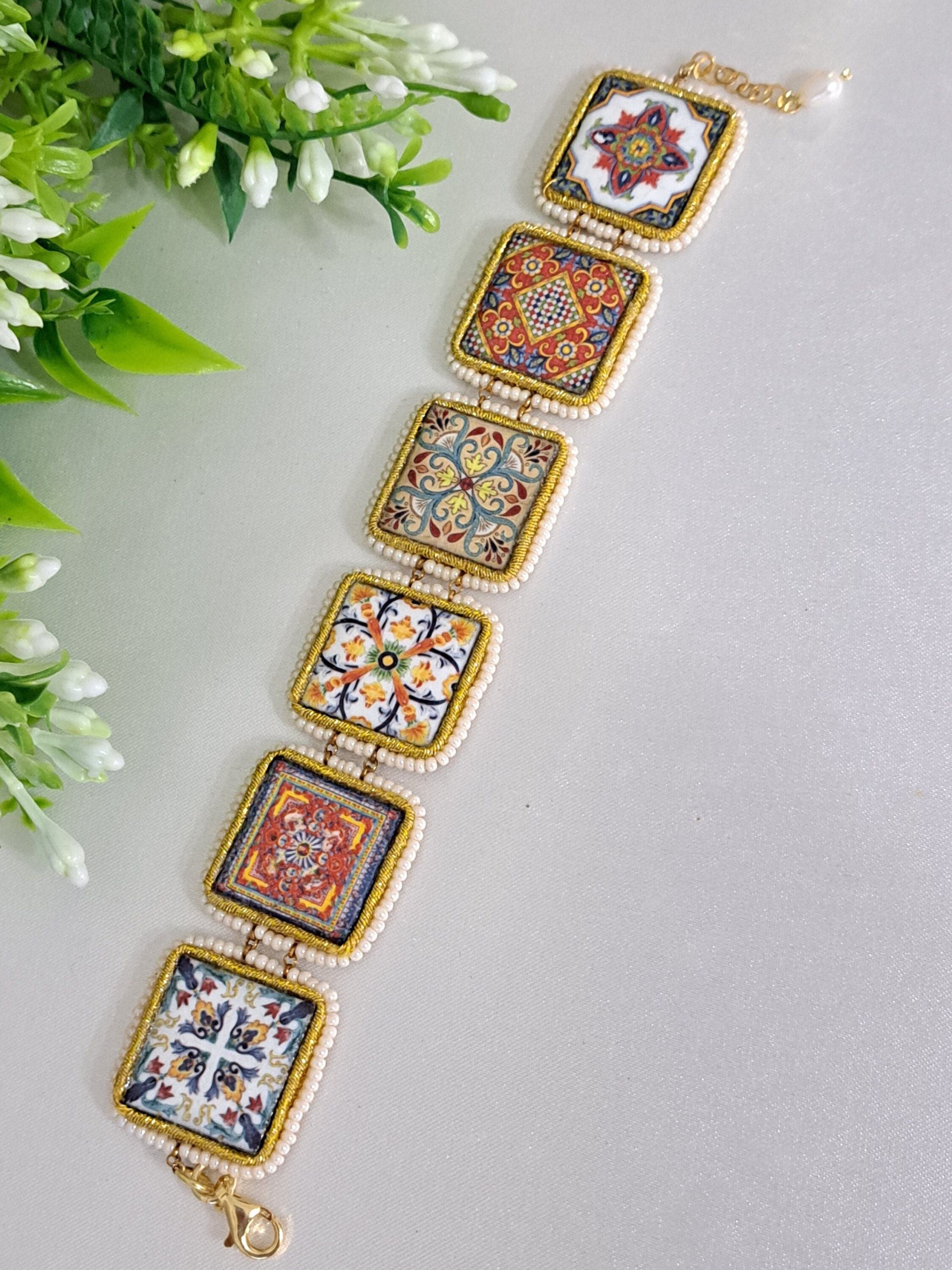 Bracciale ceramica Caltagirone, bracciale piastrelle con cornice perline , bracciale siciliano