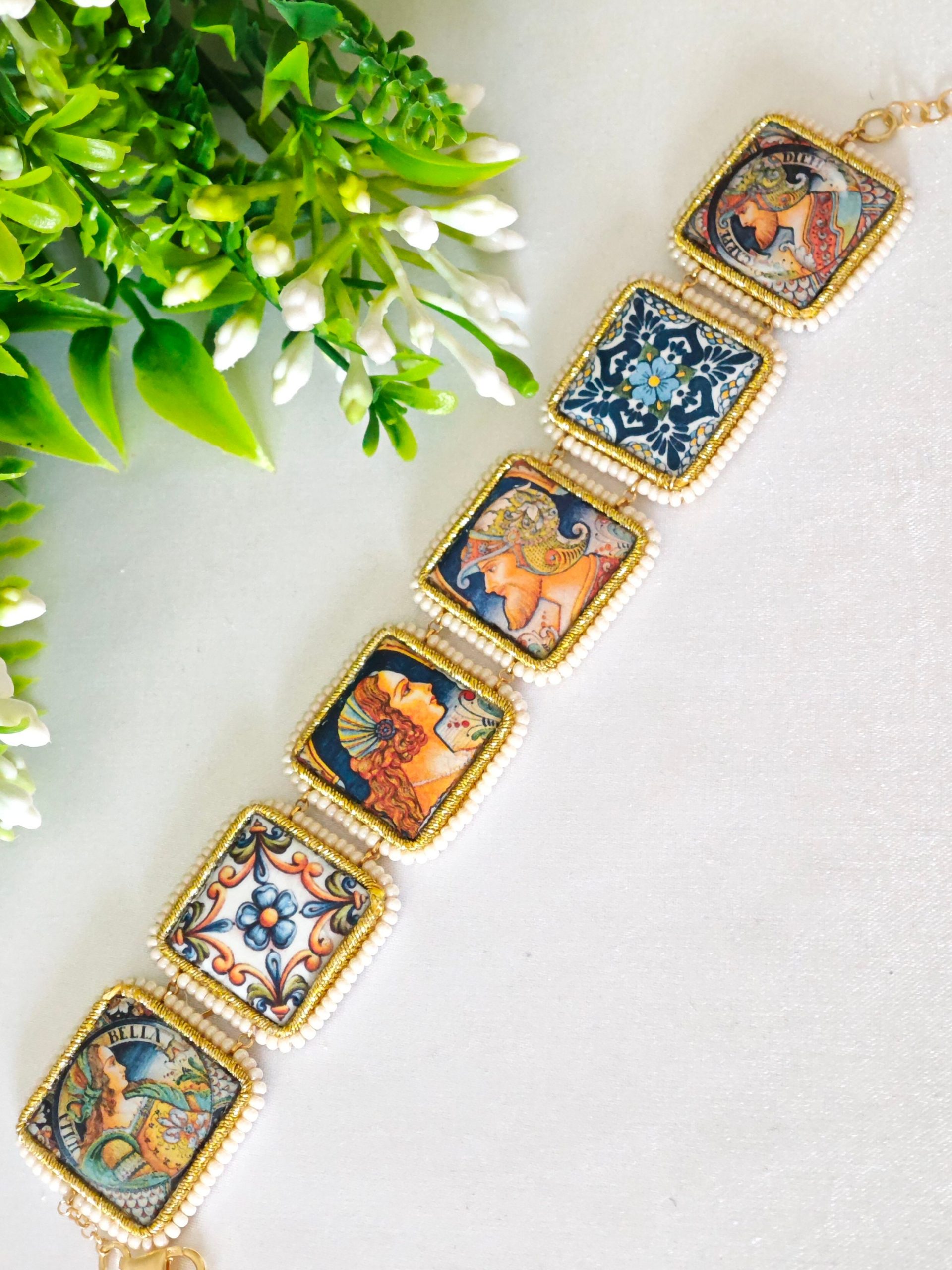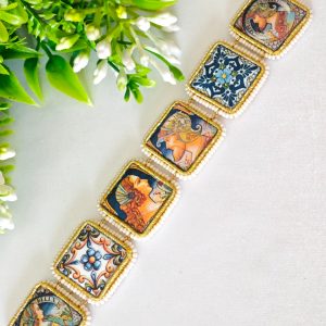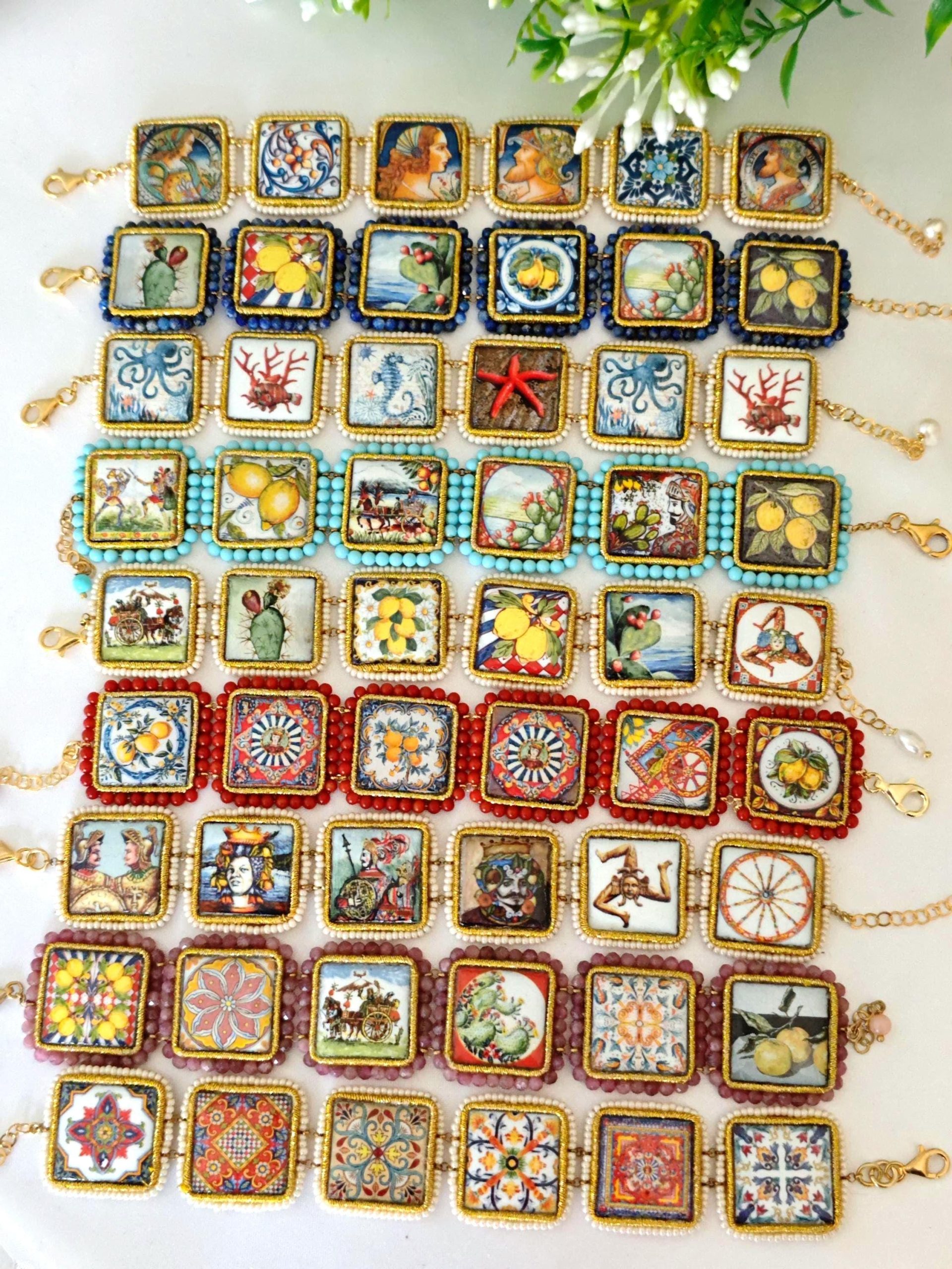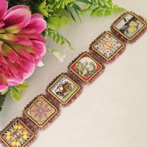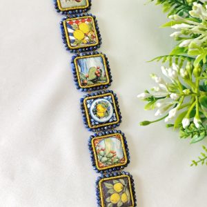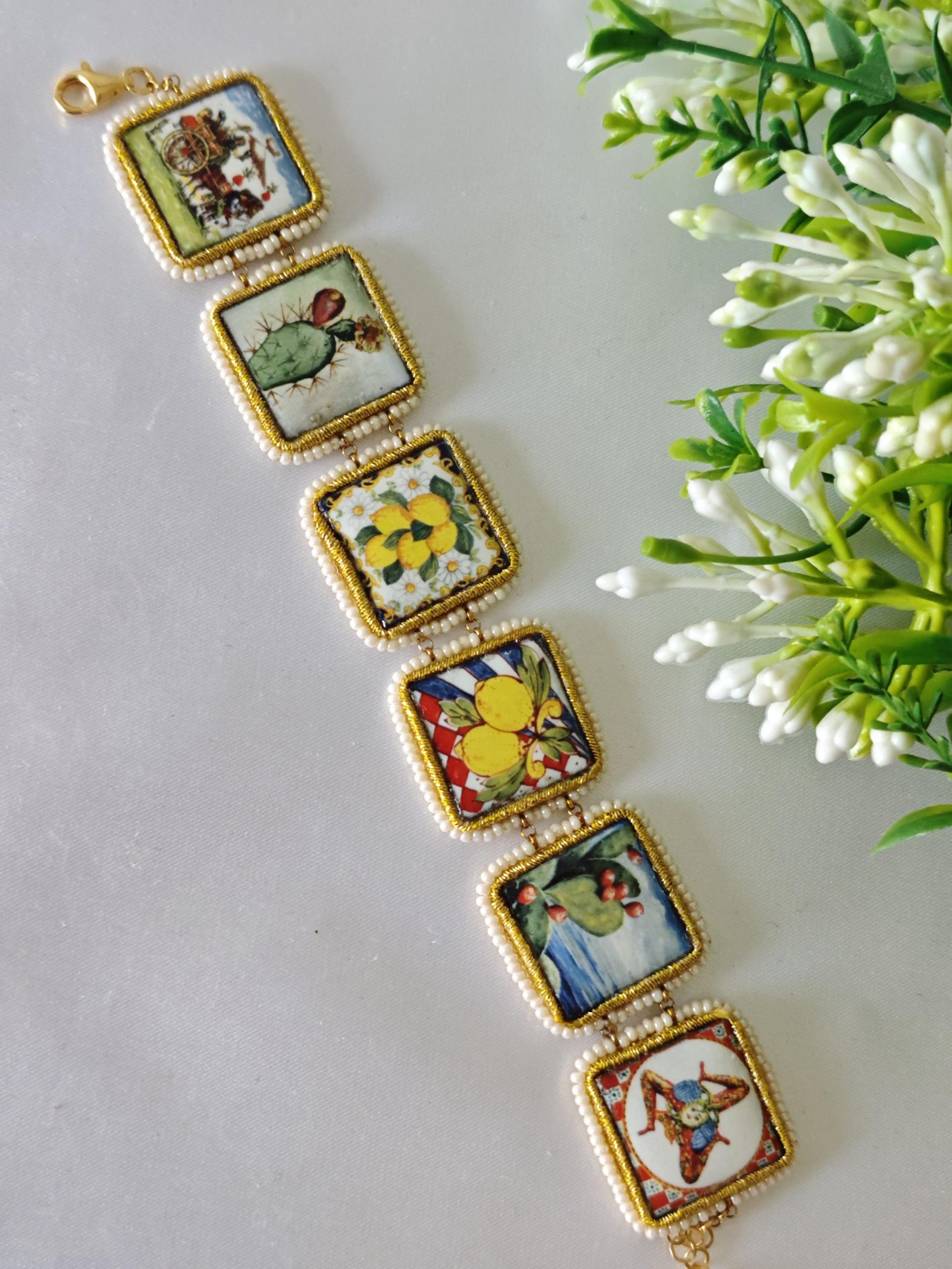 Bracciale ceramica Caltagirone, bracciale piastrelle con cornice perline , bracciale siciliano