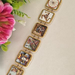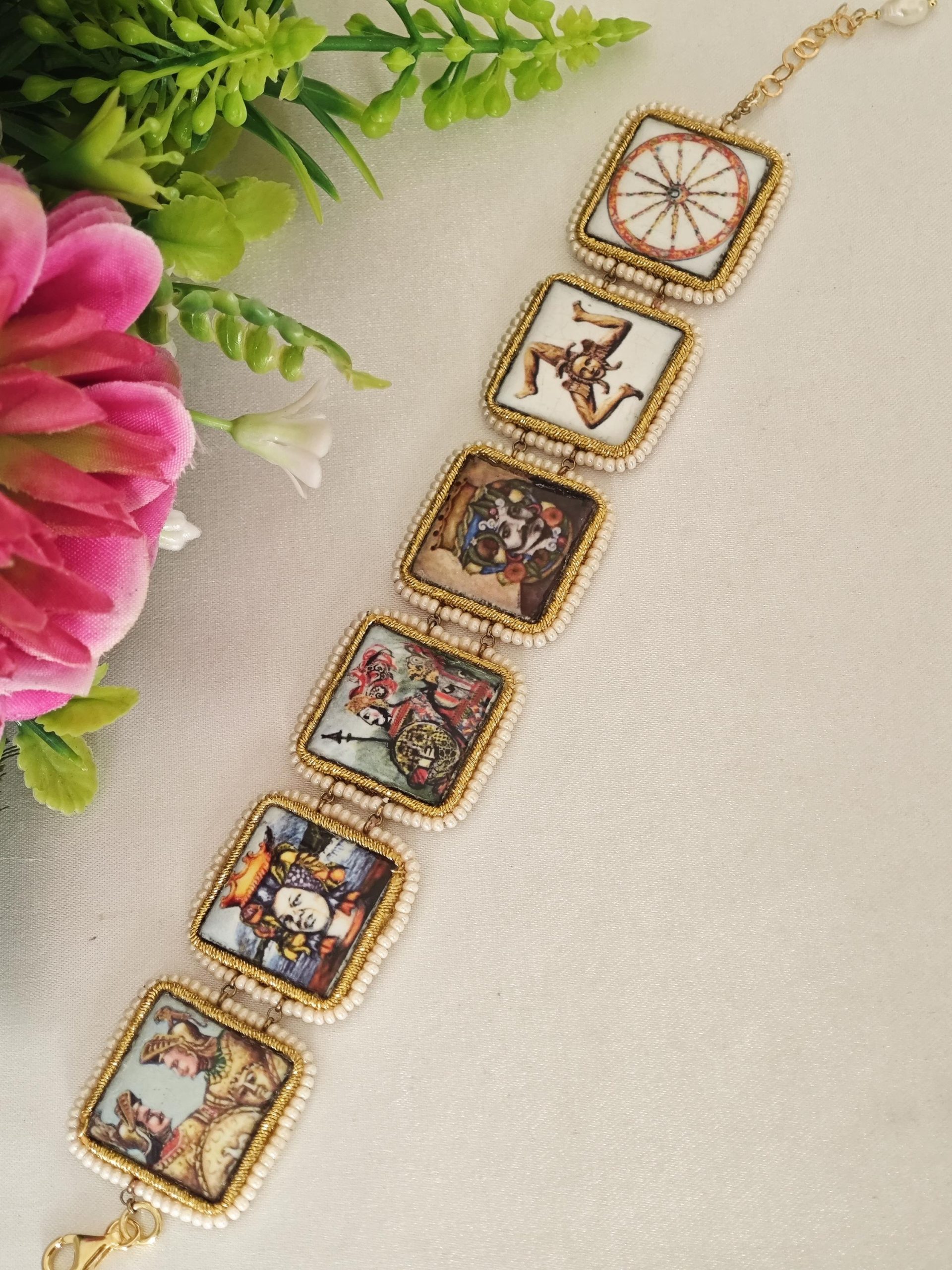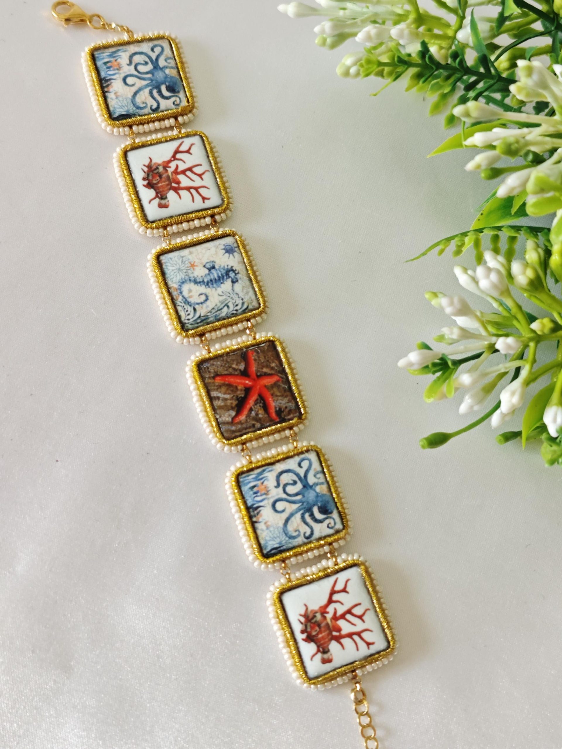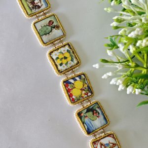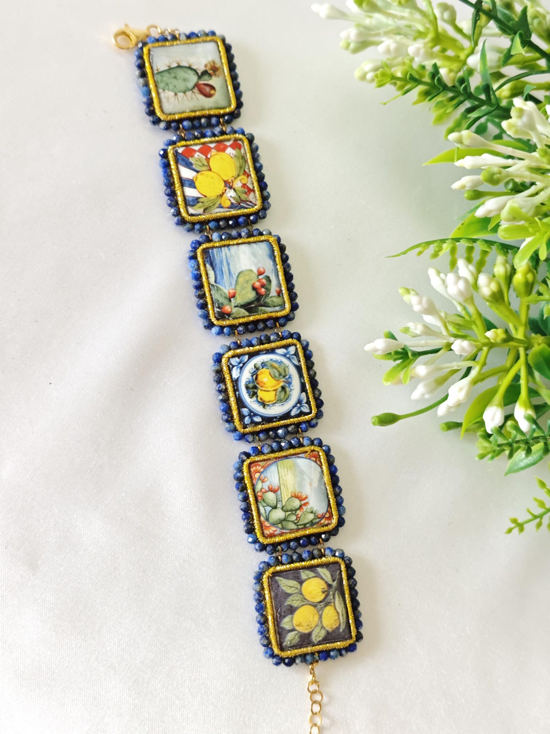 Bracciale realizzato con 6 piastrelle in pietra lavica smaltata con motivi Caltagirone 2×2 cm , incorniciate con perline piccole , chiusura a moschettone in argento 925 placcato oro. .