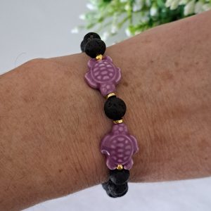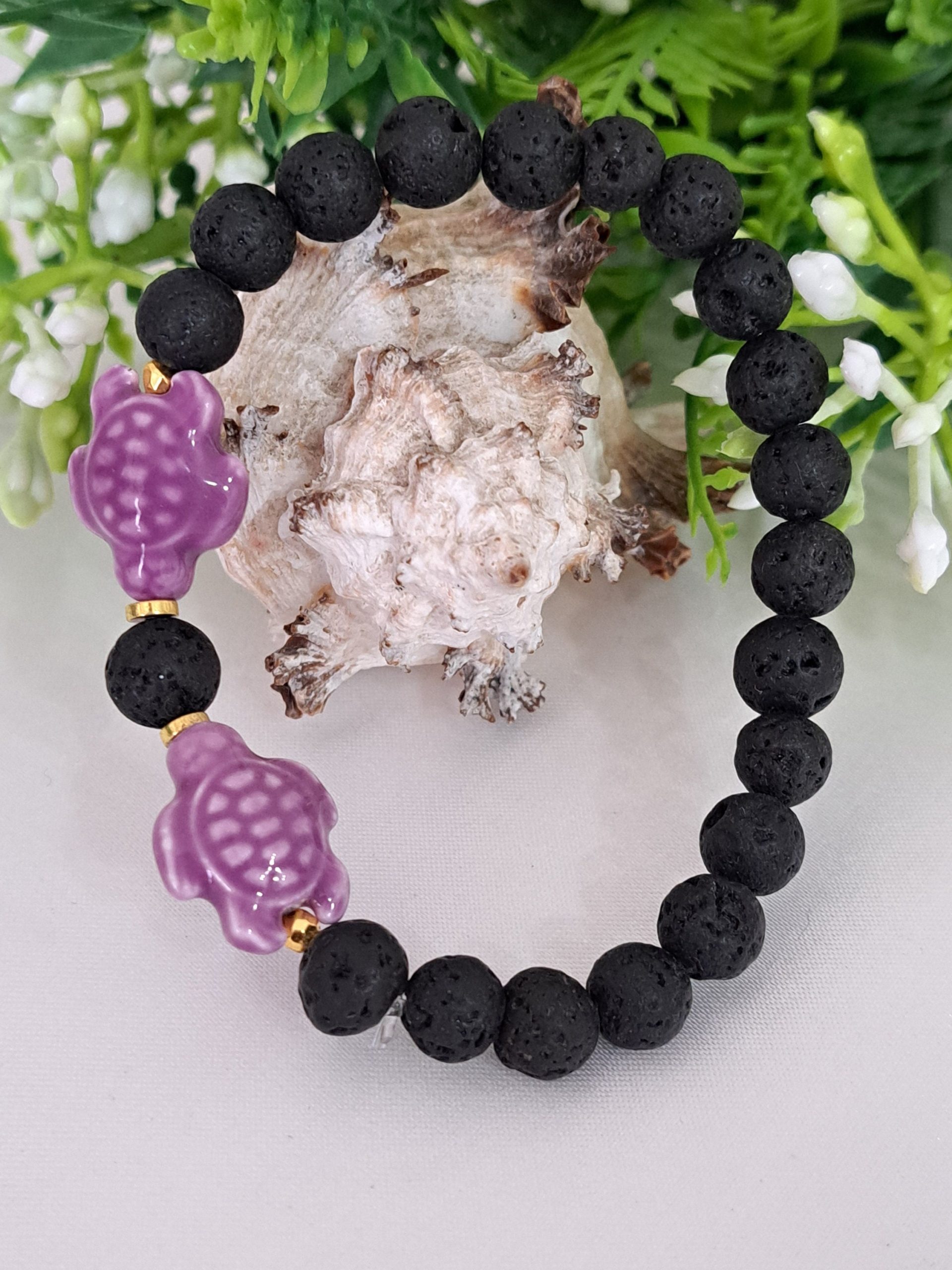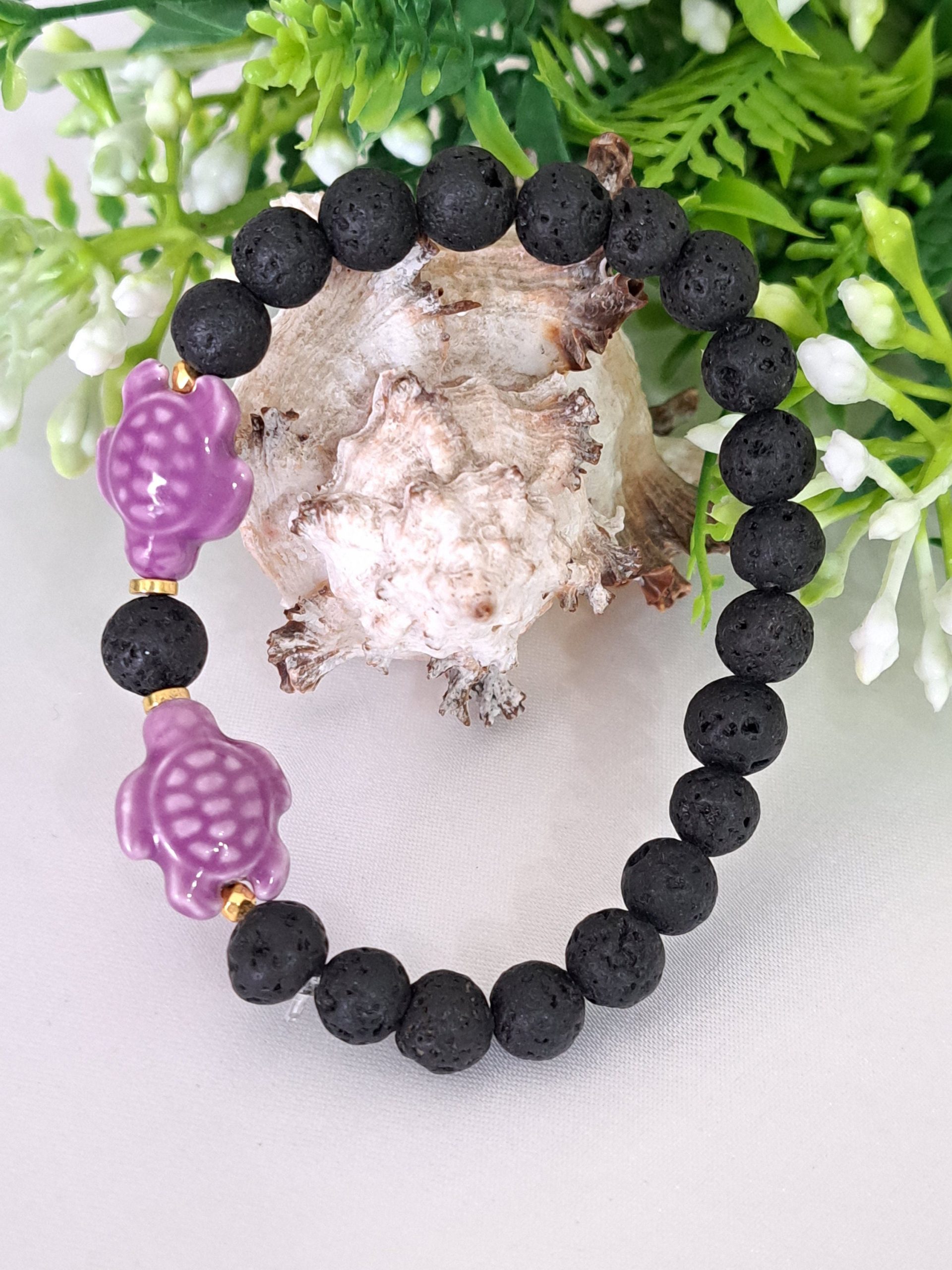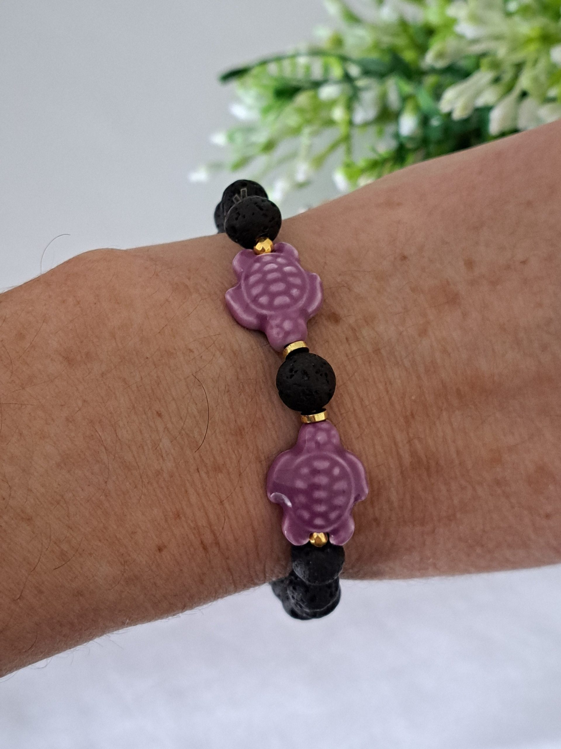 Bracciale elastico realizzato con tartarughe in ceramica di Caltagirone realizzata e dipinta a mano e con perle pietra lavica 8 mm