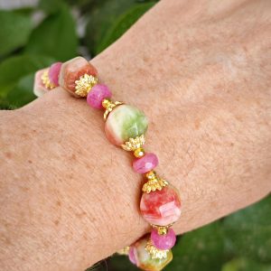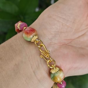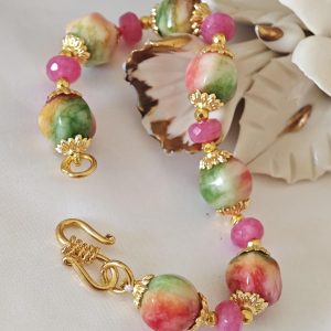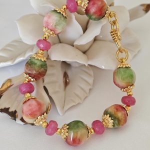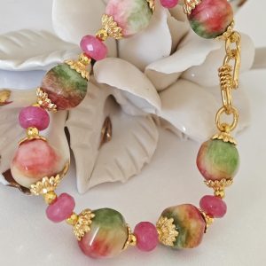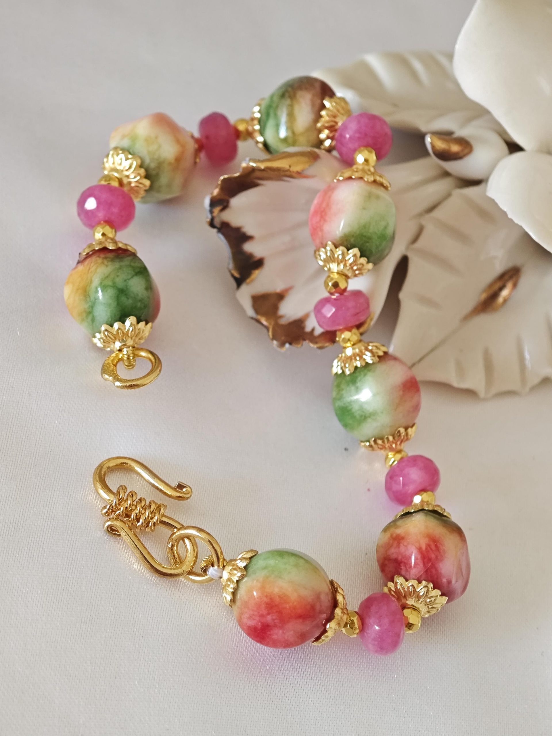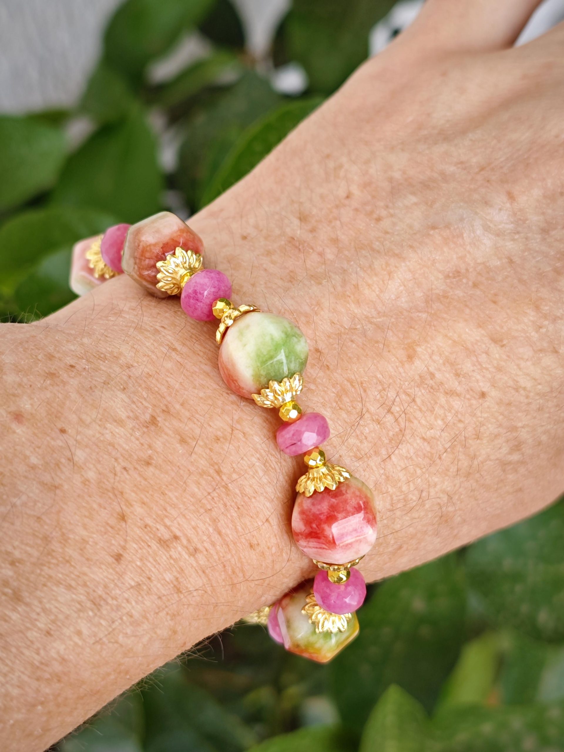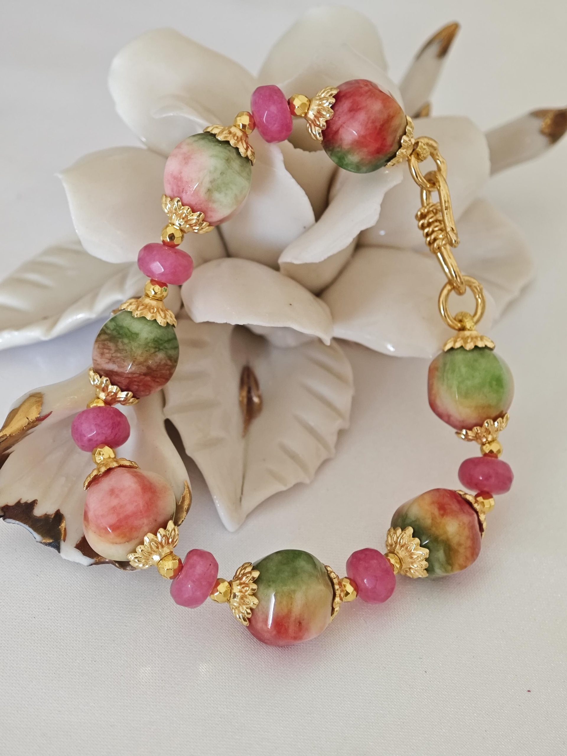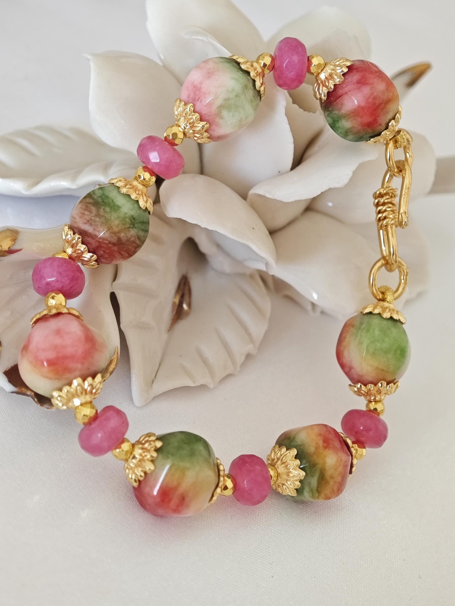 Bracciale realizzato a mano con pietre dure giada verde/rosa 12 mm , pietre a rondella angelite rosa decorate con copriperle in ottone dorato .