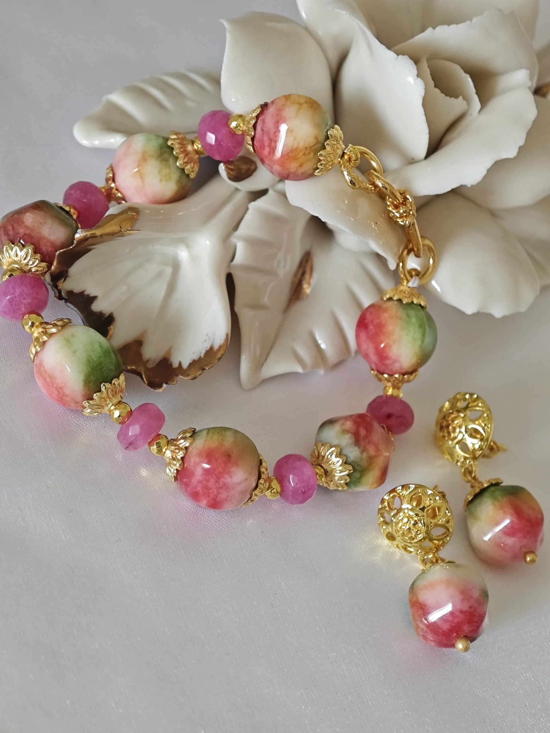 Bracciale con orecchini pietre dure giada , angelite rosa e ottone dorato, set pietre dure giada