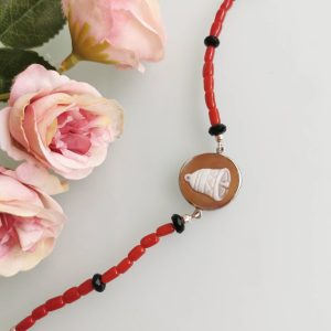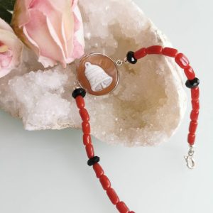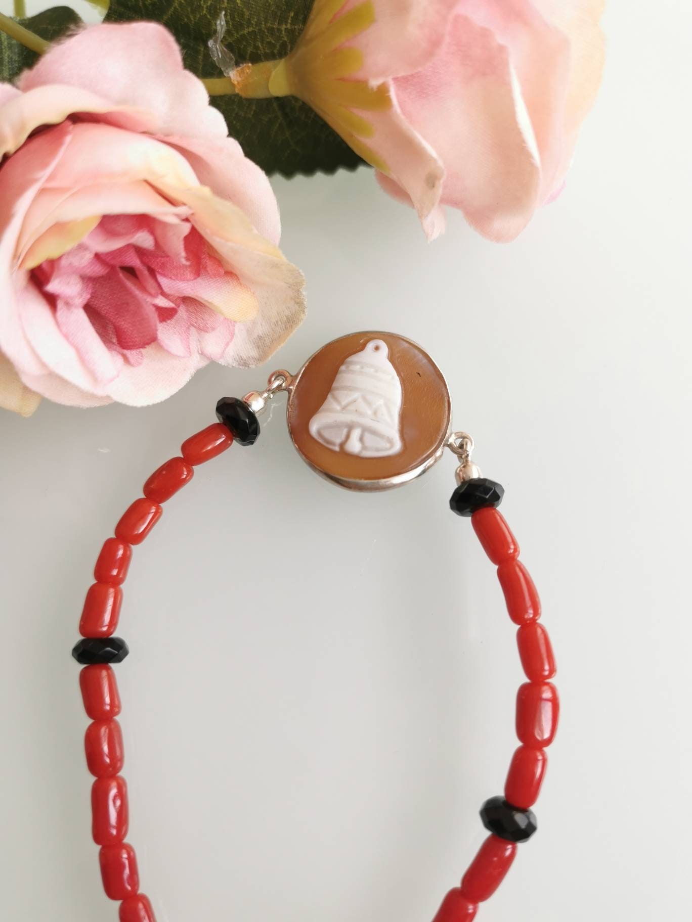 Bracciale artigianale realizzato con perline corallo rosso naturale mediterraneo e cammeo in conchiglia sardonica scolpita a mano a Torre del greco raffigurante campanella, 2 cm diametro incastonata in argento 925 ..