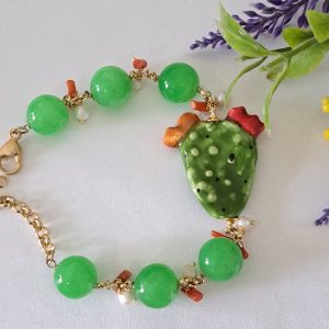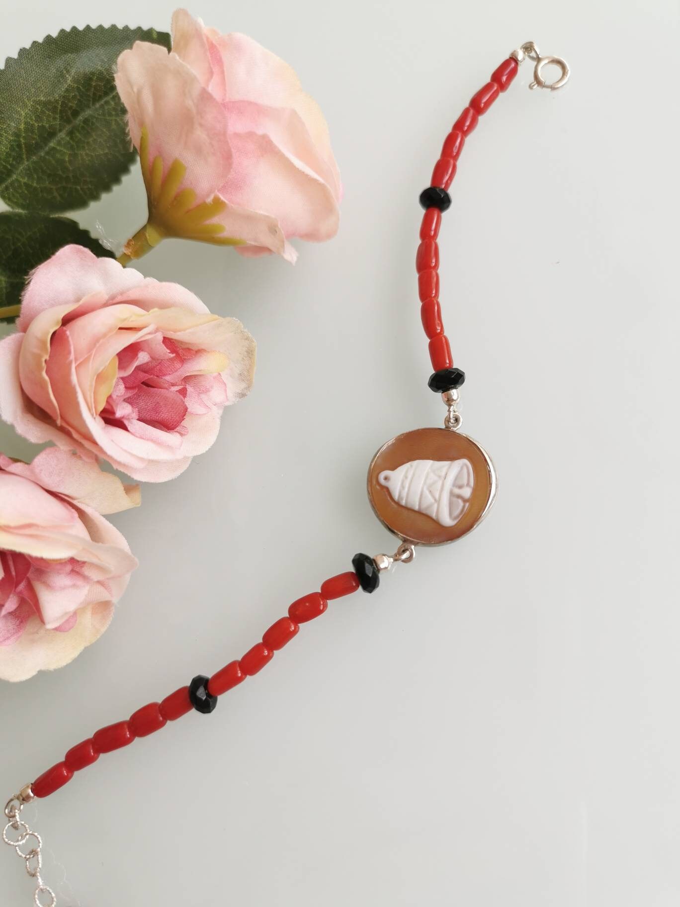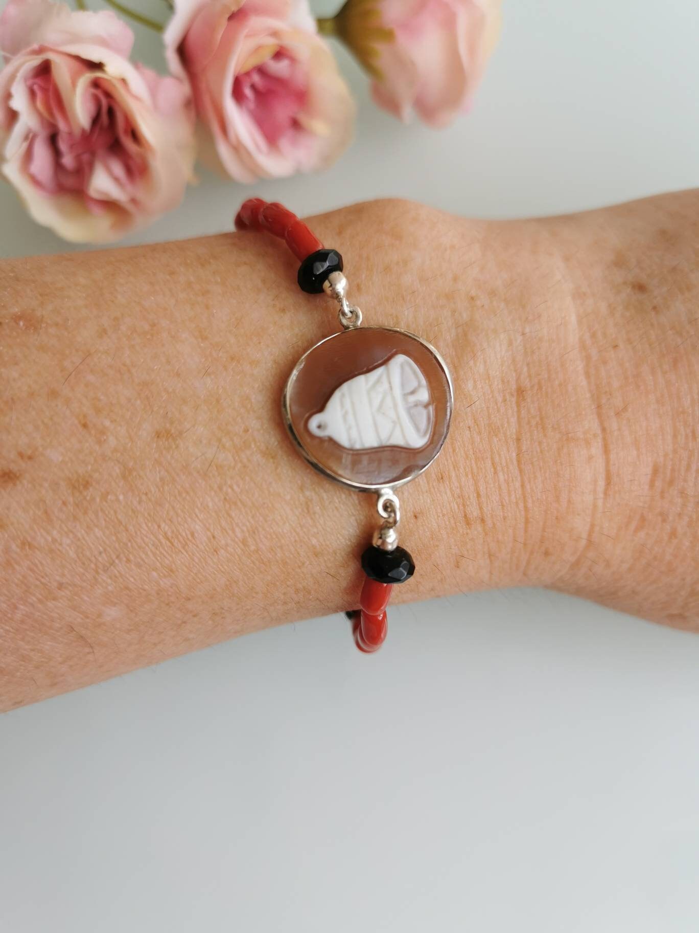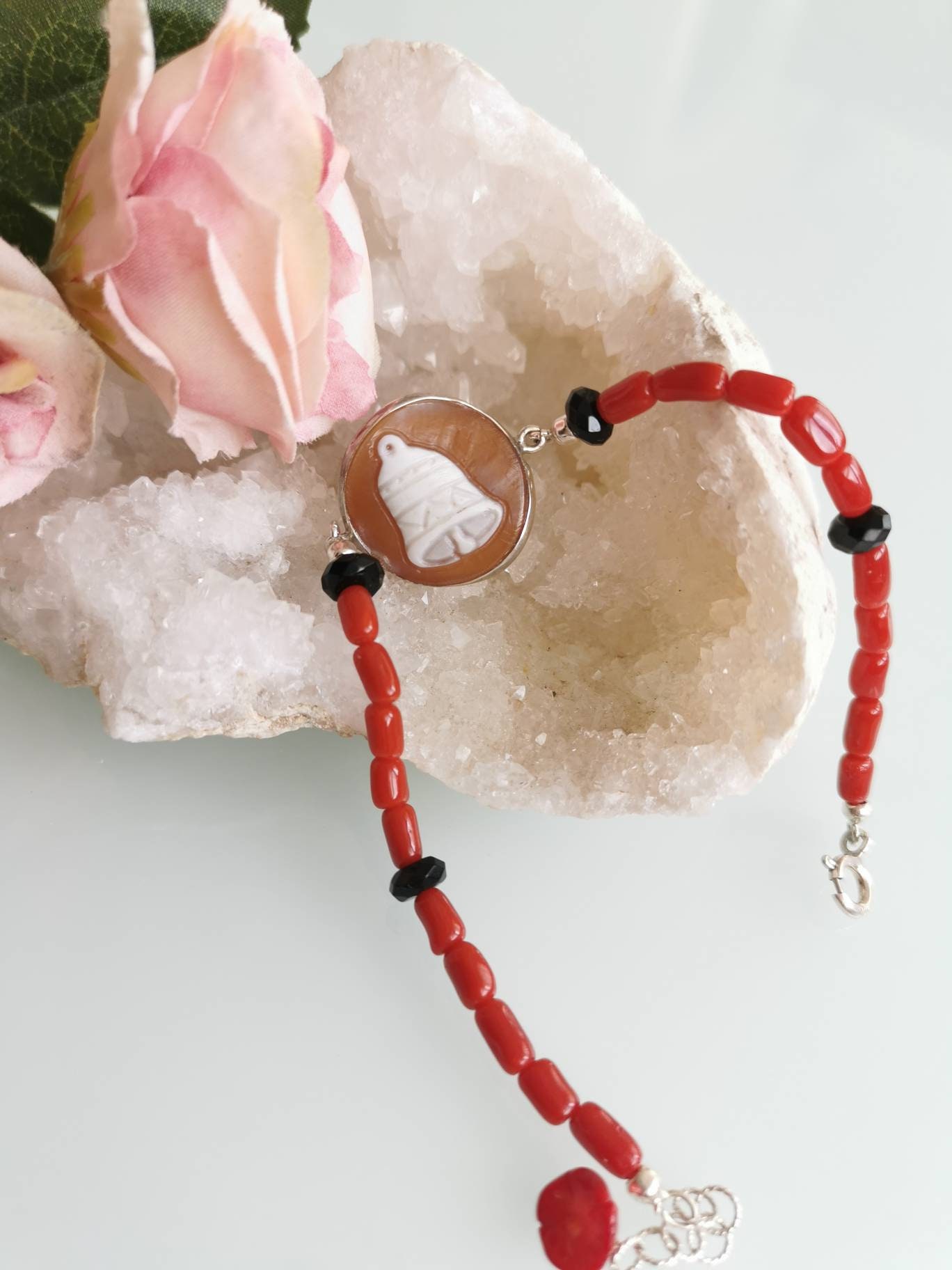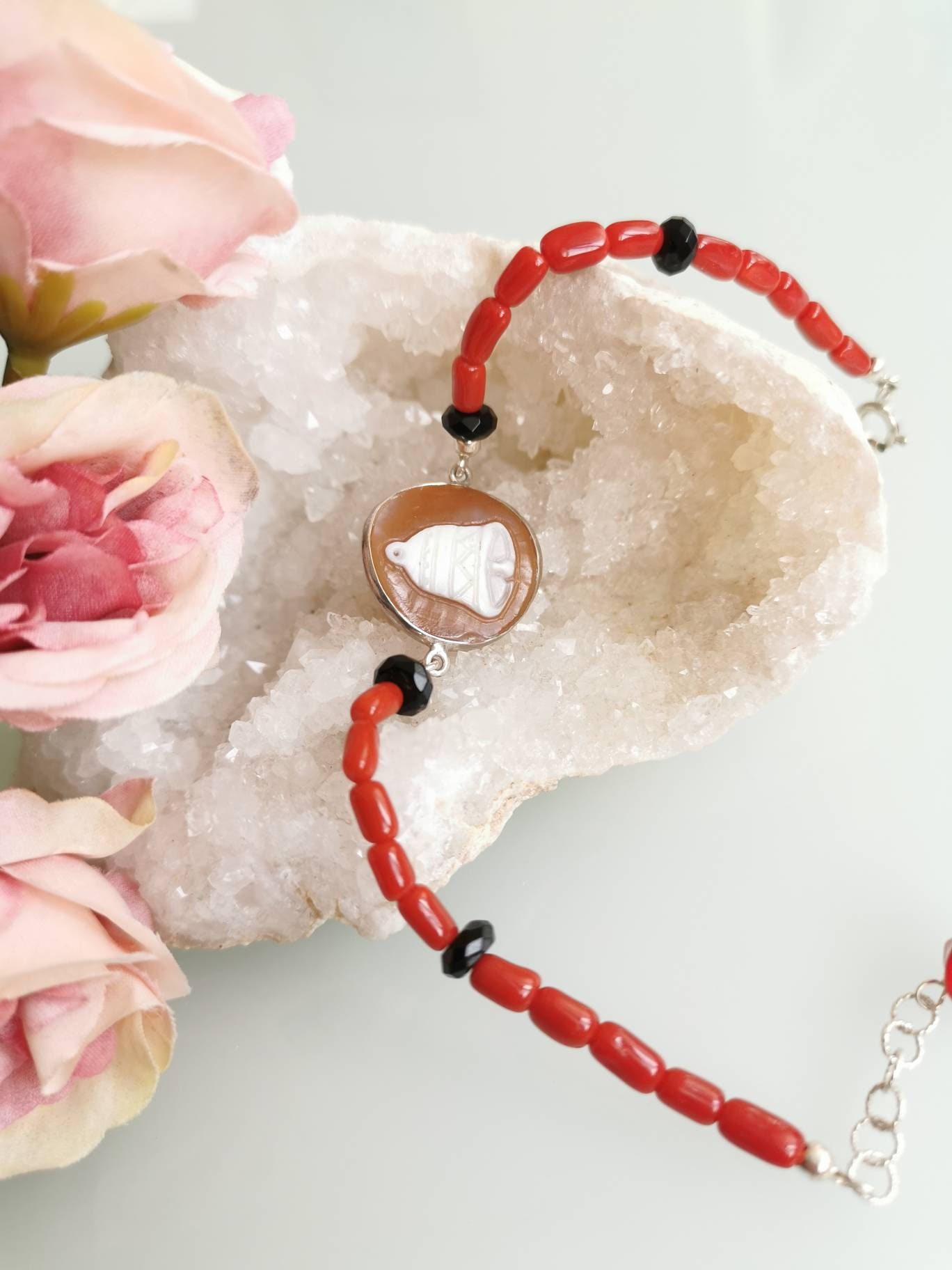 Bracciale corallo con cammeo conchiglia sardonica e argento 925, gioielli italiani