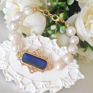 Bracciale perle bianche con elemento quarzo occhio di gatto blu