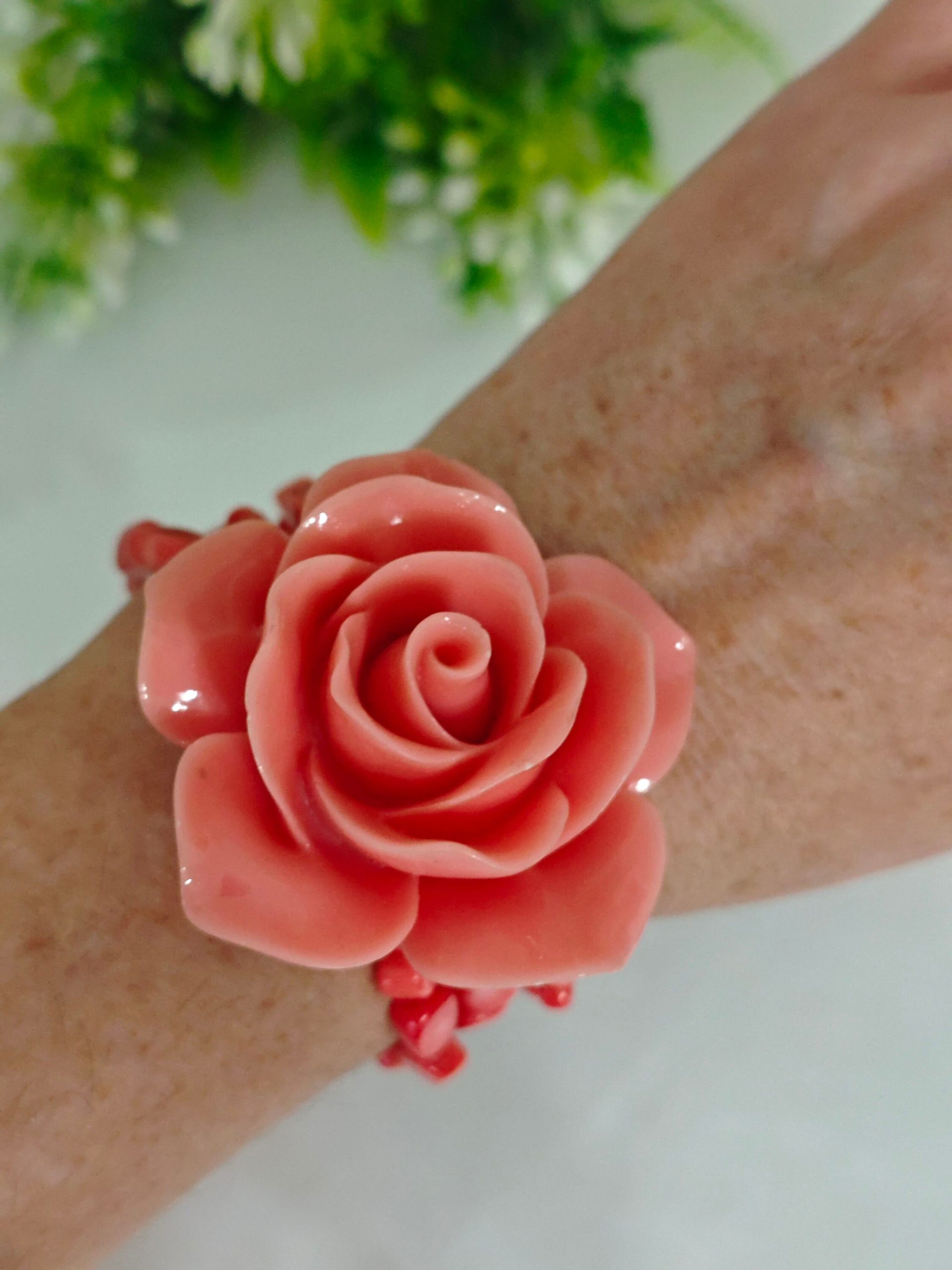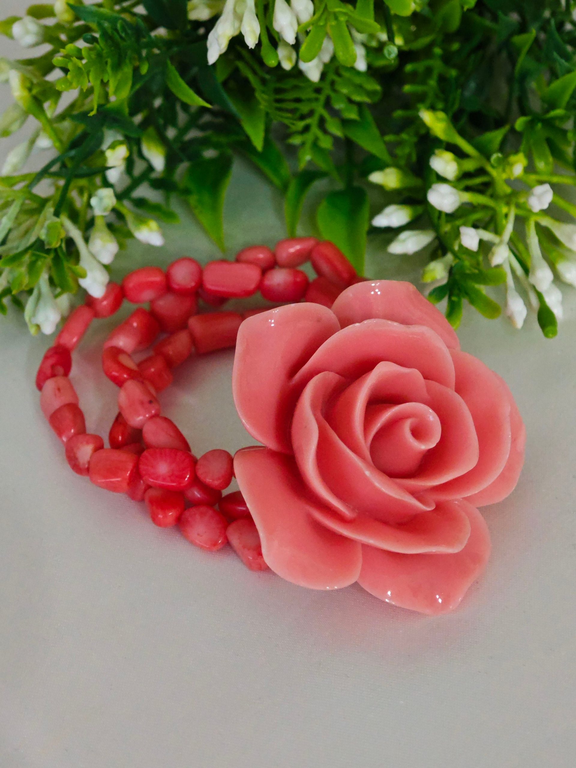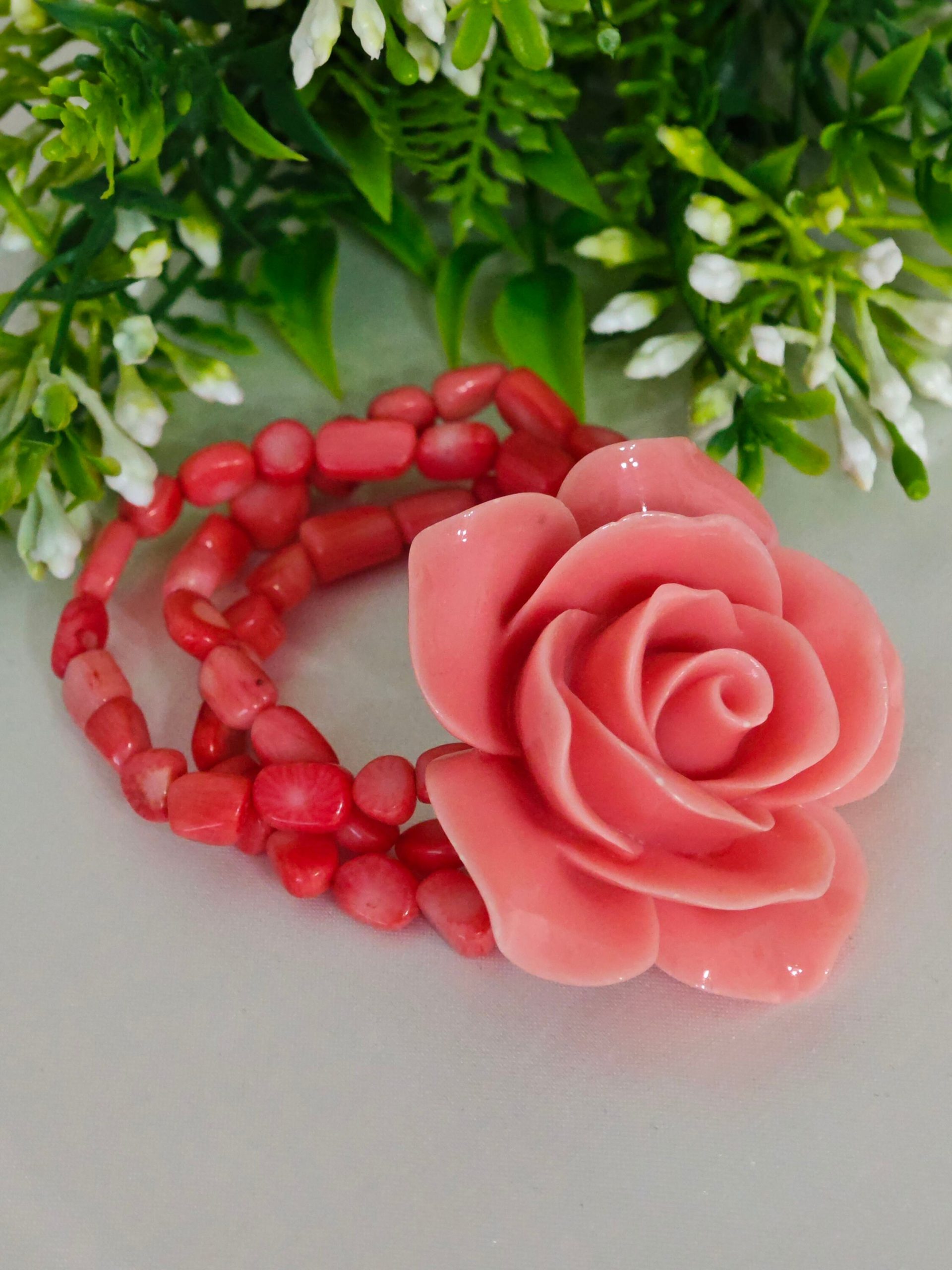 Bracciale elastico a 3 fili perle corallo rosa bambù con fiore resina rosa grande 5,5 cm diametro .