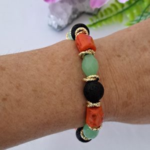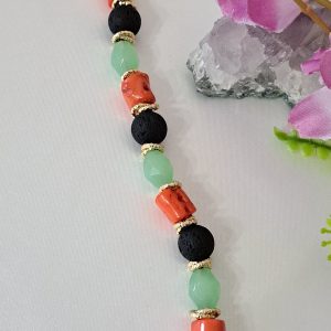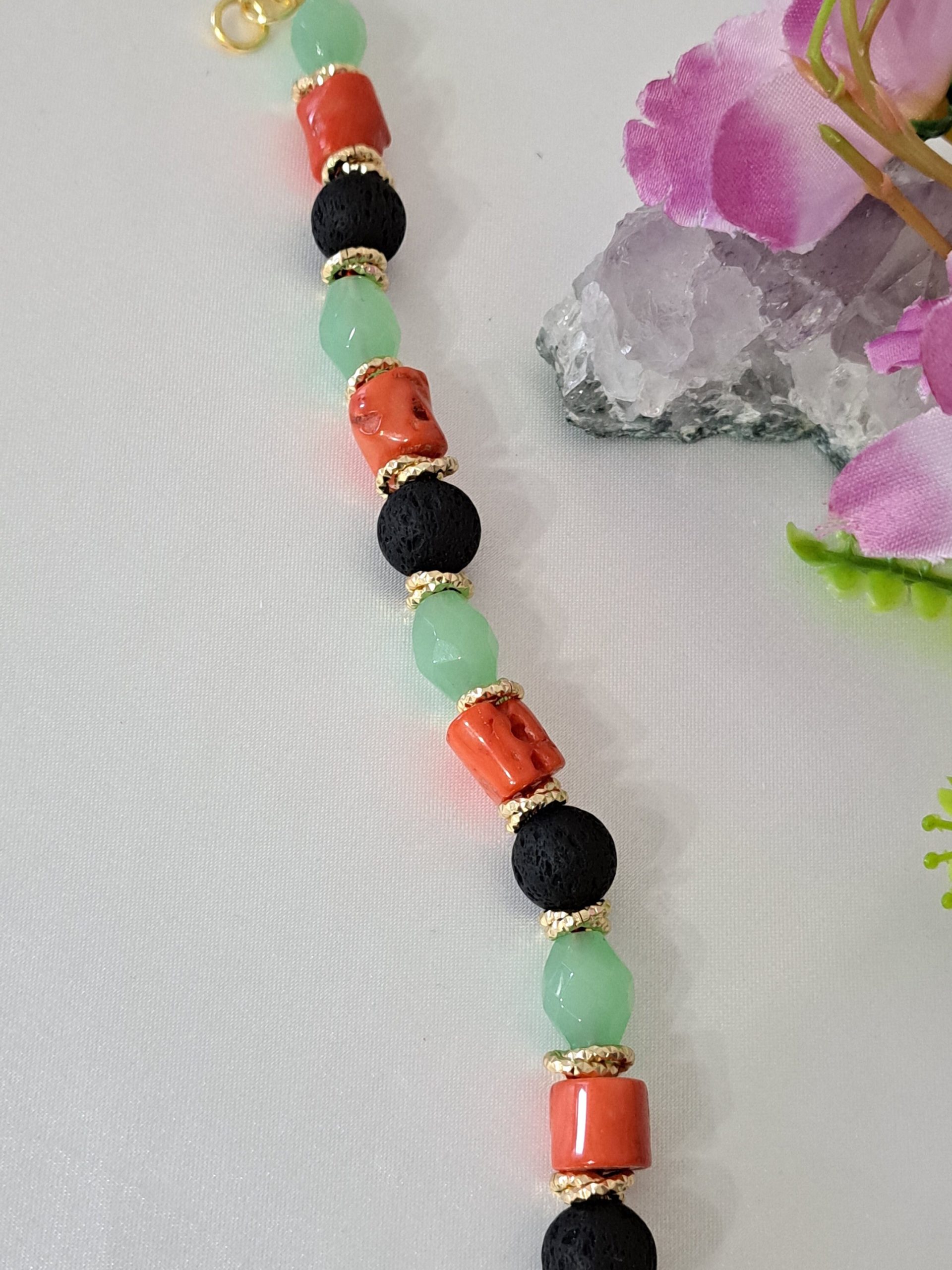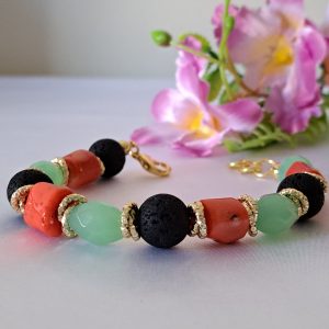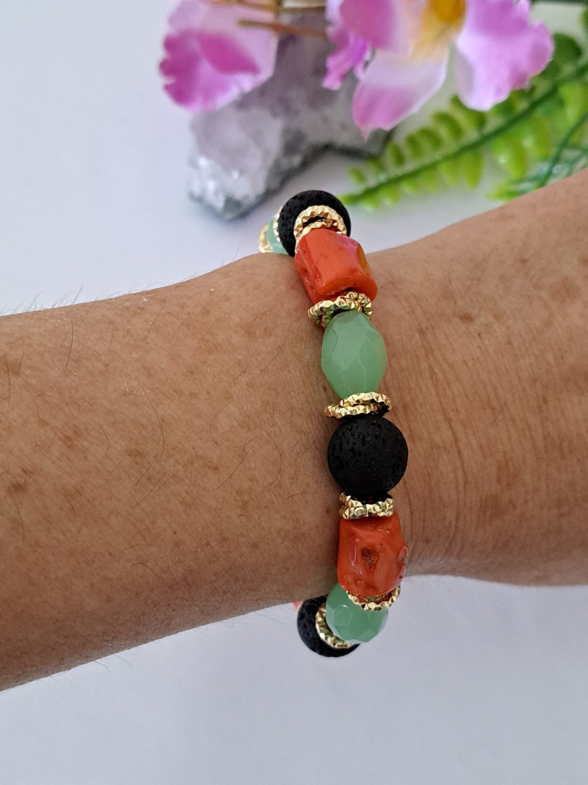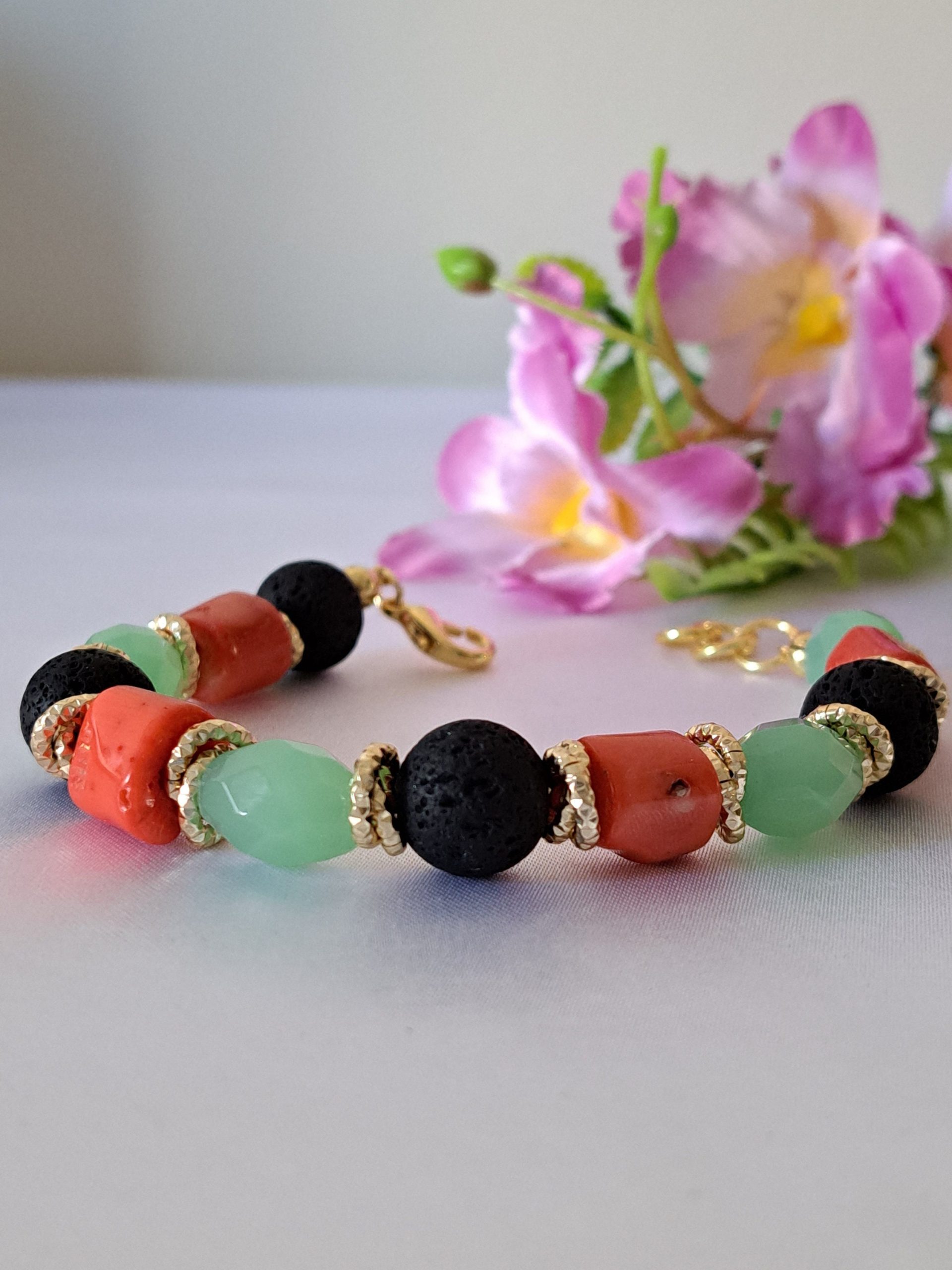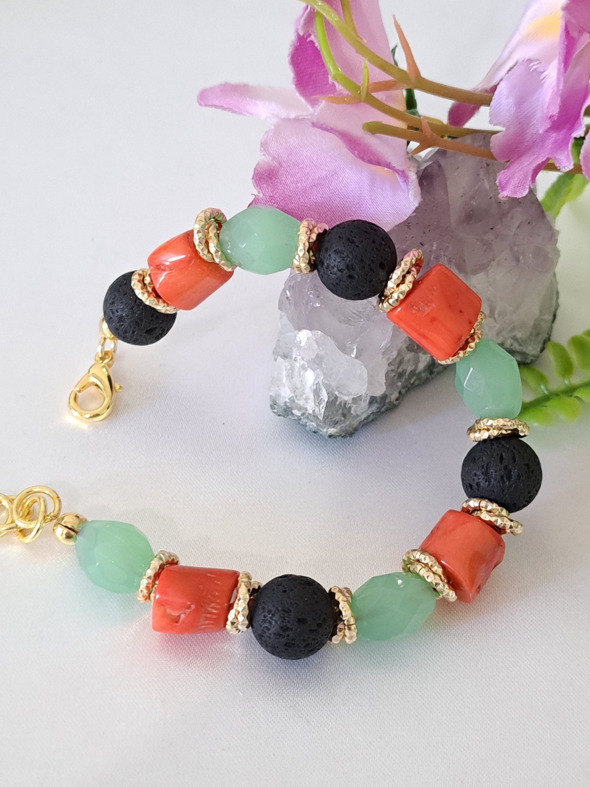 Bracciale corallo rosso bambù, quarzo verde e pietra lavica