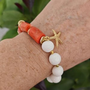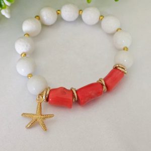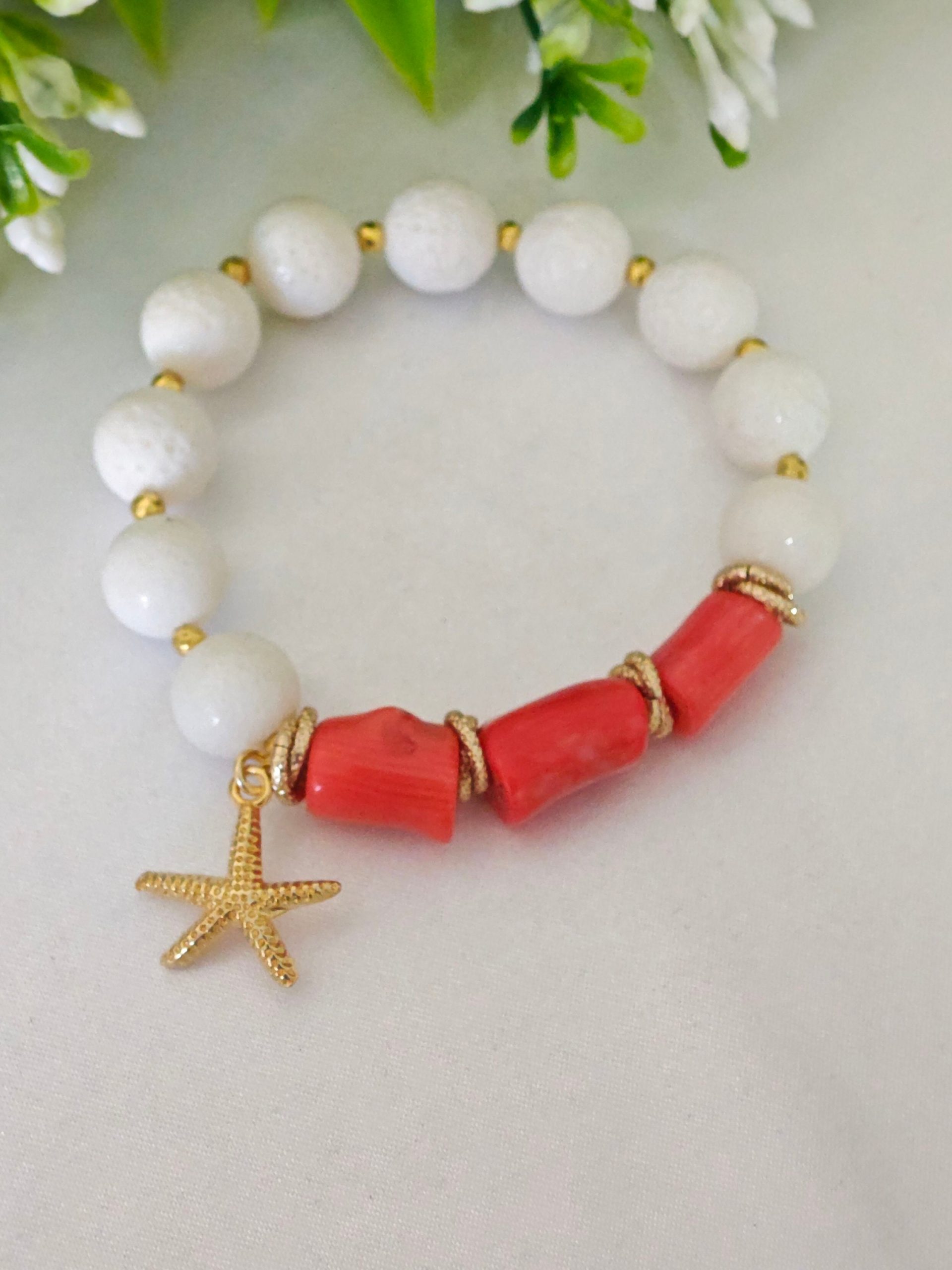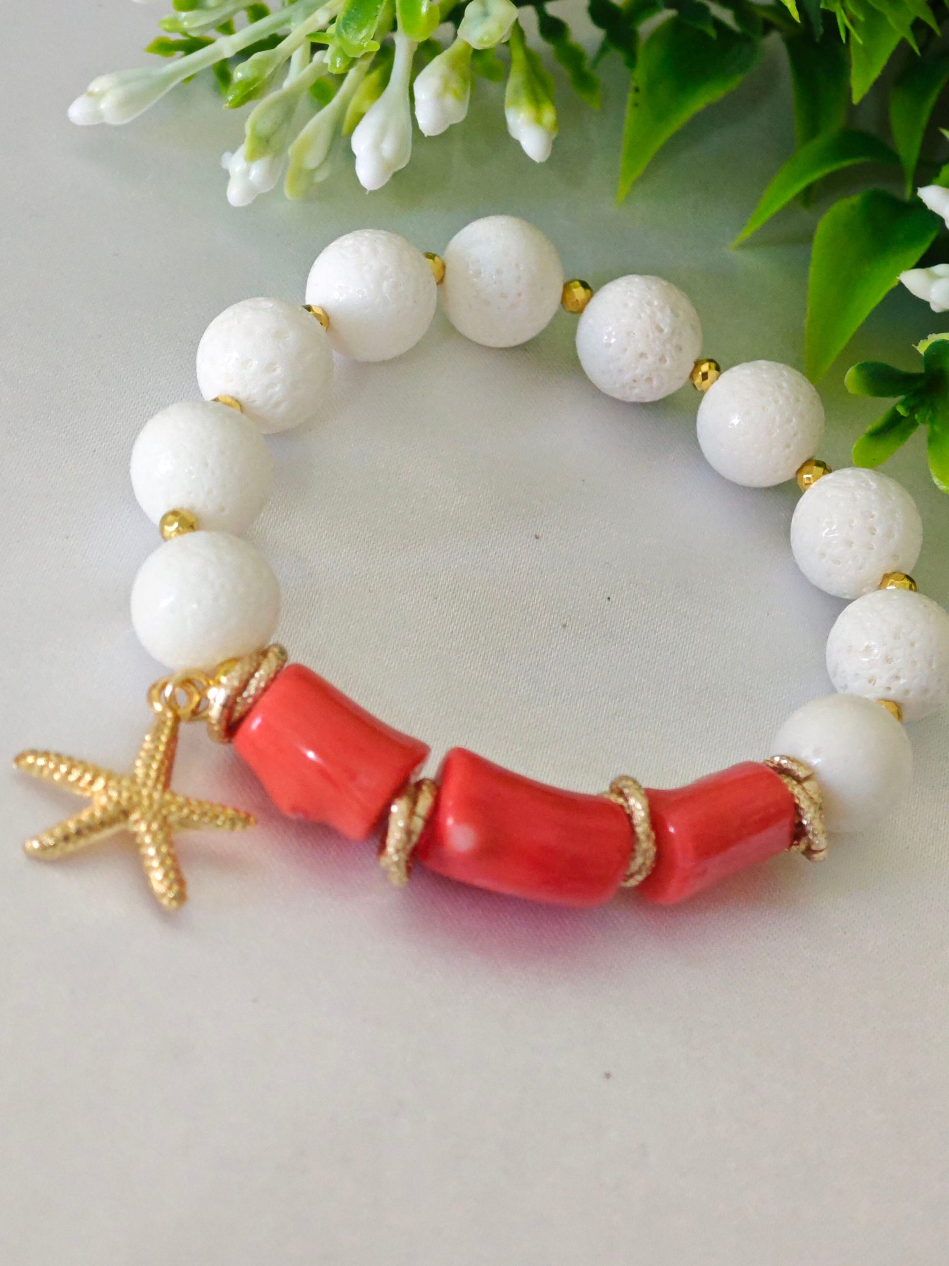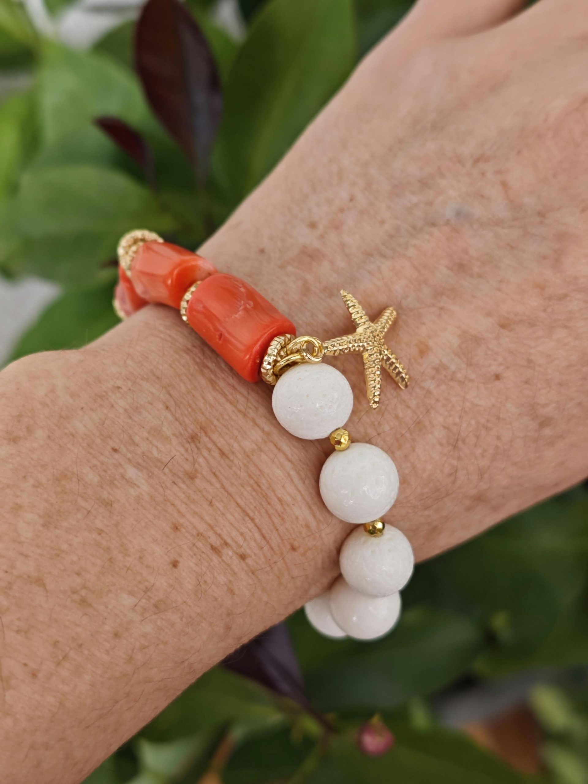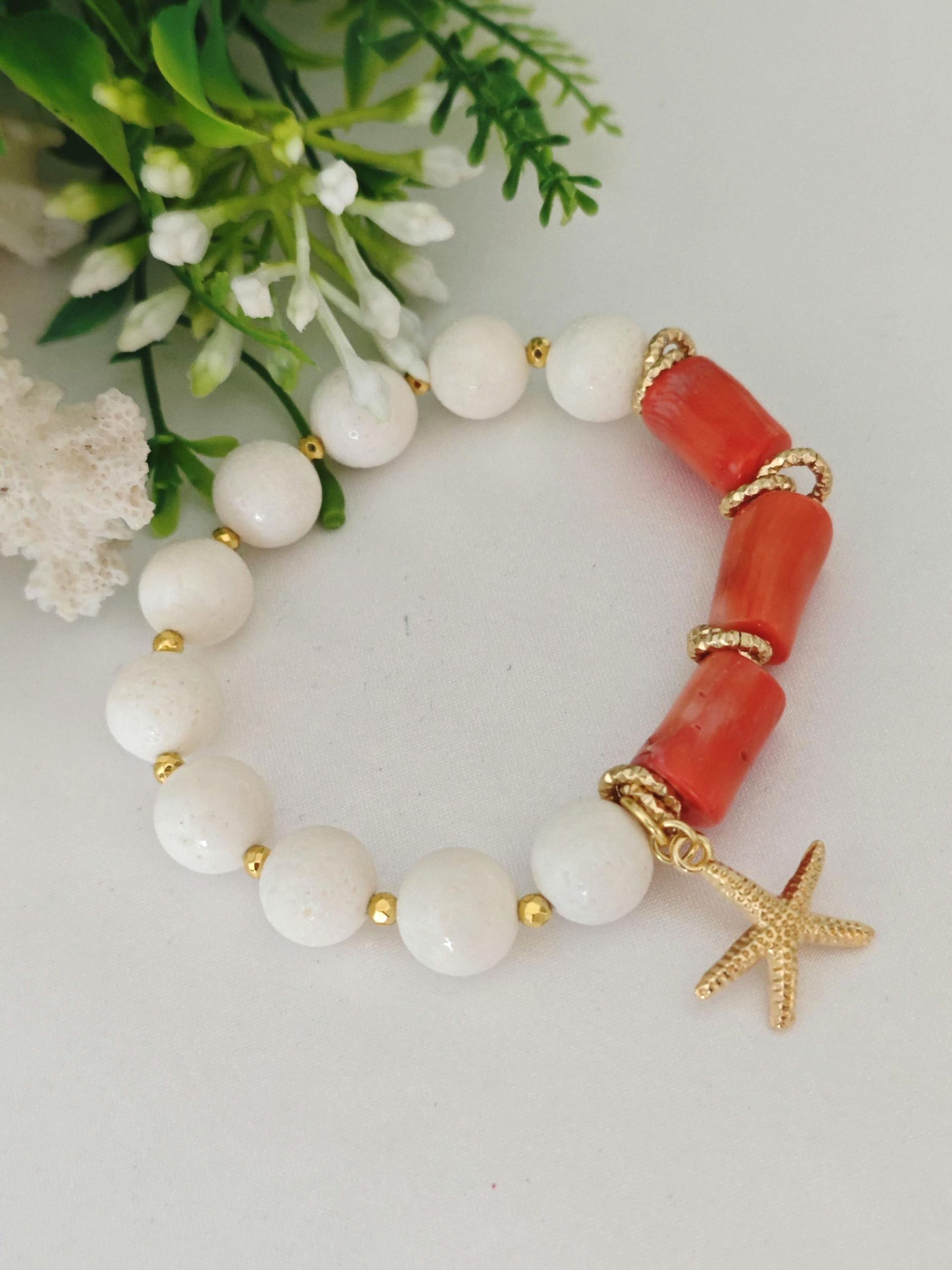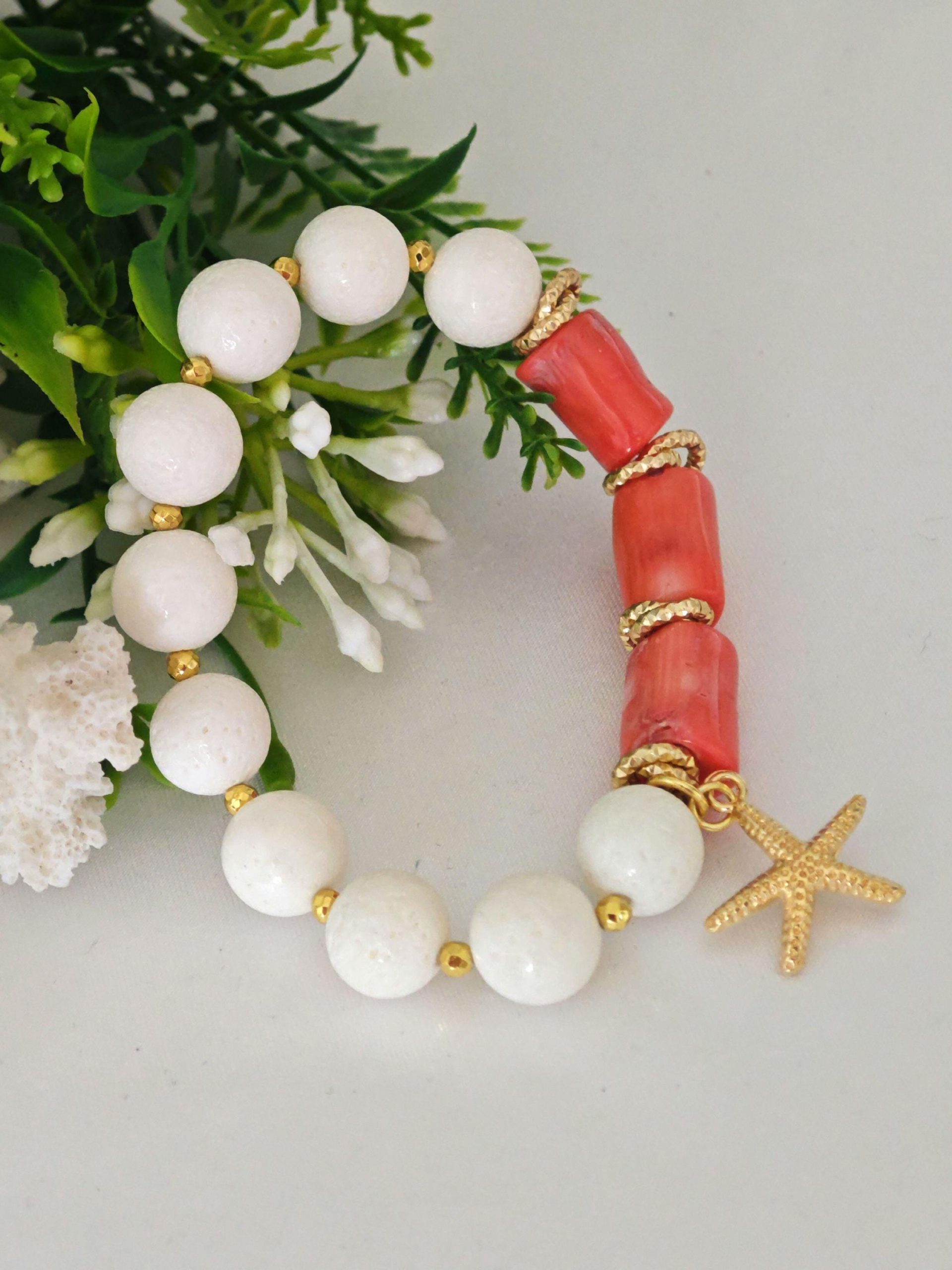 Bracciale elastico realizzato a mano con perle corallo spugna bianco naturale, tubetti corallo rosso arancione bambù, ciondolo stella marina in ottone dorato e perline dorate.