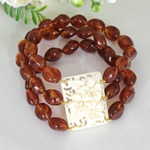 Bracciale perle ambra imitazione e fiori avorio imitazione , bracciale 3 fili elastico