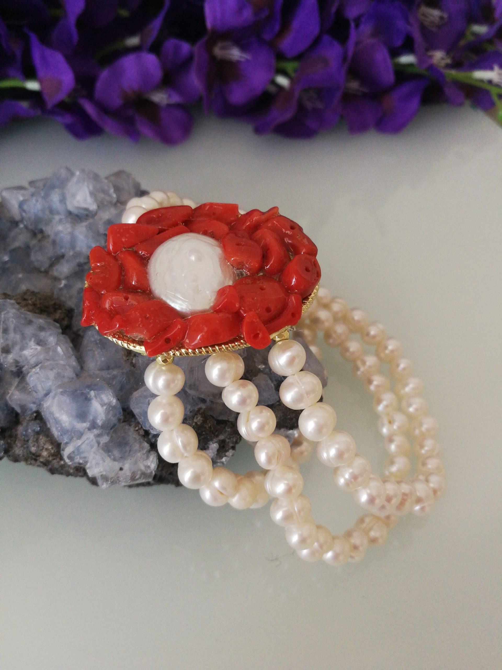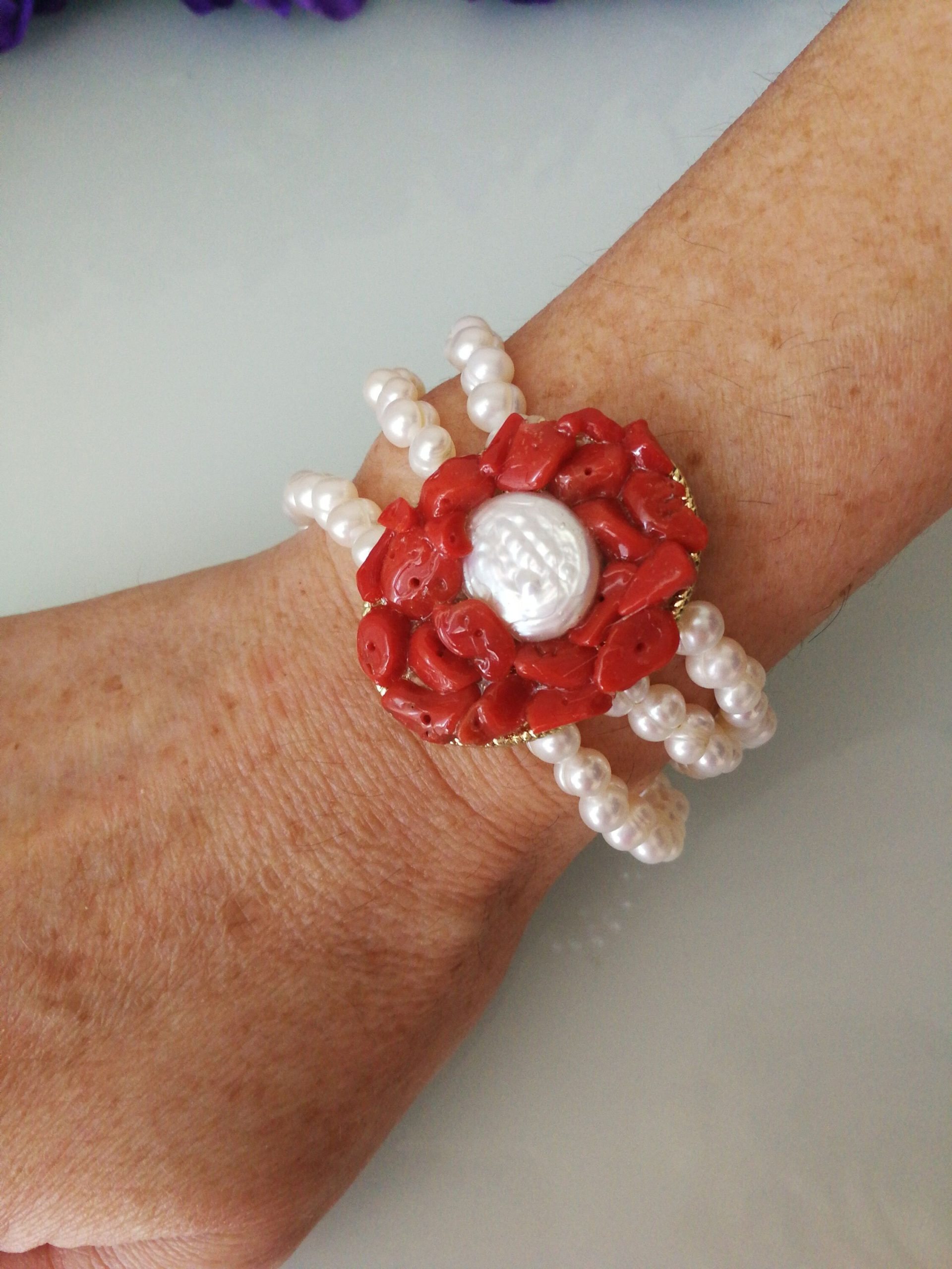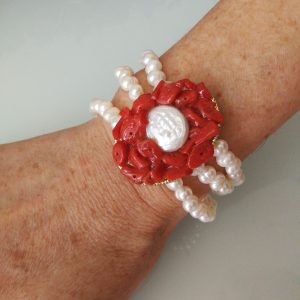 Bracciale corallo rosso naturale del mediterraneo e perle naturali bianche barocche.Gioielli Italiani