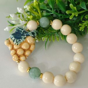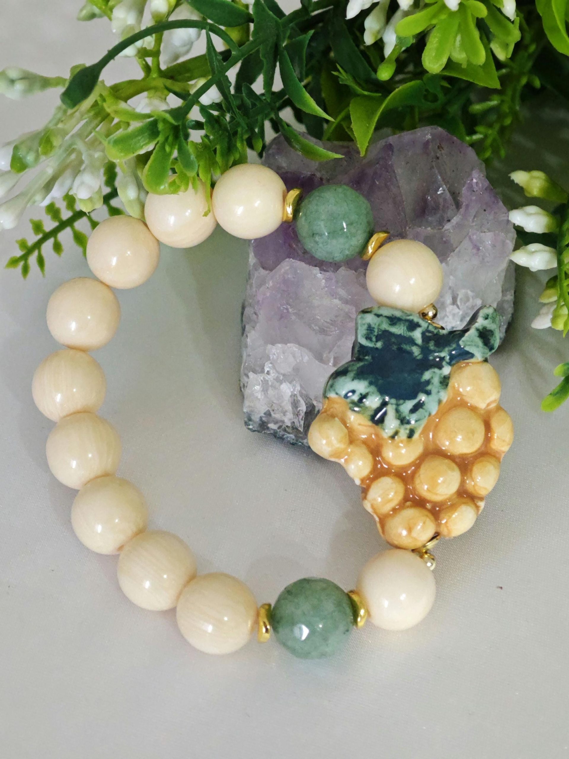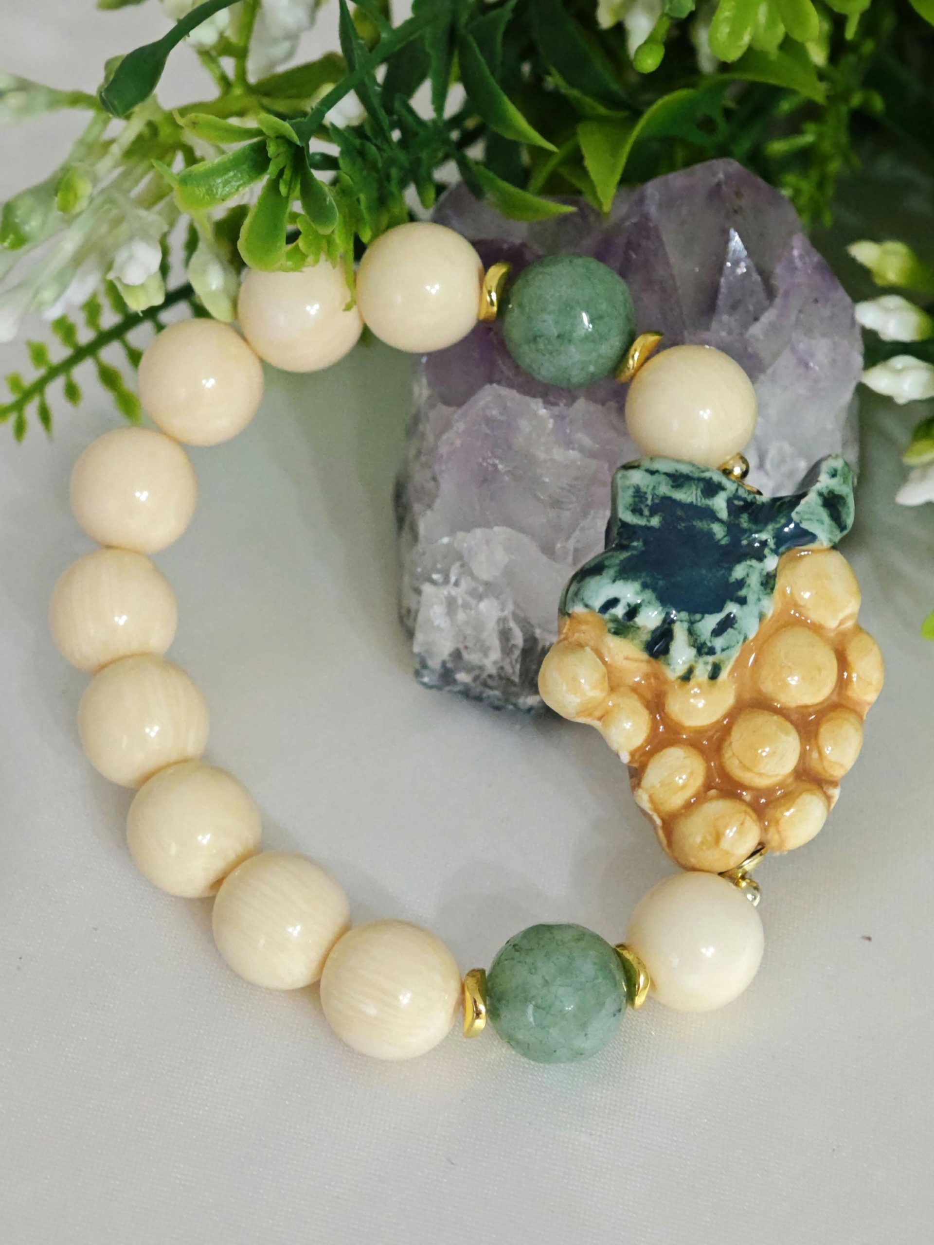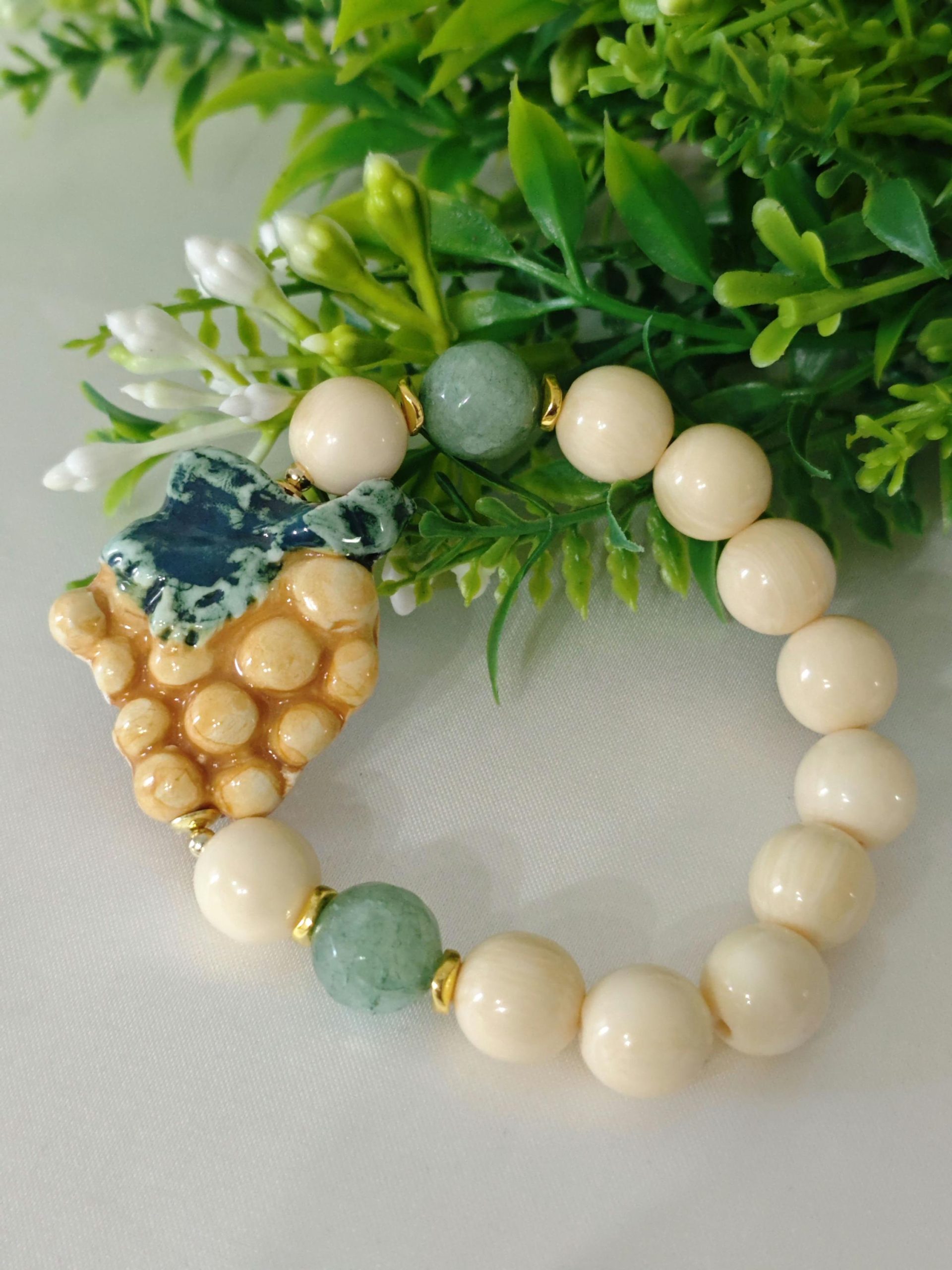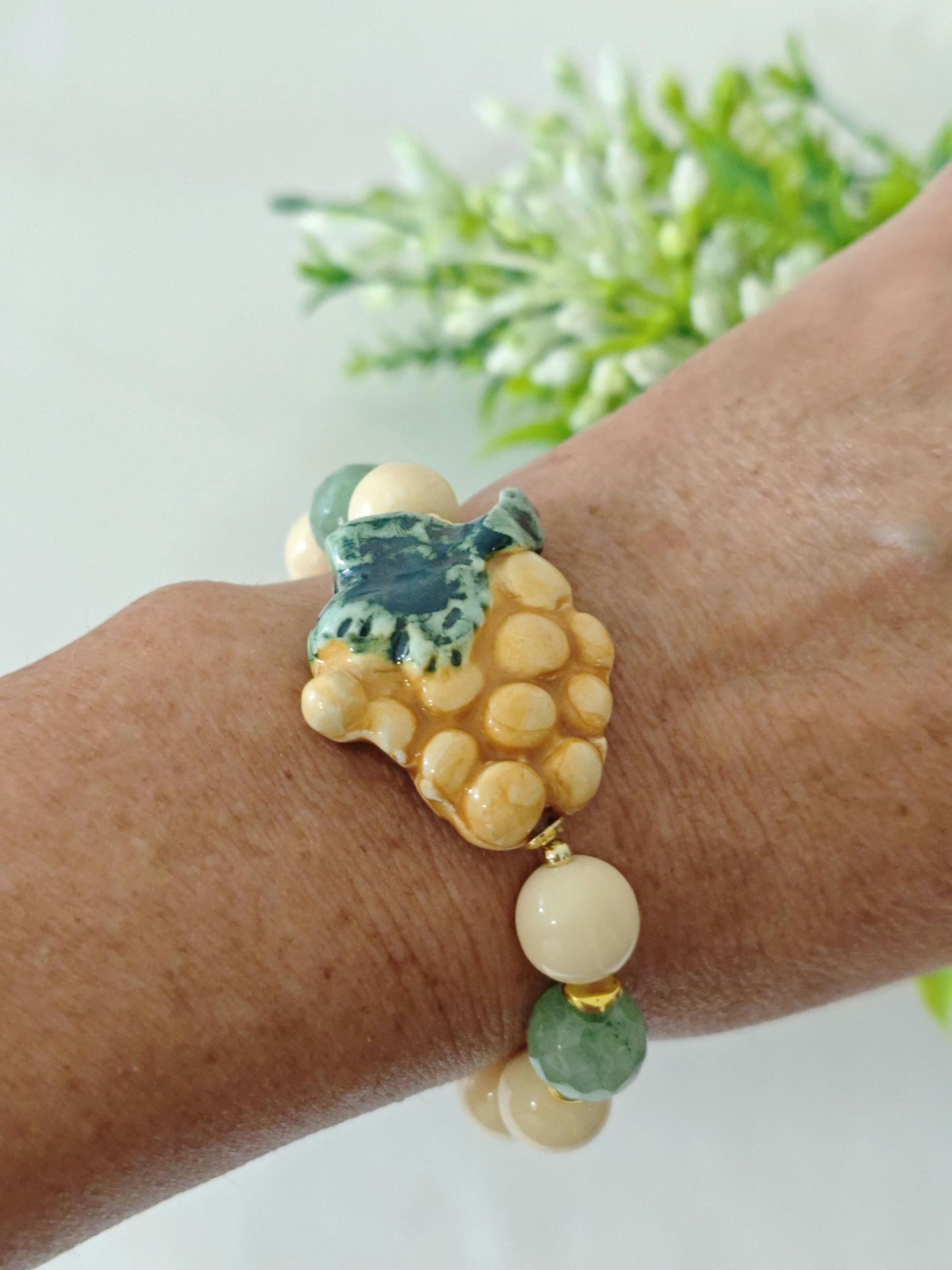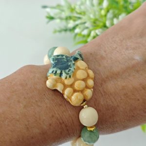 Bracciale elastico con grappolo d’uva in ceramica di Caltagirone realizzata e dipinta a mano, 3 cm dimensioni, perle avorio imitazione 12 mm e pietre avventurina verde .
