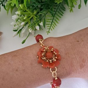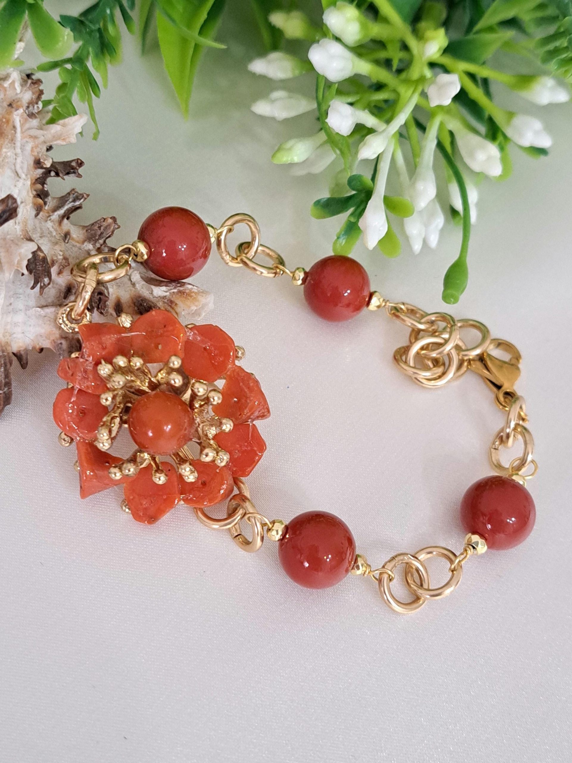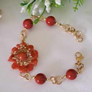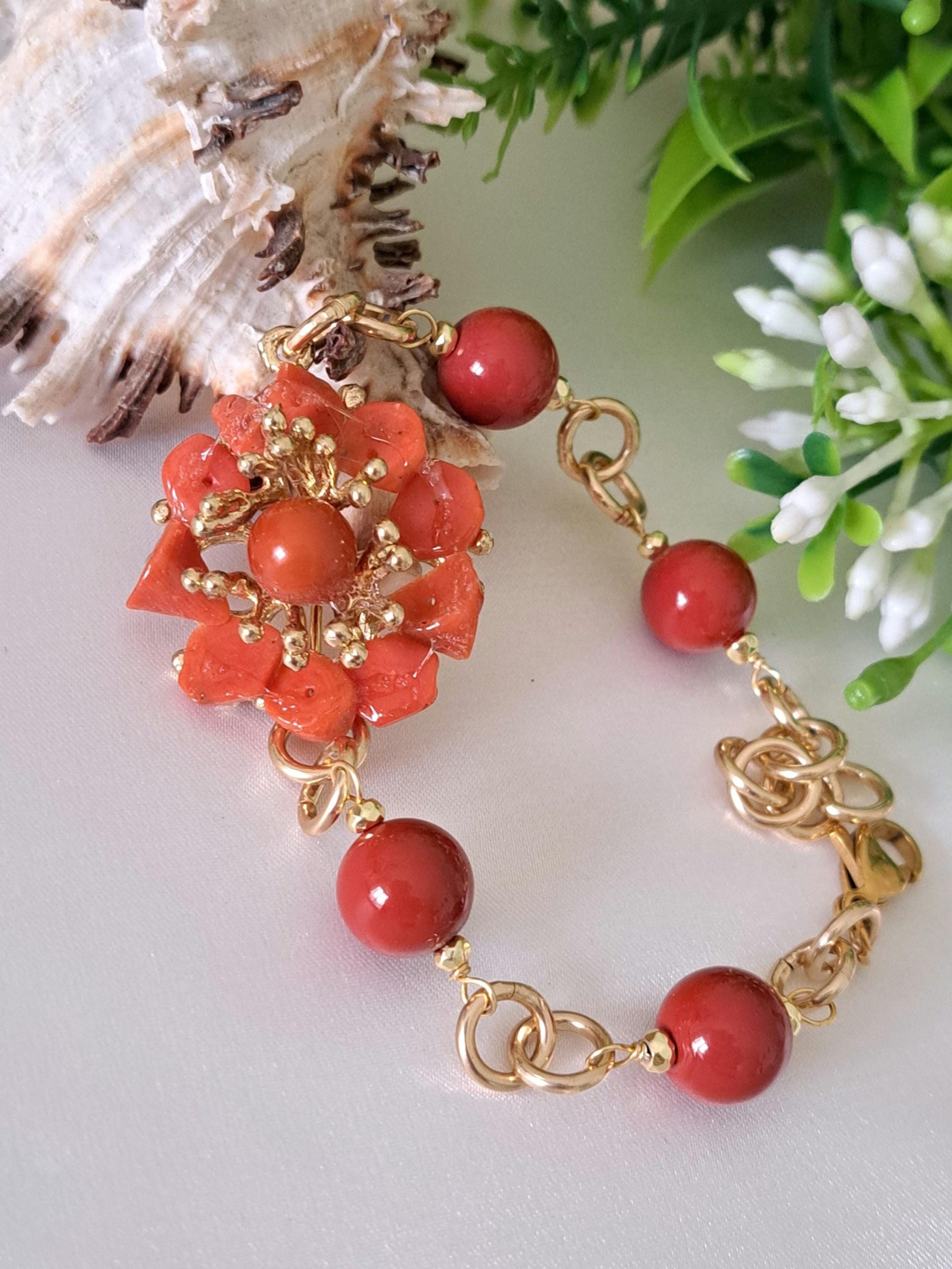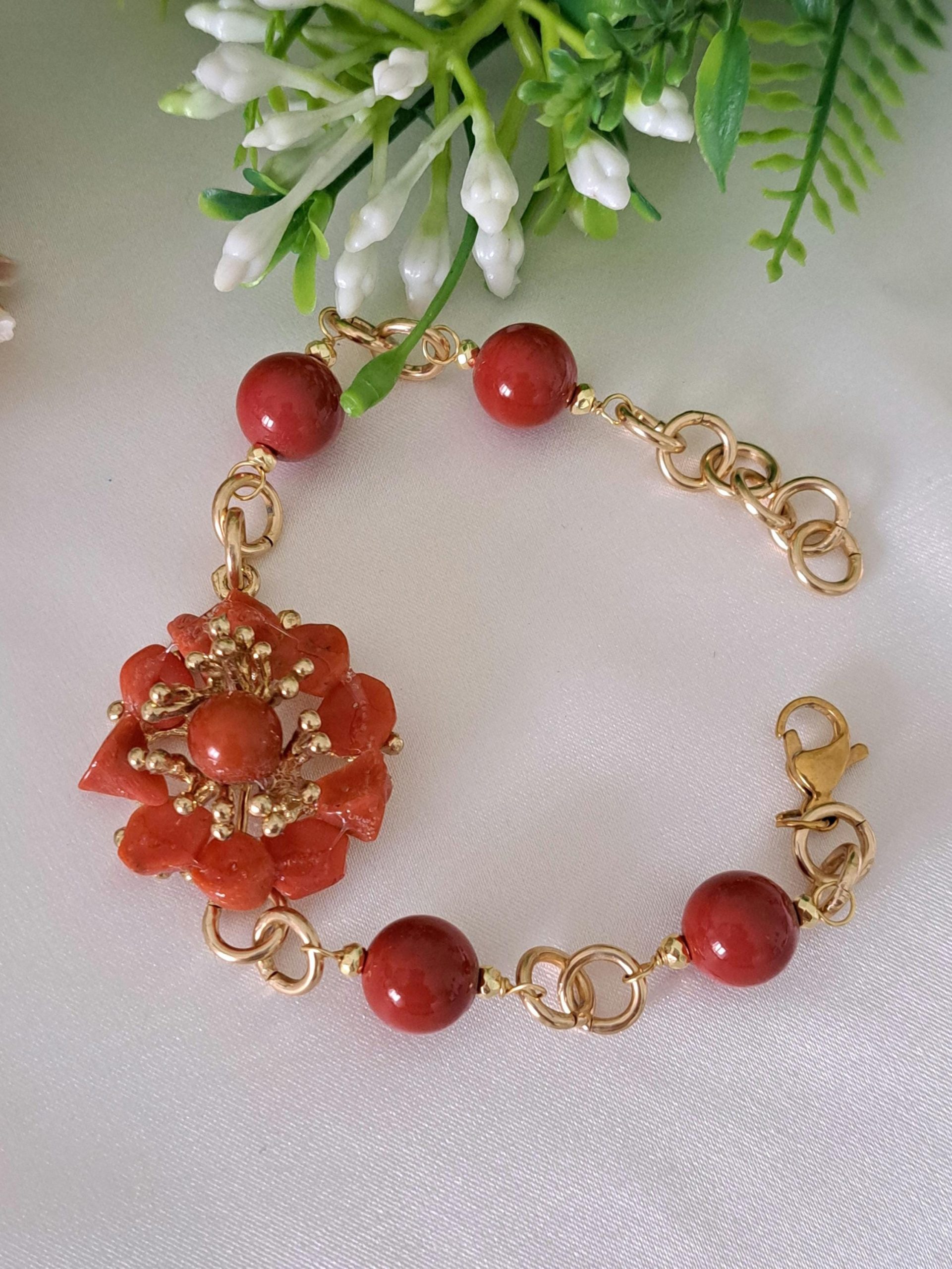 Bracciale fiore corallo naturale mediterraneo e perle pasta di corallo rosso imitazione , gioielli italiani