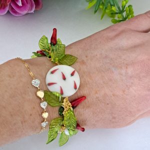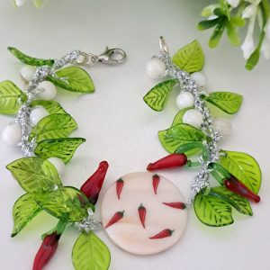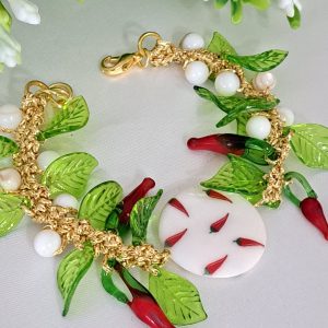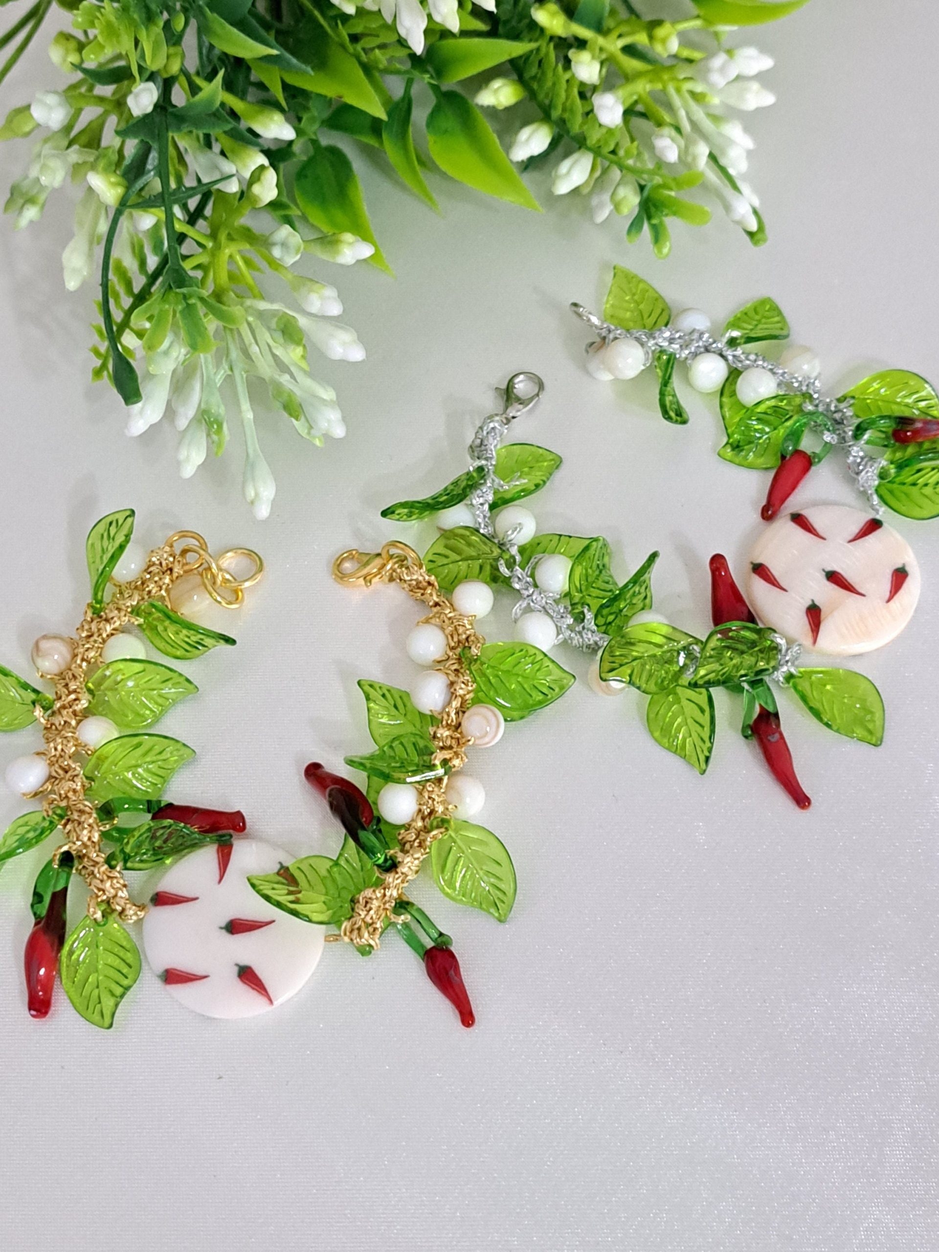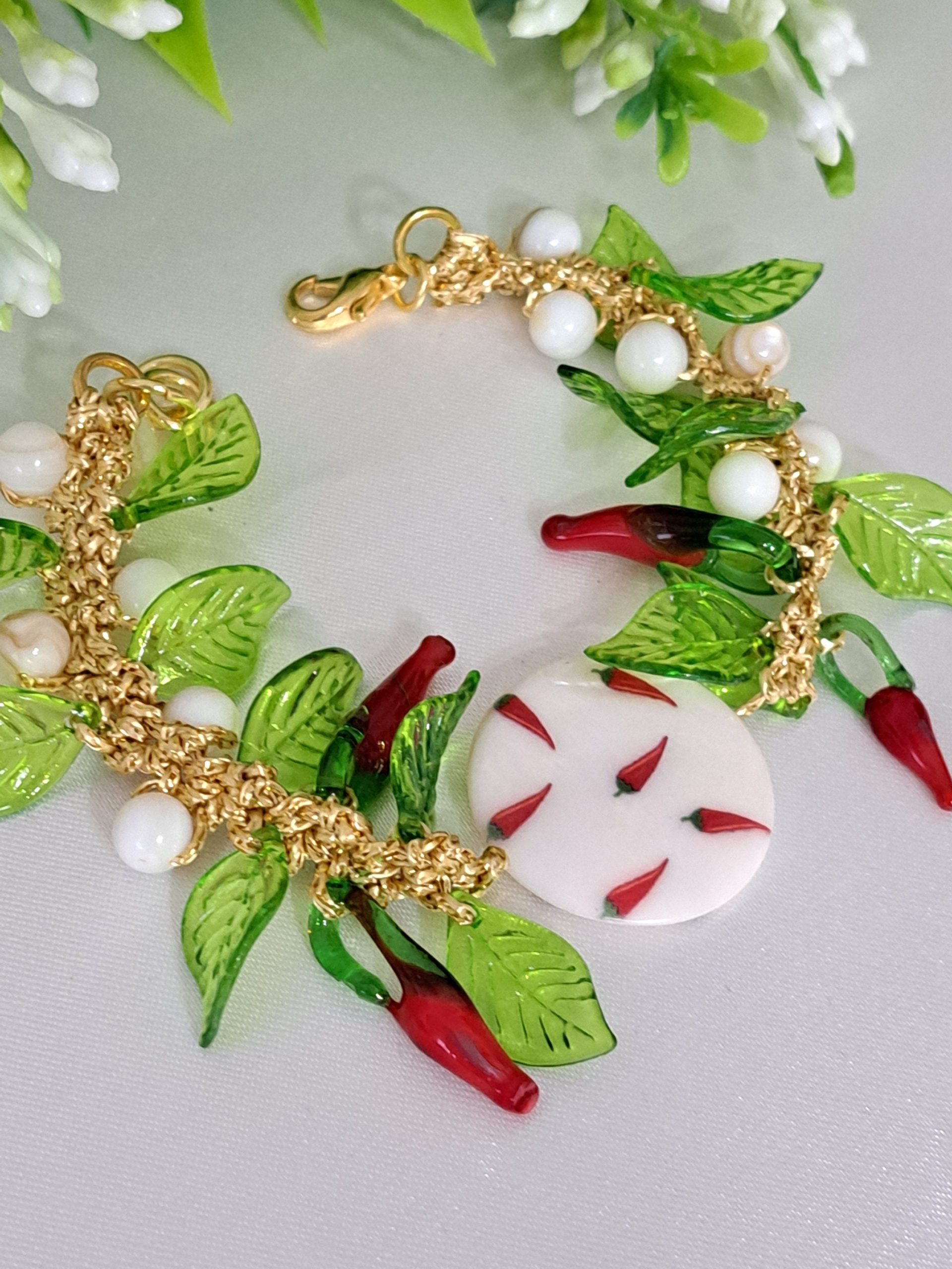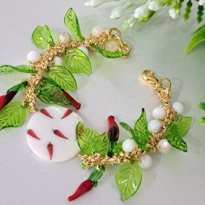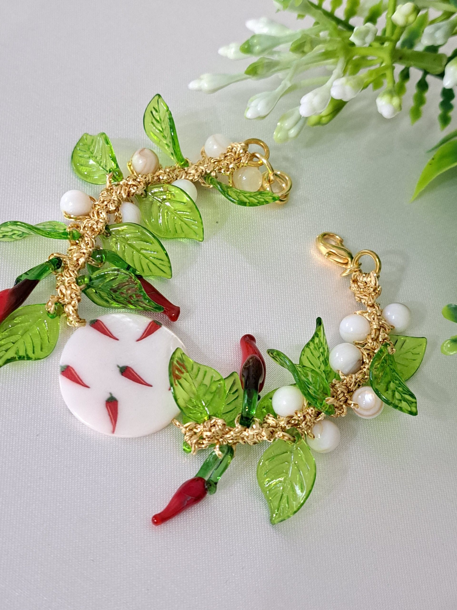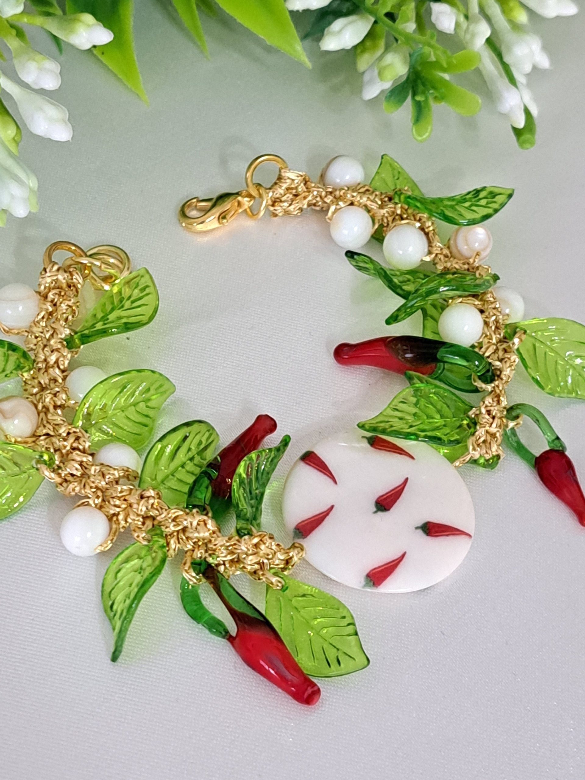 Bracciale Peperoncino con foglie e perle madreperla, bracciale handmade