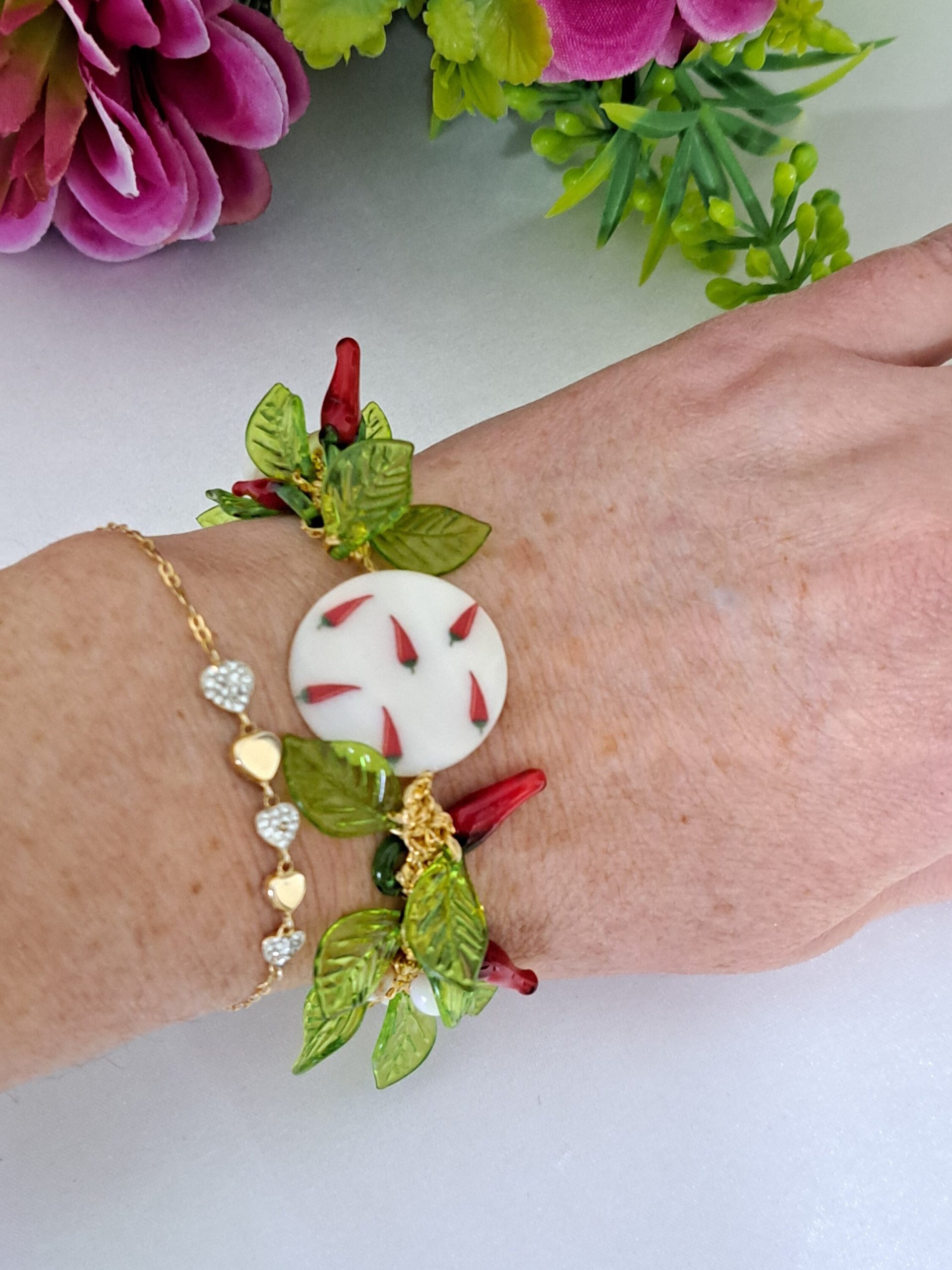 Bracciale maxi realizzato interamente a mano con filo dorato/argentato con perle madreperla bianca, foglie acrilico verde, peperoncino in vetro soffiato e disco centrale in madreperla dipinta con i peperoncini.