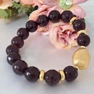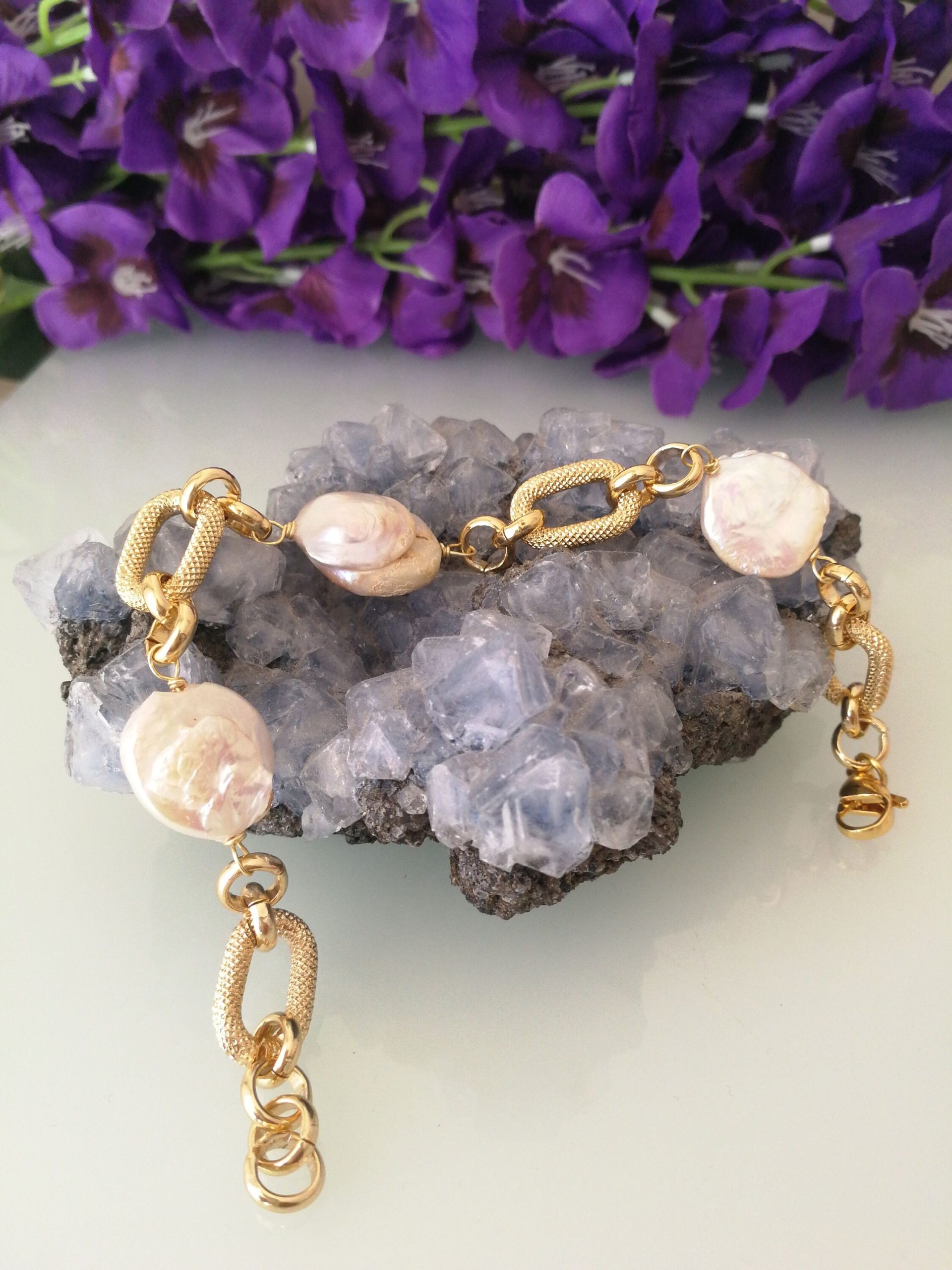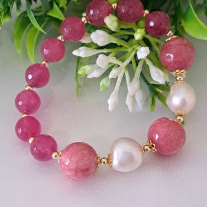 Bracciale pietre dure rubizoisite,perle bianche barocche con perle dorate, bracciale maxi