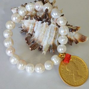 Bracciale perle bianche, moneta dorata e corallo rosso mediterraneo, bracciale elastico