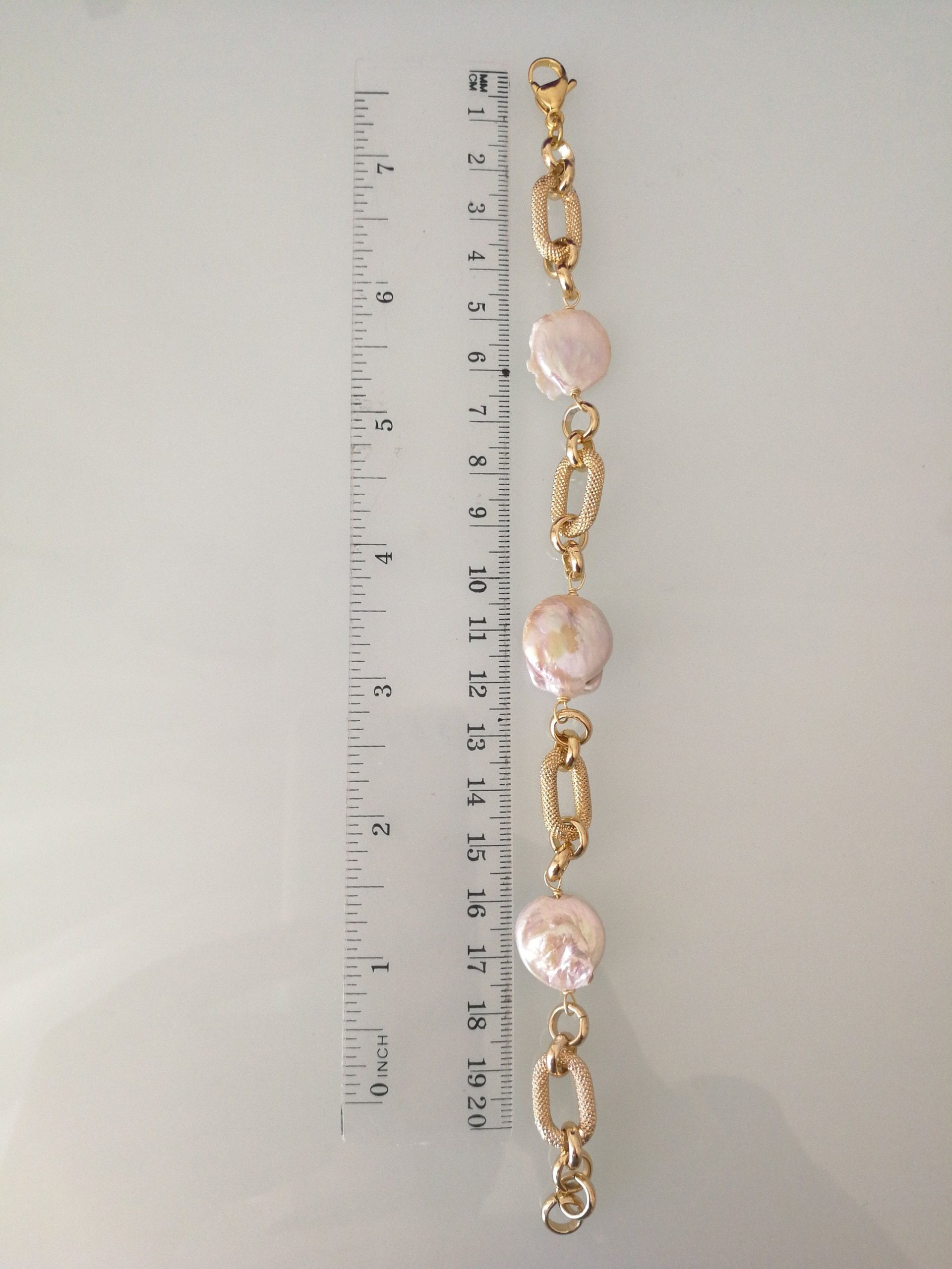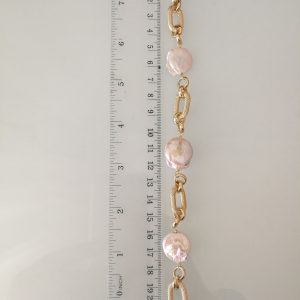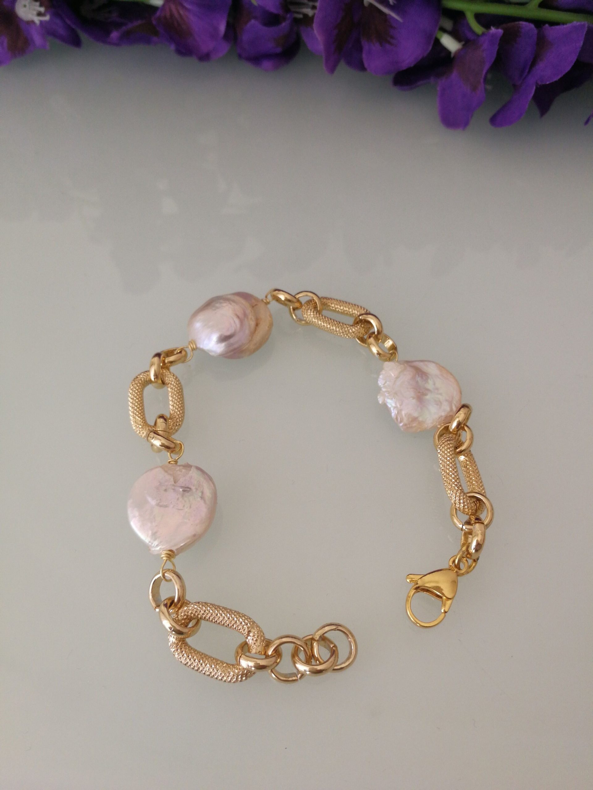 Bracciale elegante con perle naturali barocche bianche e catenina placcata oro.Moschettone in ottone dorato . Misura lunghezza 21/22 cm. Regolabile.