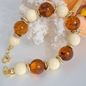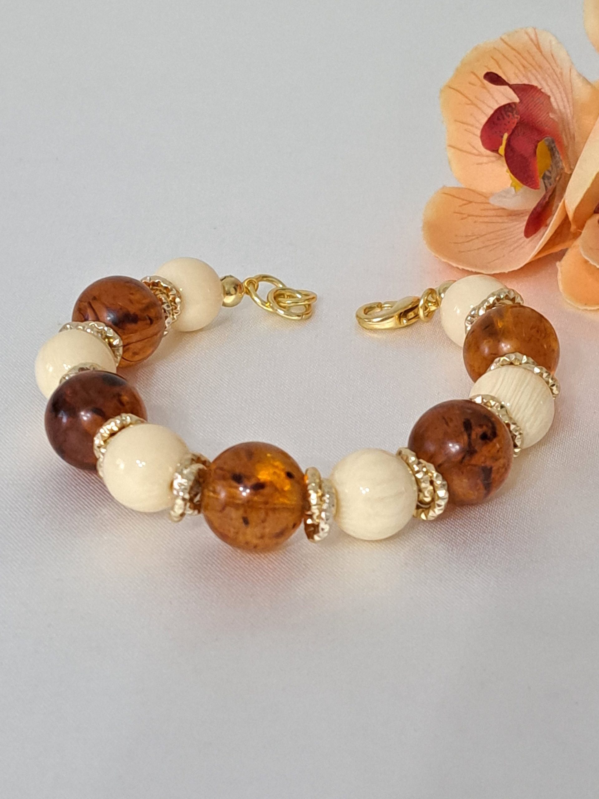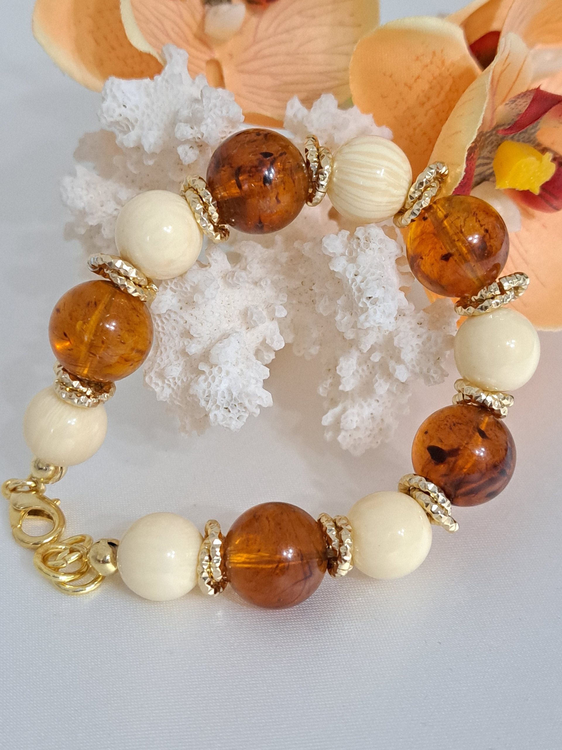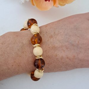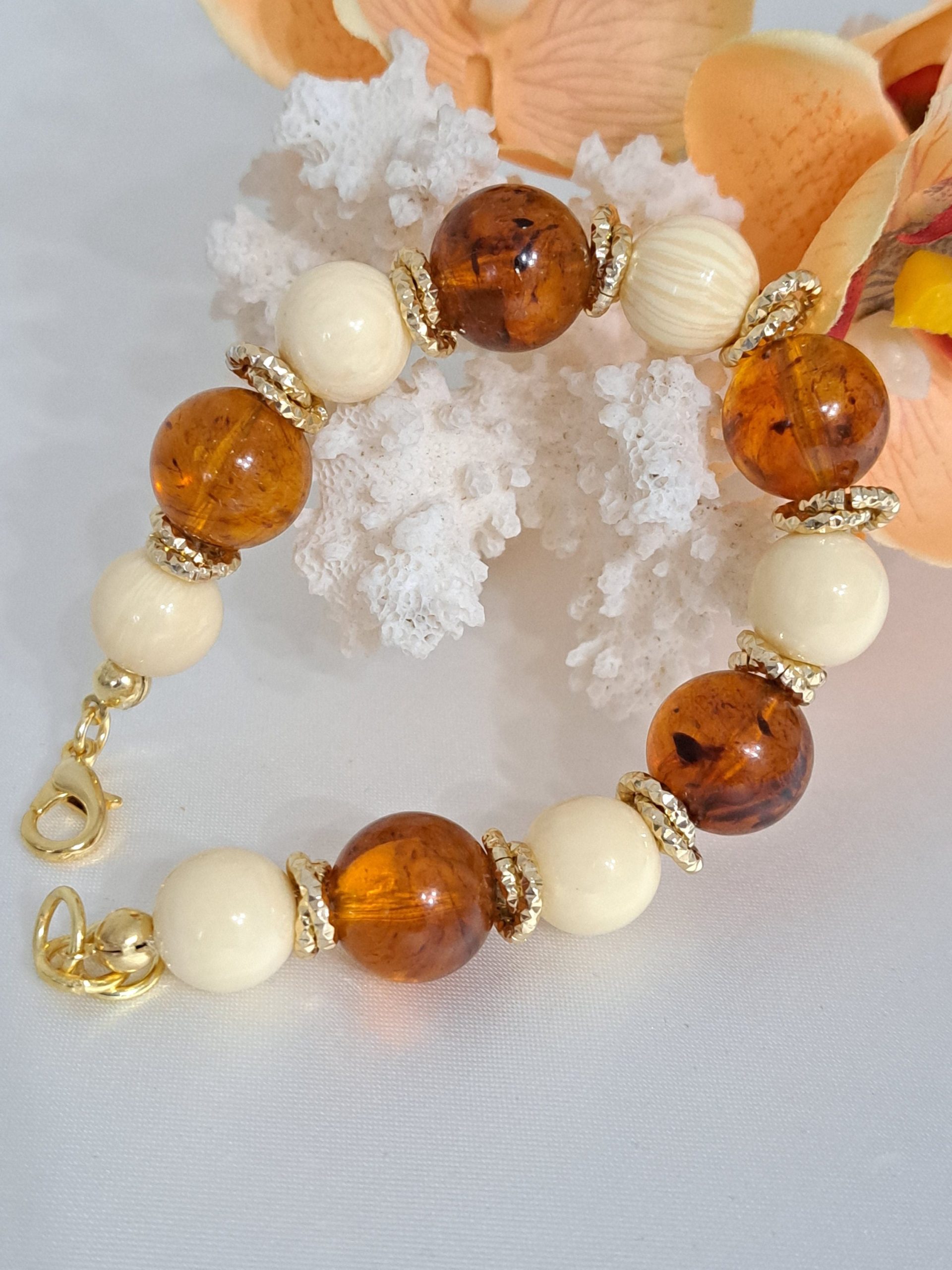 Bracciale maxi realizzato con perle imitazione ambra 14 mm e perle imitazione avorio 12 mm decorato con anelli alluminio dorato smerigliato.