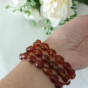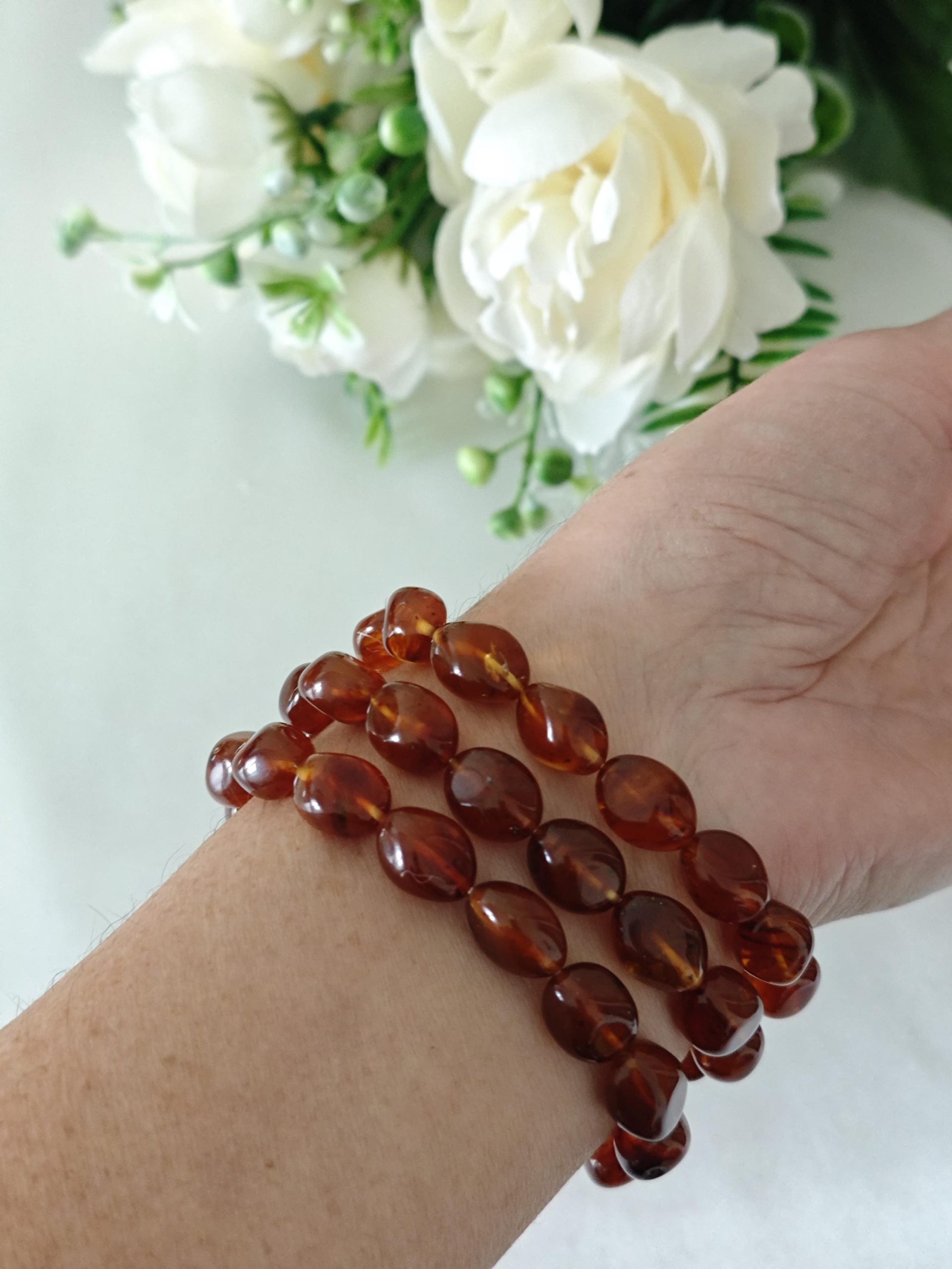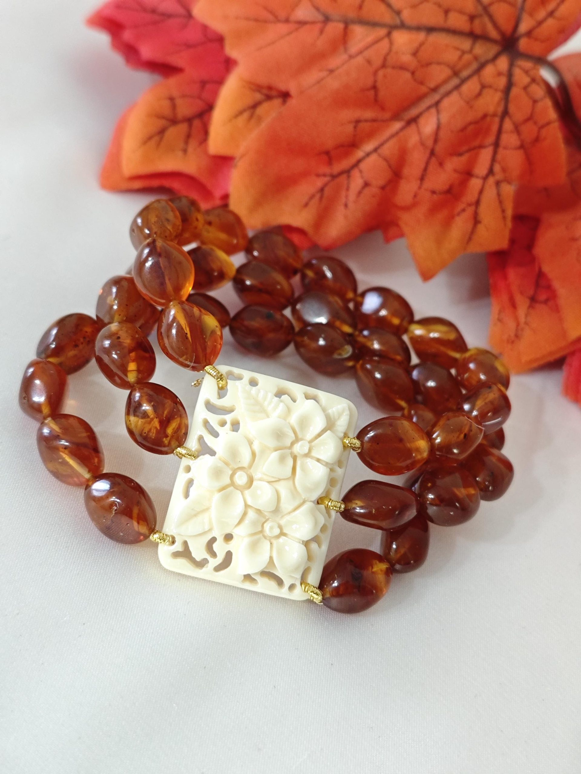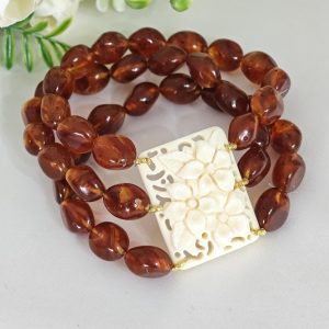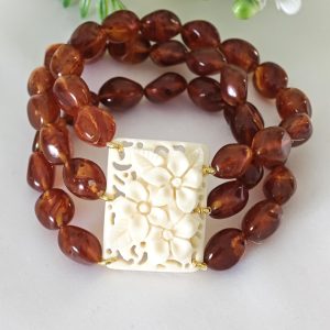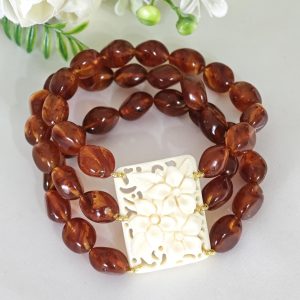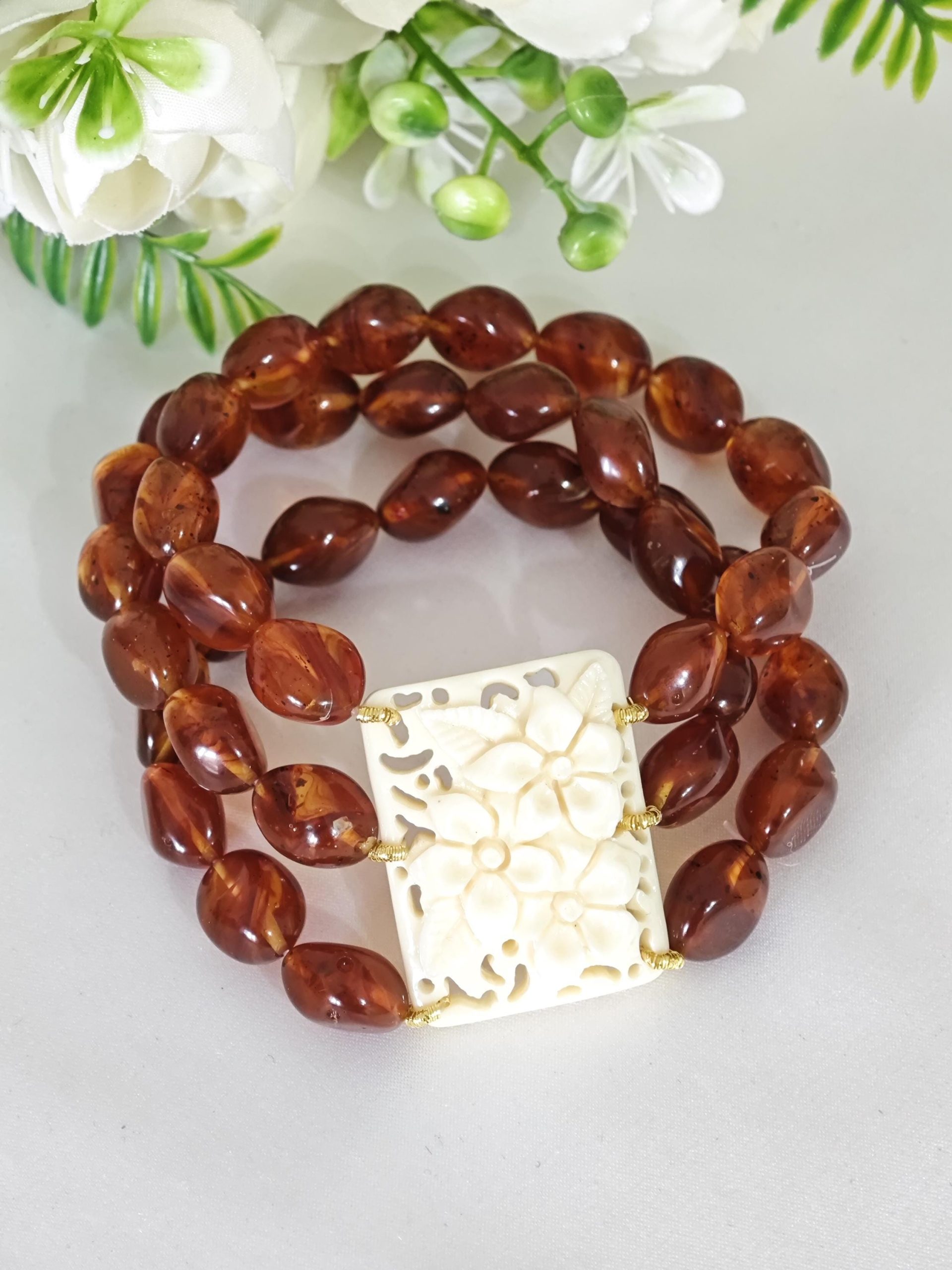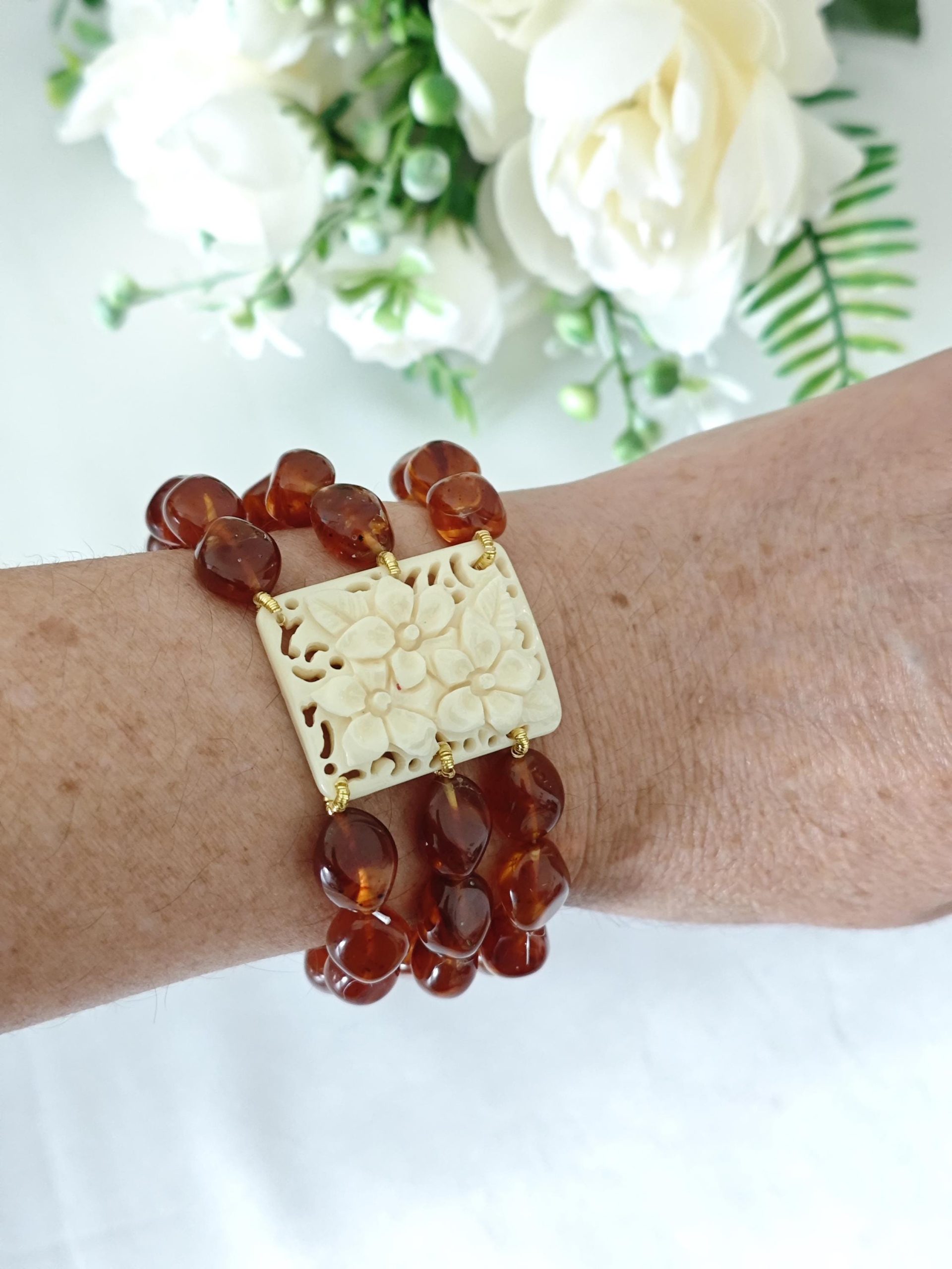 Bracciale elastico a 3 fili realizzato con perle resina colore ambra imitazione 12 mm e con elemento centrale rettangolare con fiori in resina avorio imitazione , 3,5×2,5 cm dimensioni.