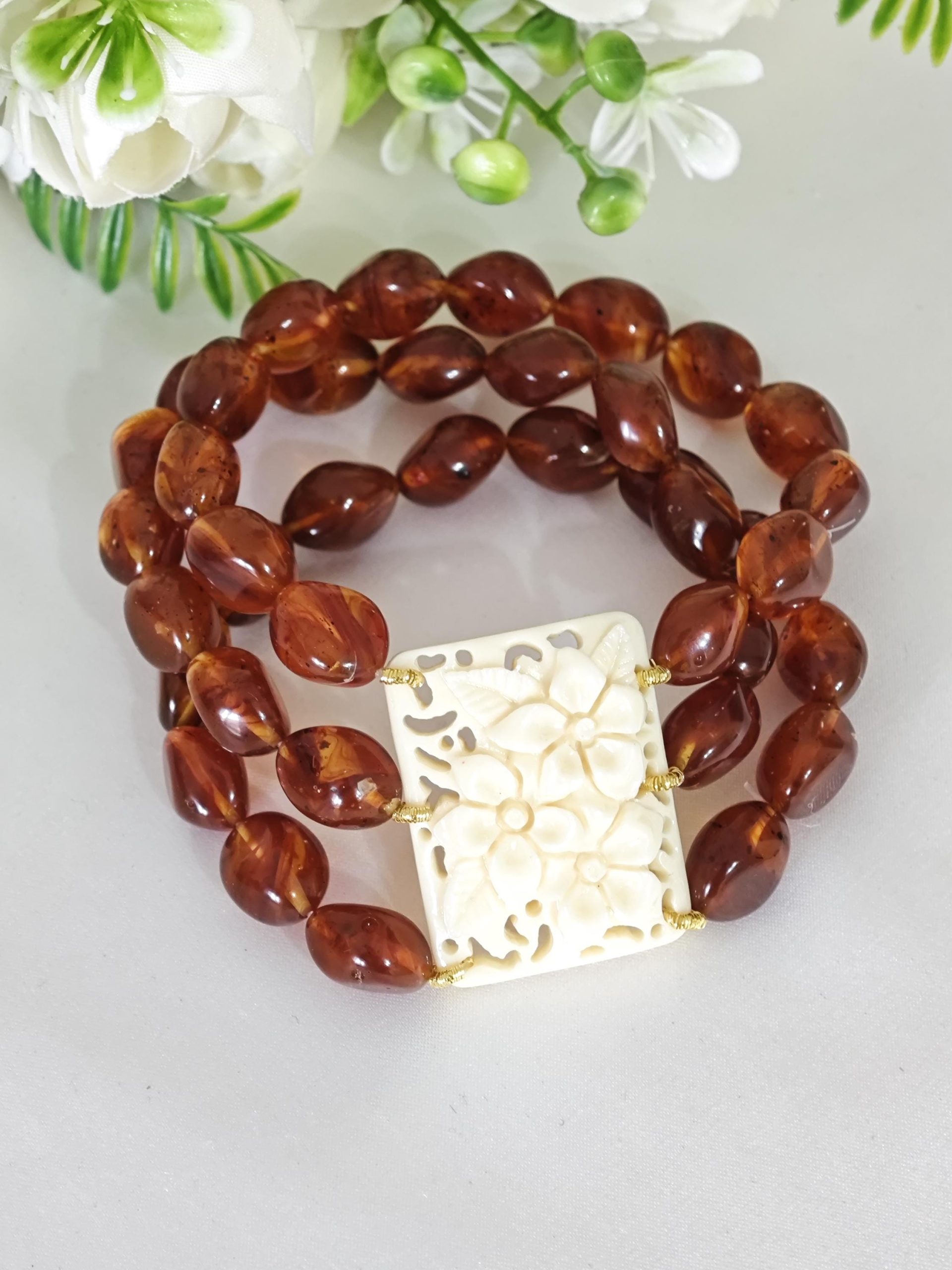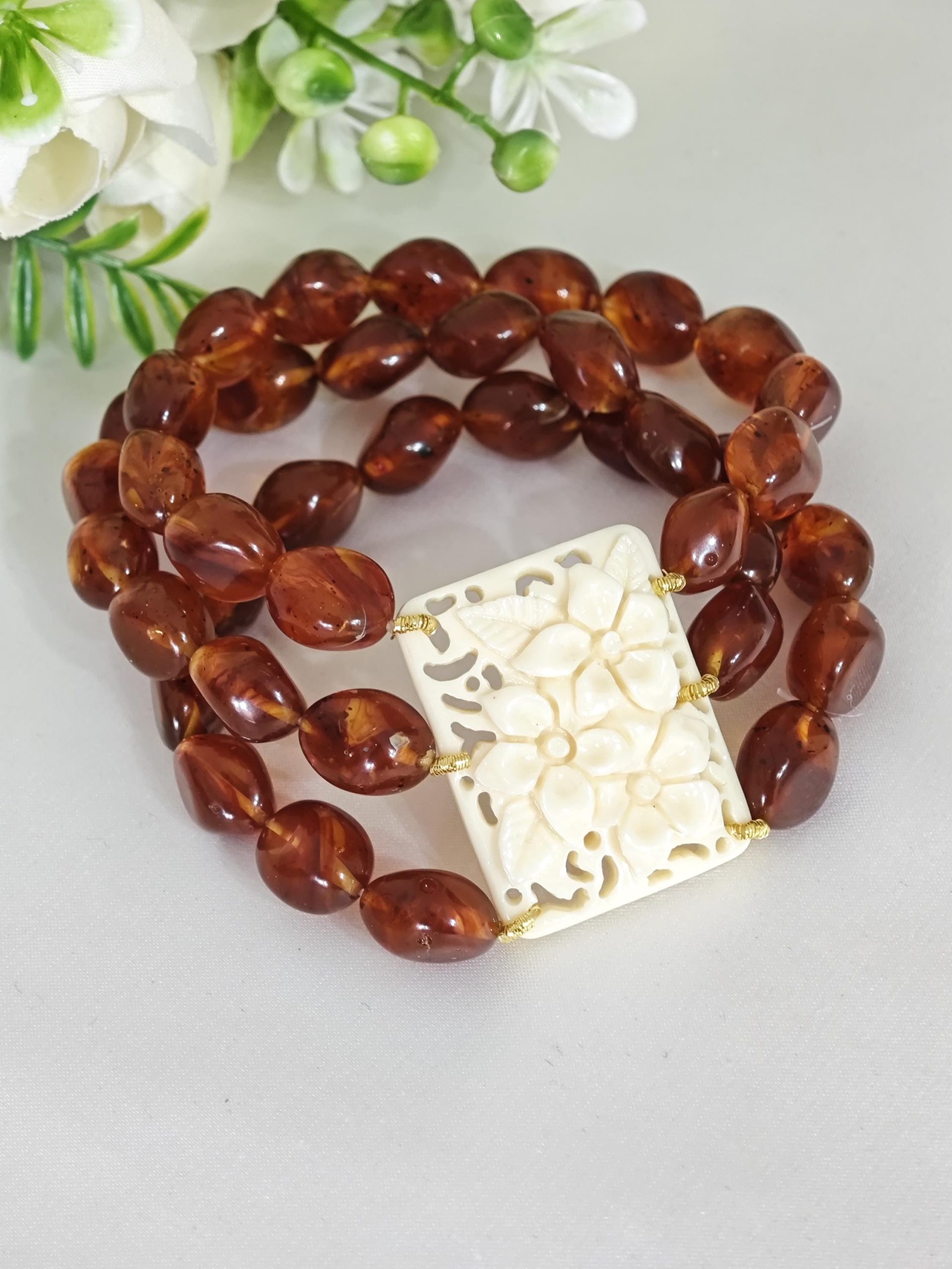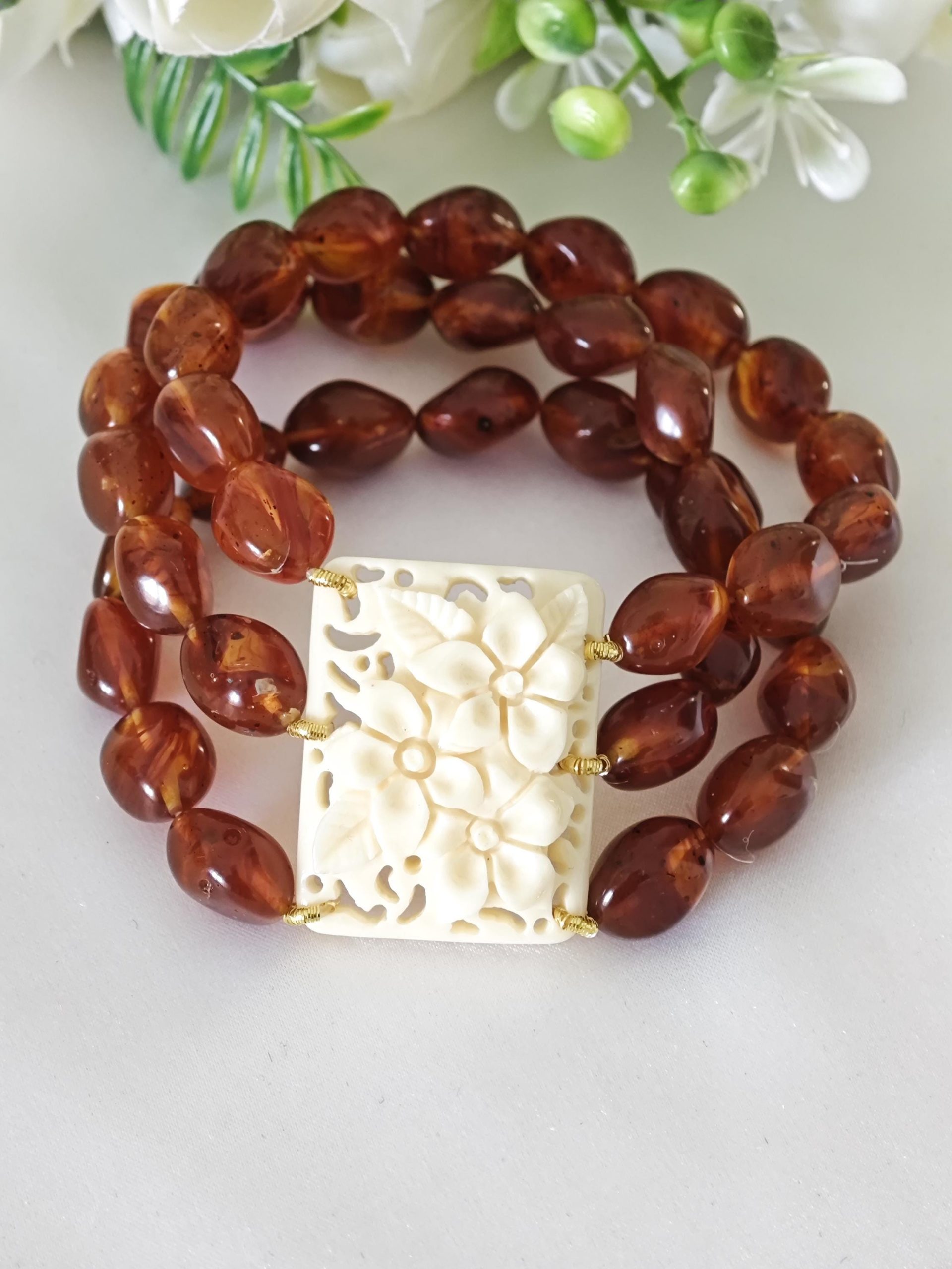 Bracciale perle ambra imitazione e fiori avorio imitazione , bracciale 3 fili elastico